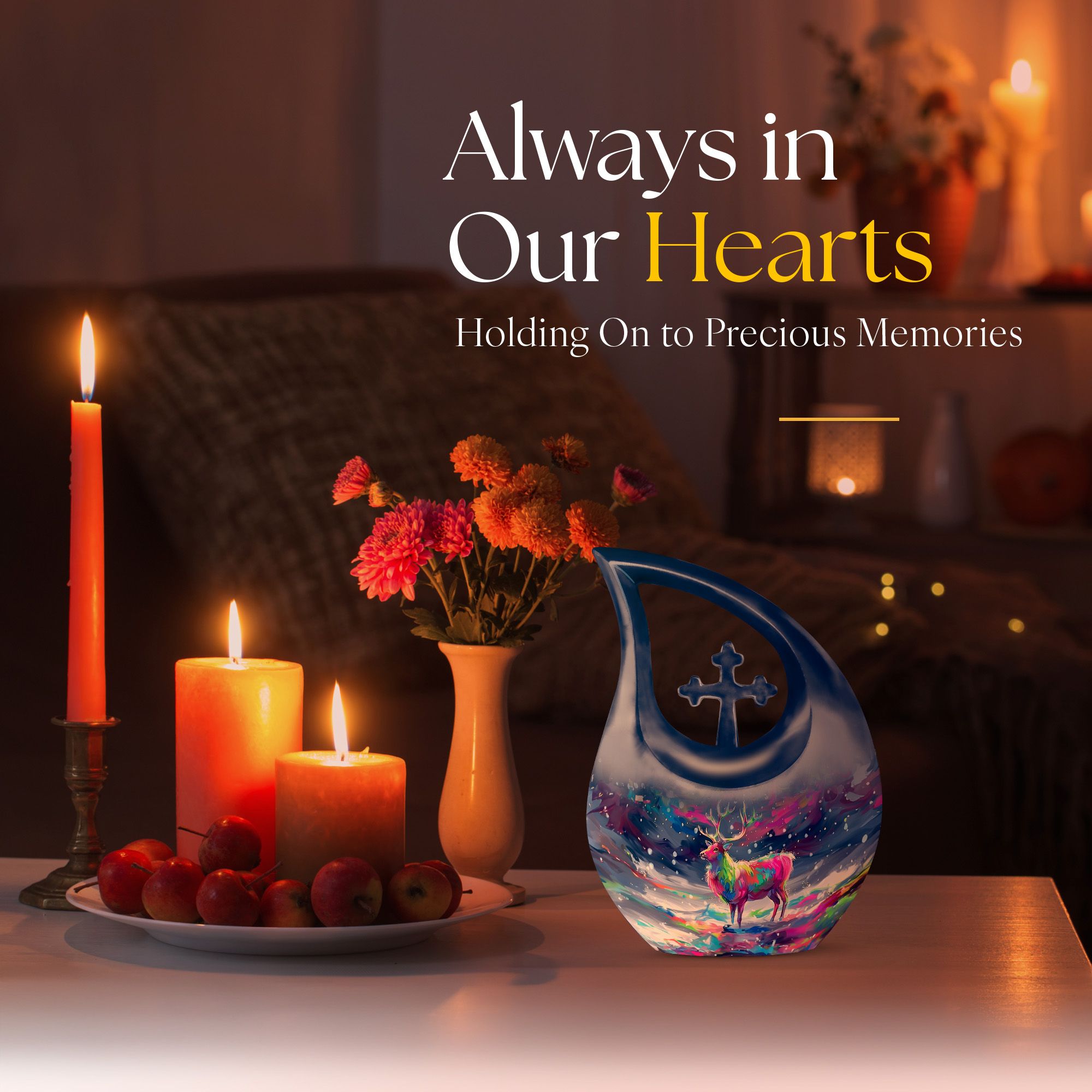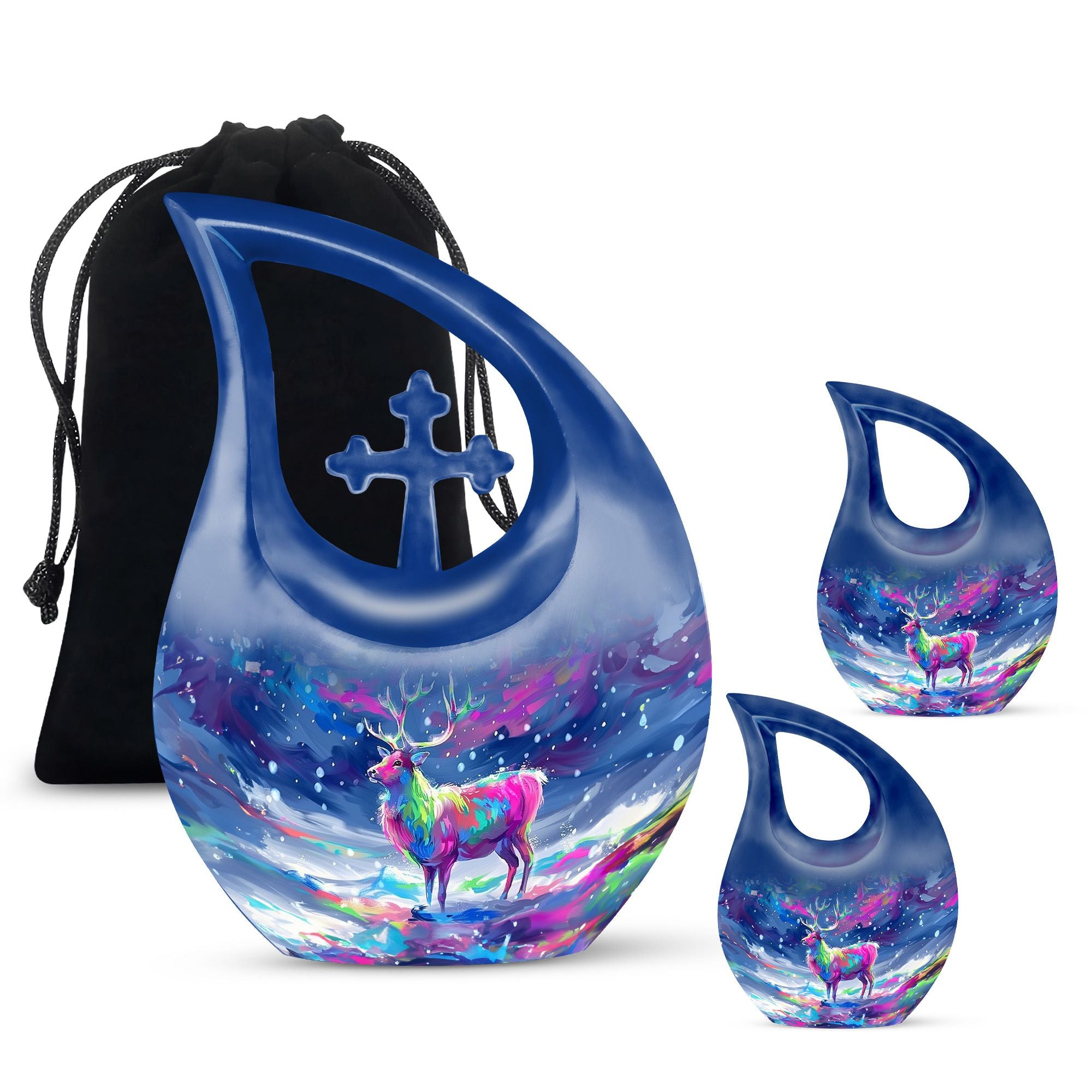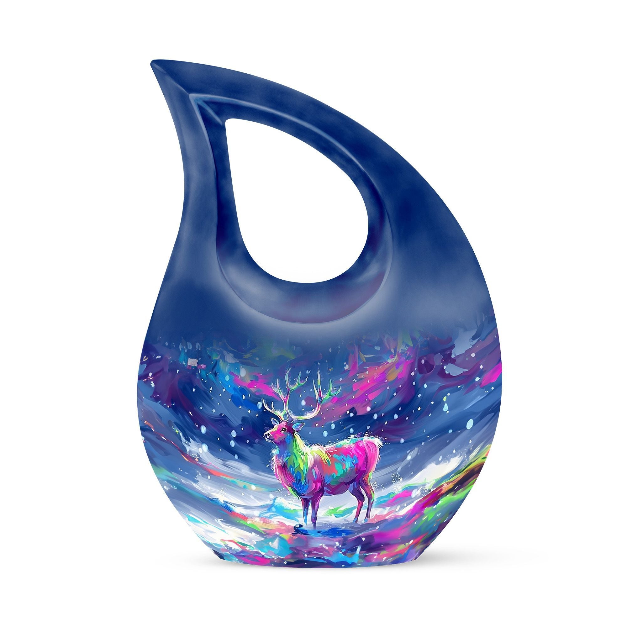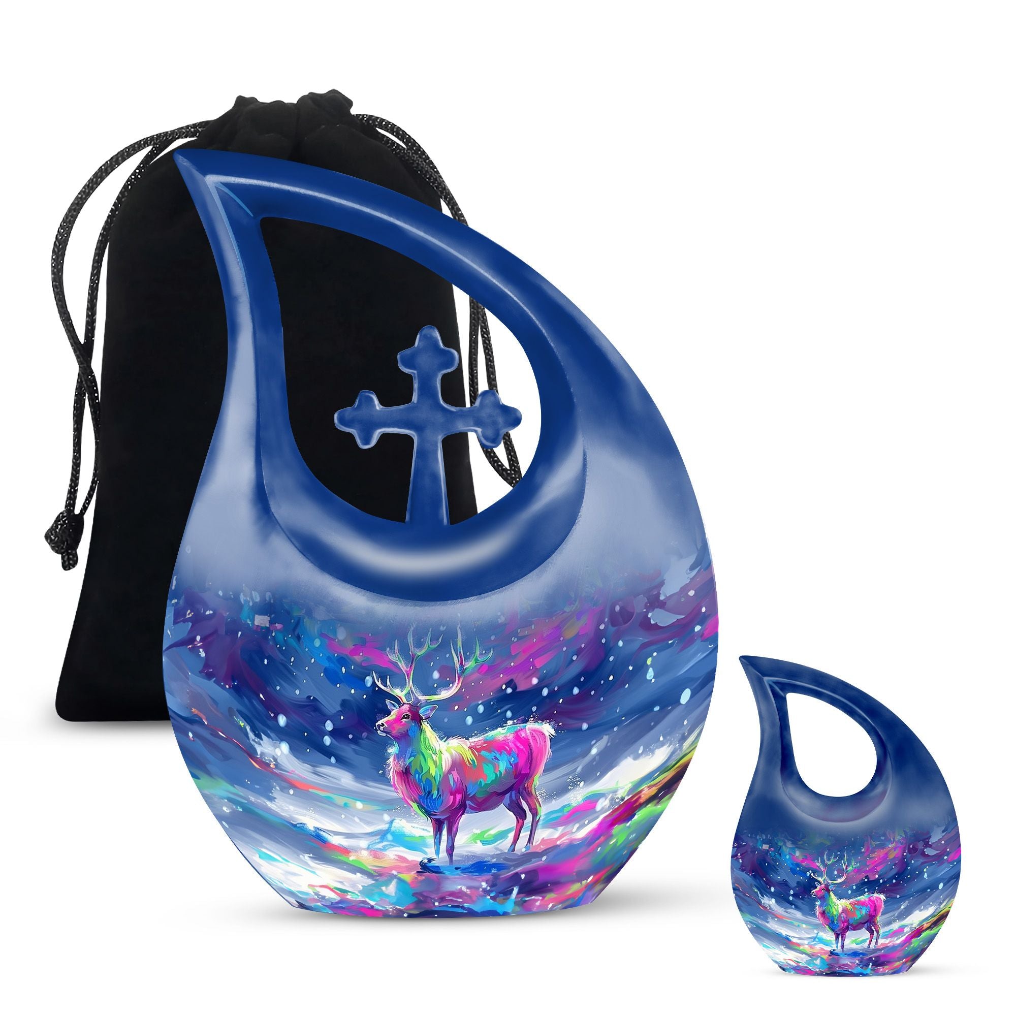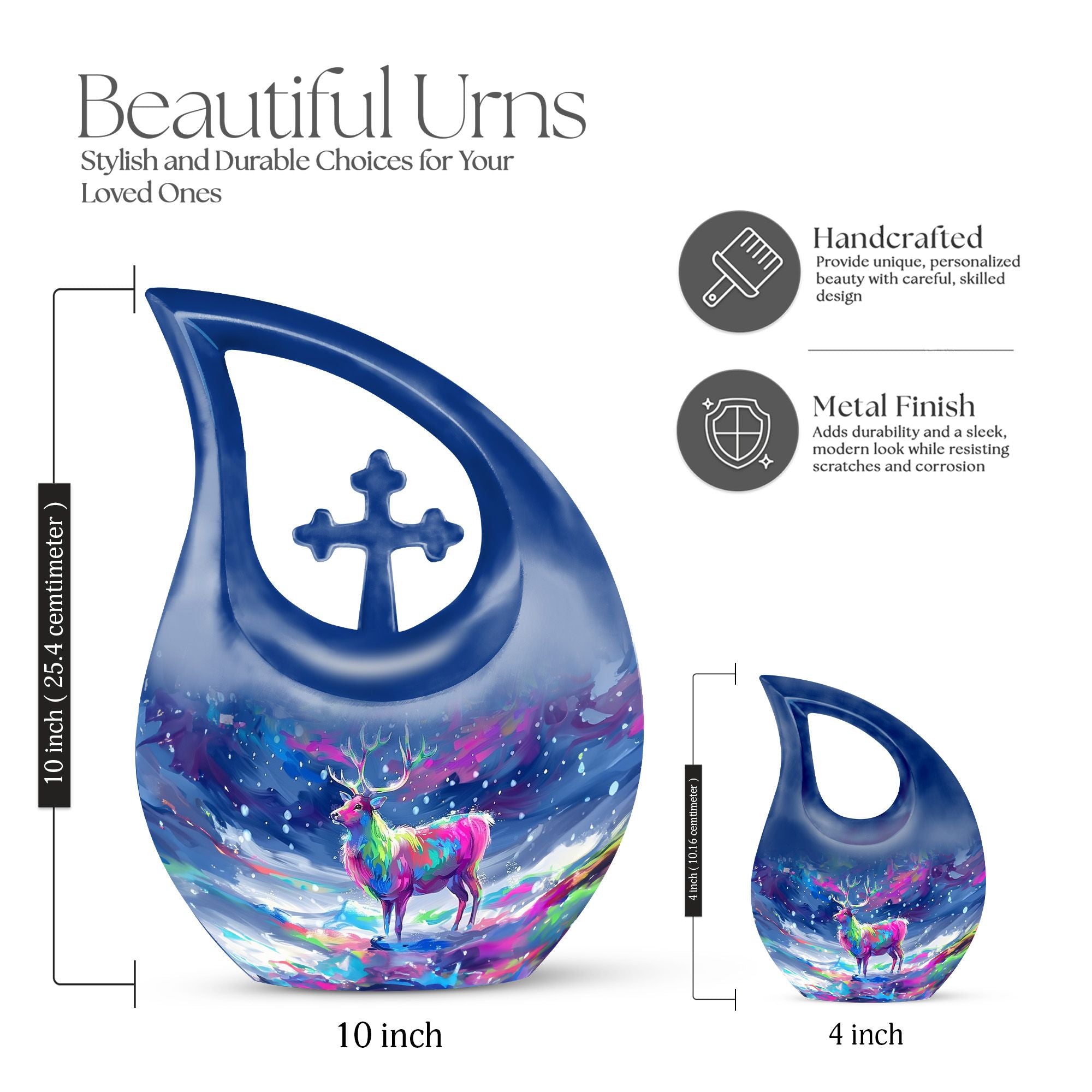 Introducing our Moose Walking Urn, one of the best urns for ashes. This 10-inch, large-sized urn is a beautiful tribute to your loved one. With its captivating Moose Walking theme, this urn offers a unique testament to the deceased's life. Made from high-quality aluminium, it stands tall at 10 inches in height and weighs 3.3 pounds. These urns have a Full-sized capacity of 200 cubic inches, making them not just beautiful, but also practically engineered. The Cross Drop aluminium urn comes with a velvet pouch, conveniently designed for secure containment of ashes. On top of that, you can personalize it with engraved names, ensuring your loved one's memory never fades. This is more than just a cremation container, a cremation box, or a burial urn; this is a an arresting memorial urn, designed for making remembrance special. Remember, choosing this Moose Walking urn means choosing a stunning and intimate token of love and memory.