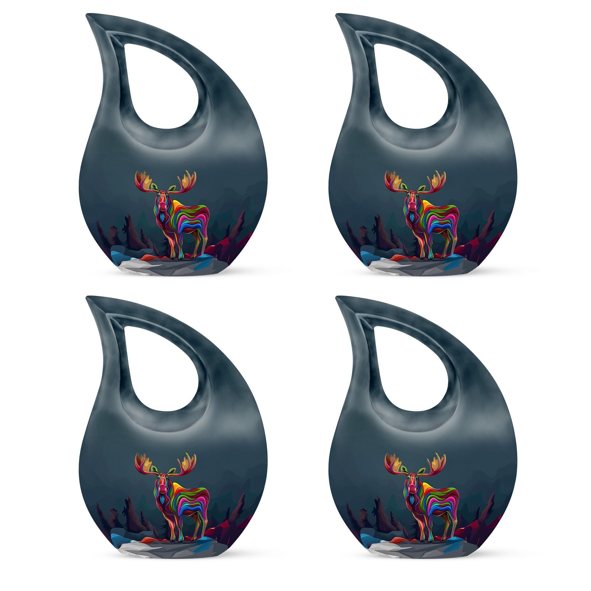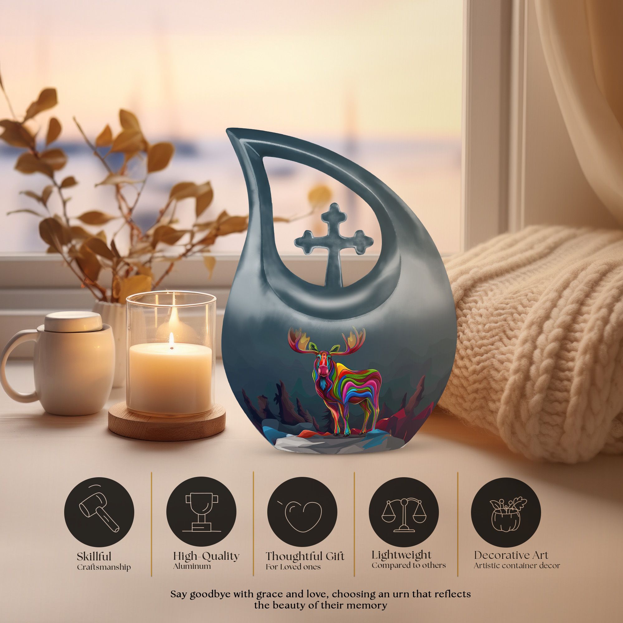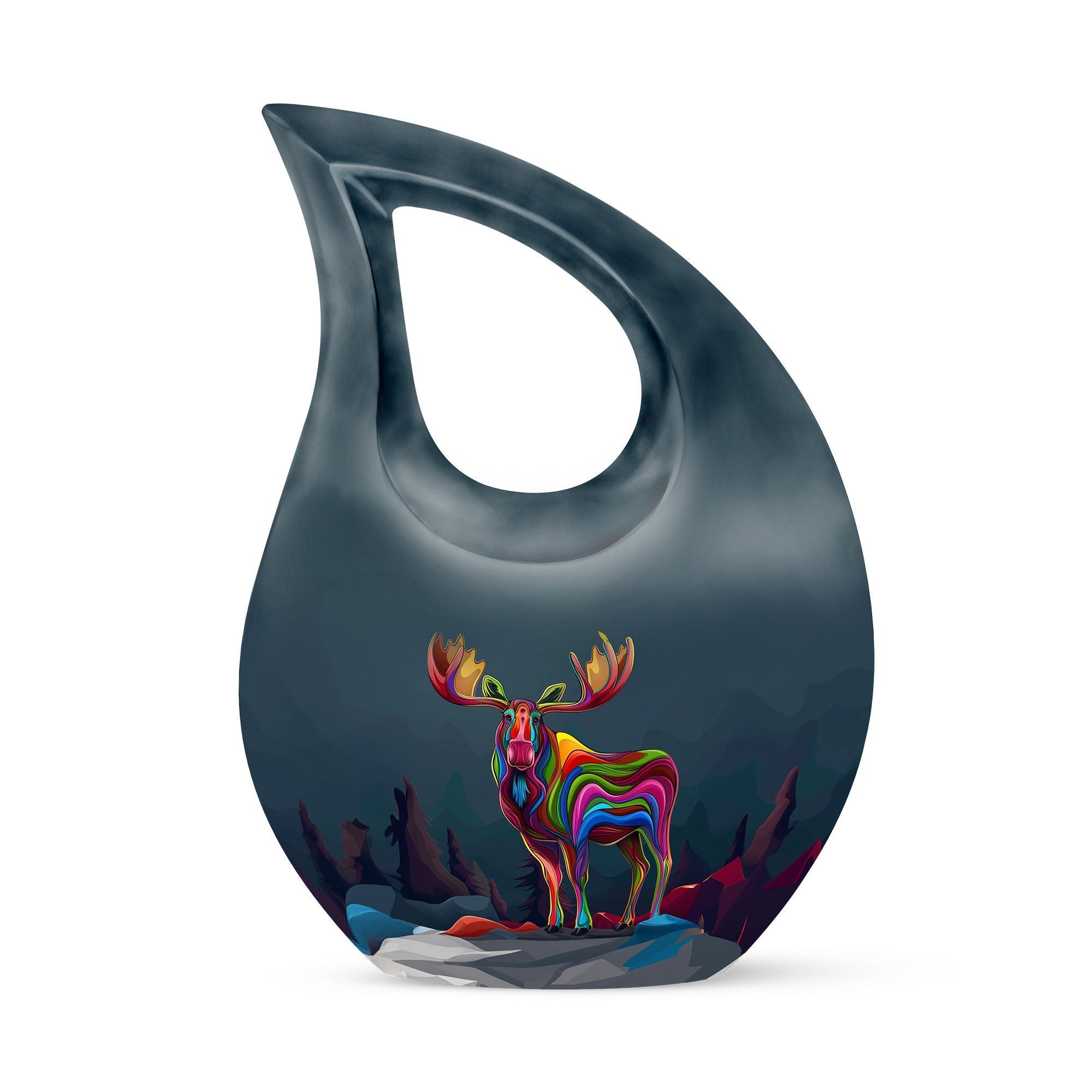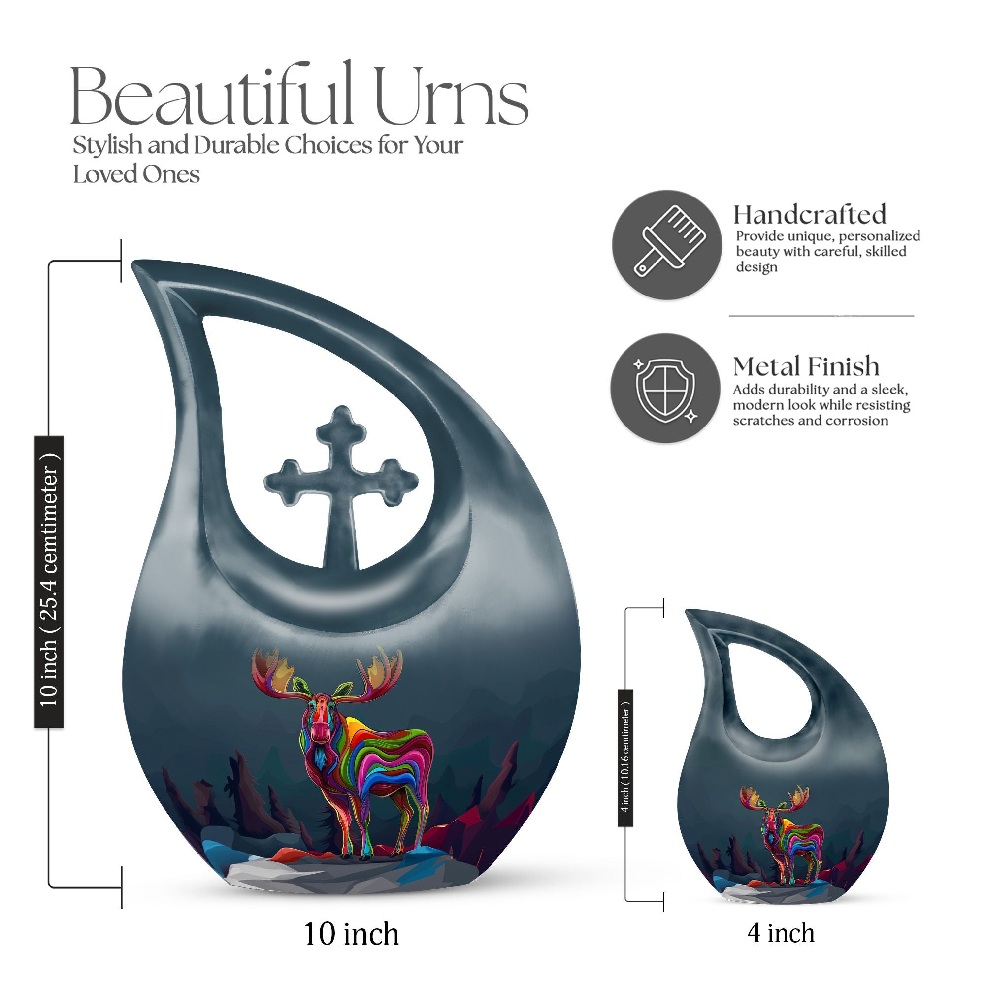 Honor the memory of your loved one with our Extra Large Moose Walking Urn, a distinctive piece that combines reverence with a touch of elegant design. This memorial urn, standing at a height of 10 inches, is crafted from premier aluminium, ensuring lasting sturdiness. Weighing 3.3 pounds, it can accommodate up to 200 cubic inches of ashes. The urn exhibits a unique 'Cross Drop' theme, portraying a peaceful moose walking scene, symbolizing gentle strength and serenity. This product offers customization; you can choose to personalize it with engraved names to create an intimate memorial. The urn comes with a velvet pouch for safe containment of the precious ashes. A consideration on metal cremation urns for those seeking durable, custom-made urns for ashes, this piece is certain to provide a warm and dignified home for your cherished memories. With its timeless charm, it is not just an urn for ashes but a tribute to life and love.