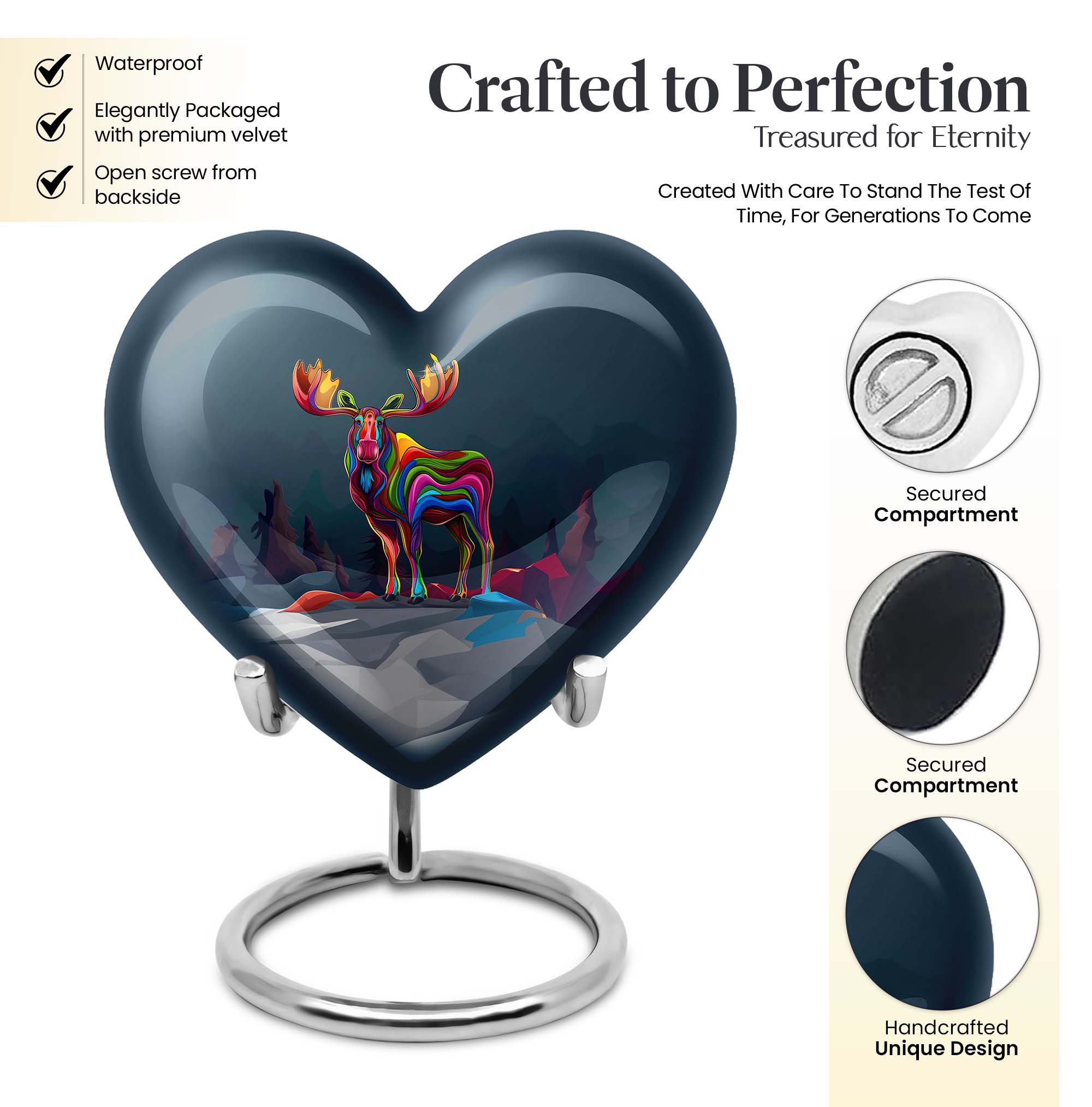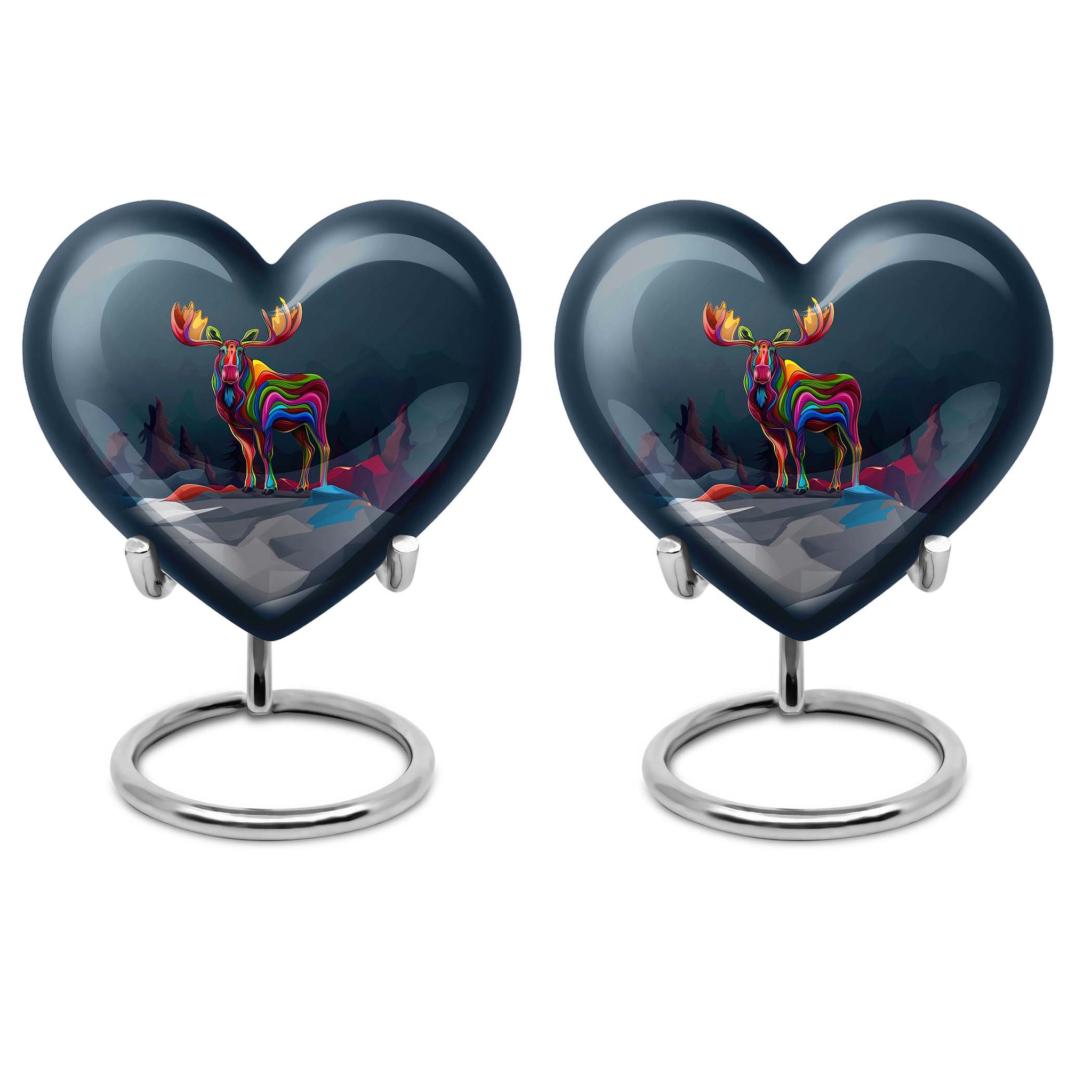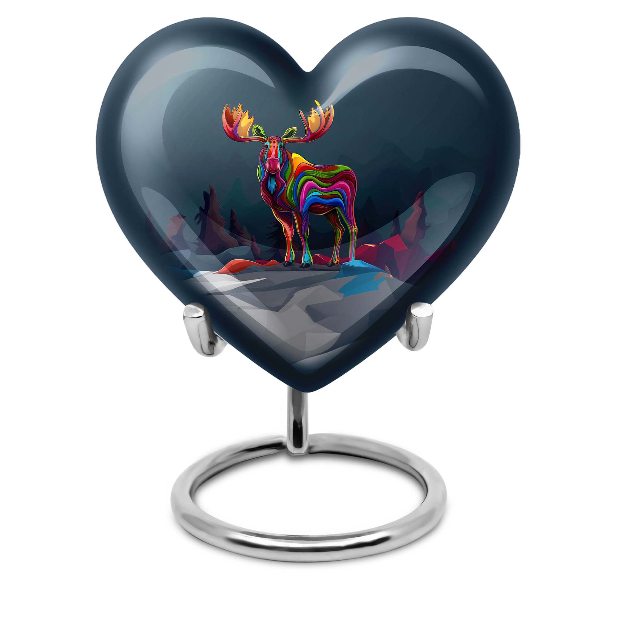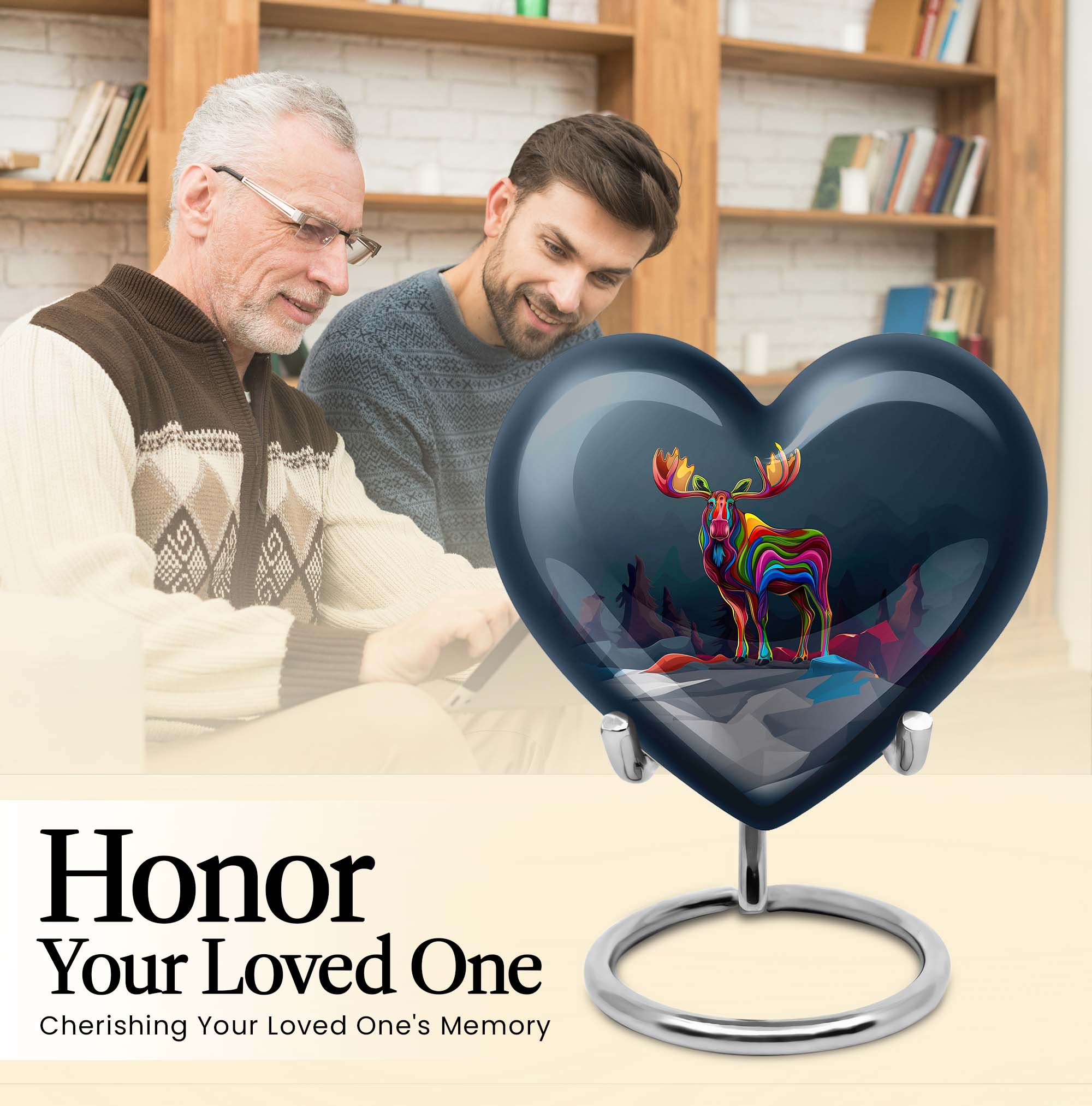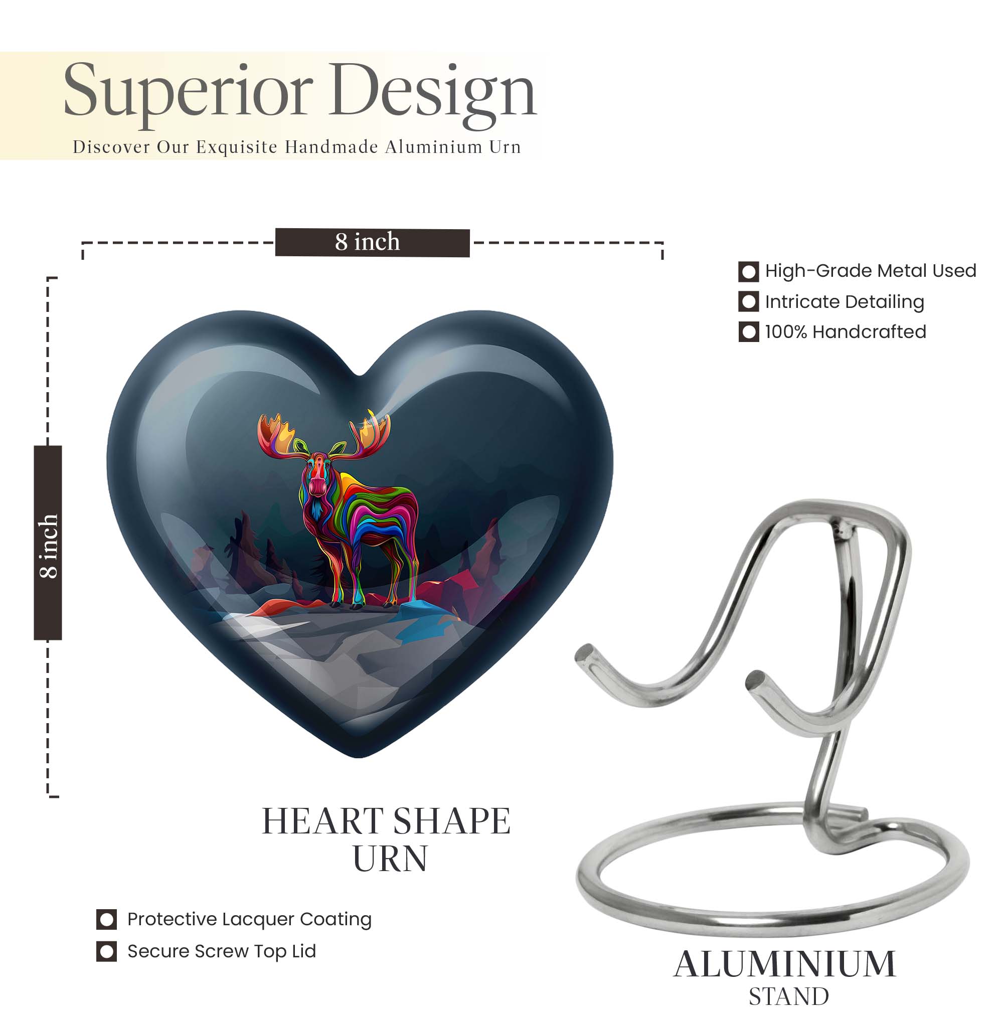 Introducing our warmhearted 'Moose Walking Urn' - a symbol of reverence and rememberance, ideal for any memorial ceremony. Crafted meticulously in robust aluminium, this large urn, towering at 10 inches, with a healthy capacity of 200 cubic inches, promises solemnity and durability. The weight of this item is a substantial 3.3 pounds, a testament to its sturdy construction. This sublime 'Heart Urn', noted for its enchanting abstract theme, comes with an added value; you can personalize it with engraved names, making it not a mere container, but a tangible memory of your loved ones. The package is complete with a velvet pouch meant for carefully preserving precious ashes. Keywords such as 'cremation urns for burial', 'cremation urn for dad' and 'burial urns for human ashes adult', highlight the universality of our product's usage. The 'Moose Walking Urn' perfectly aligns function and sentiment, becoming a wholesome tribute to the dear departed.