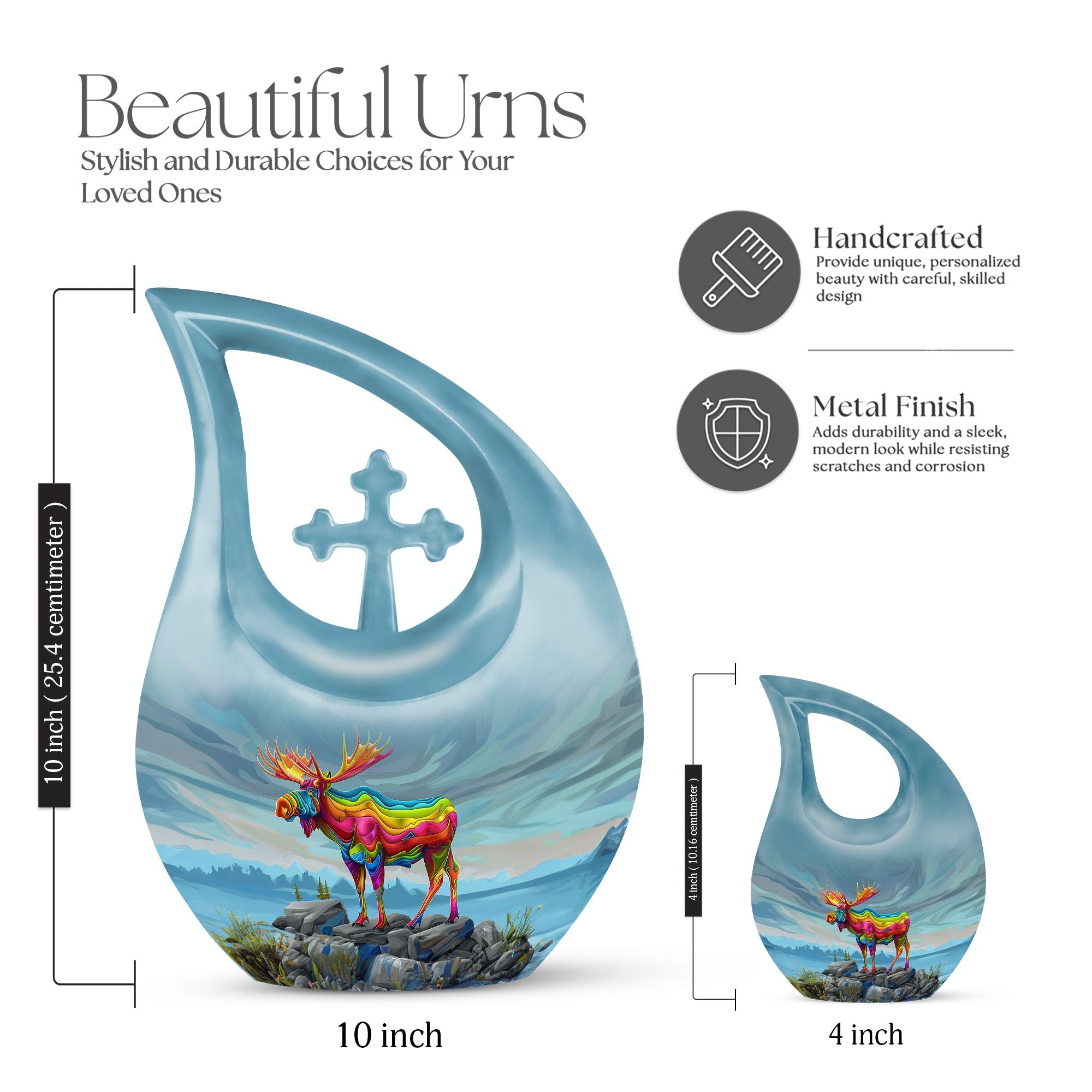 Crafted from premium aluminium, this 10 inch urn features a vibrant rainbow moose against a calming blue background, symbolizing courage, protection, and the enduring spirit of your loved one. Ideal for those looking for urns for cremation ashes or a cremation urn for adults, it includes a secure screw-top lid to keep ashes protected. For families who prefer shared remembrance, it pairs perfectly with cremation keepsakes urns, urn cremation keepsake options, and small urns for cremation ashes.