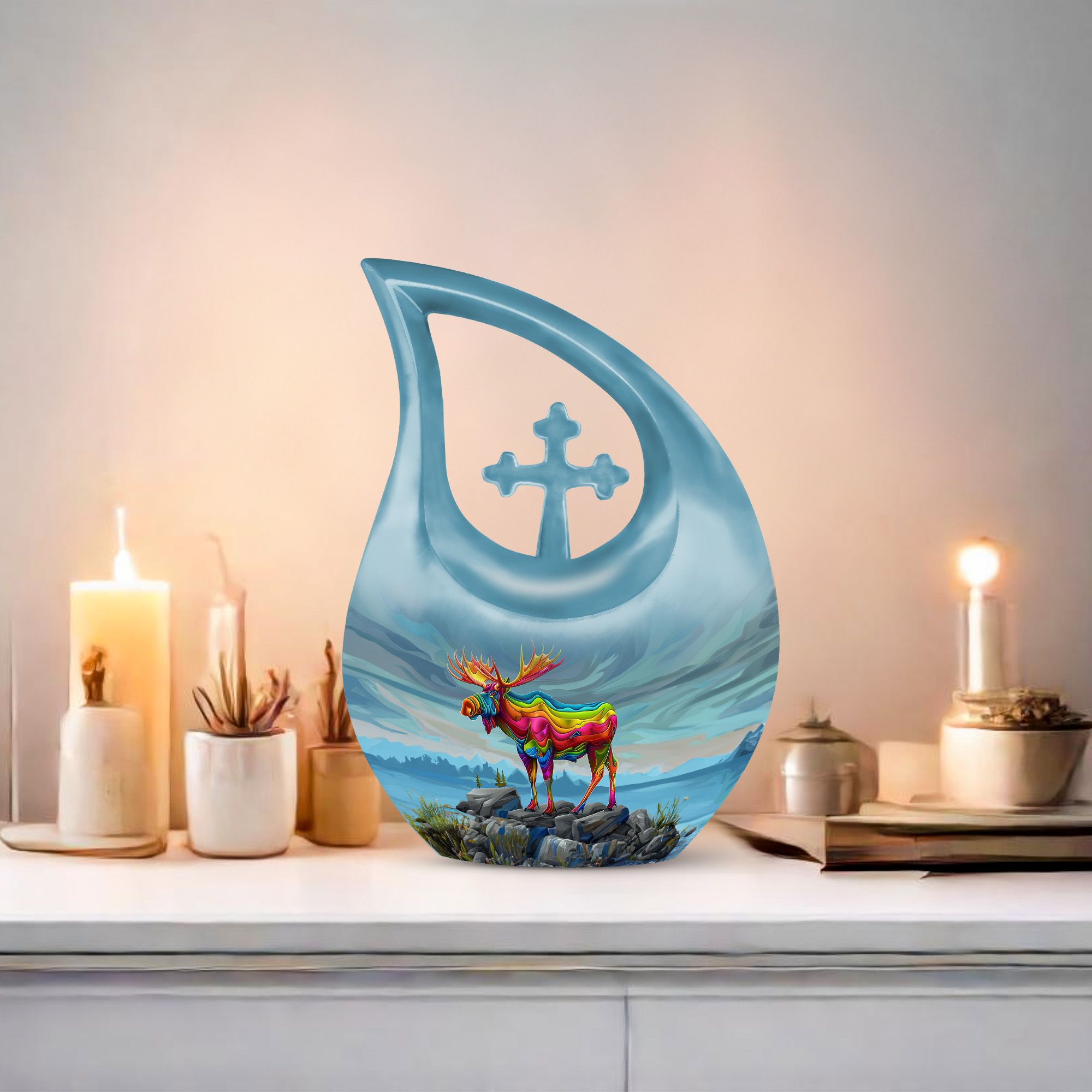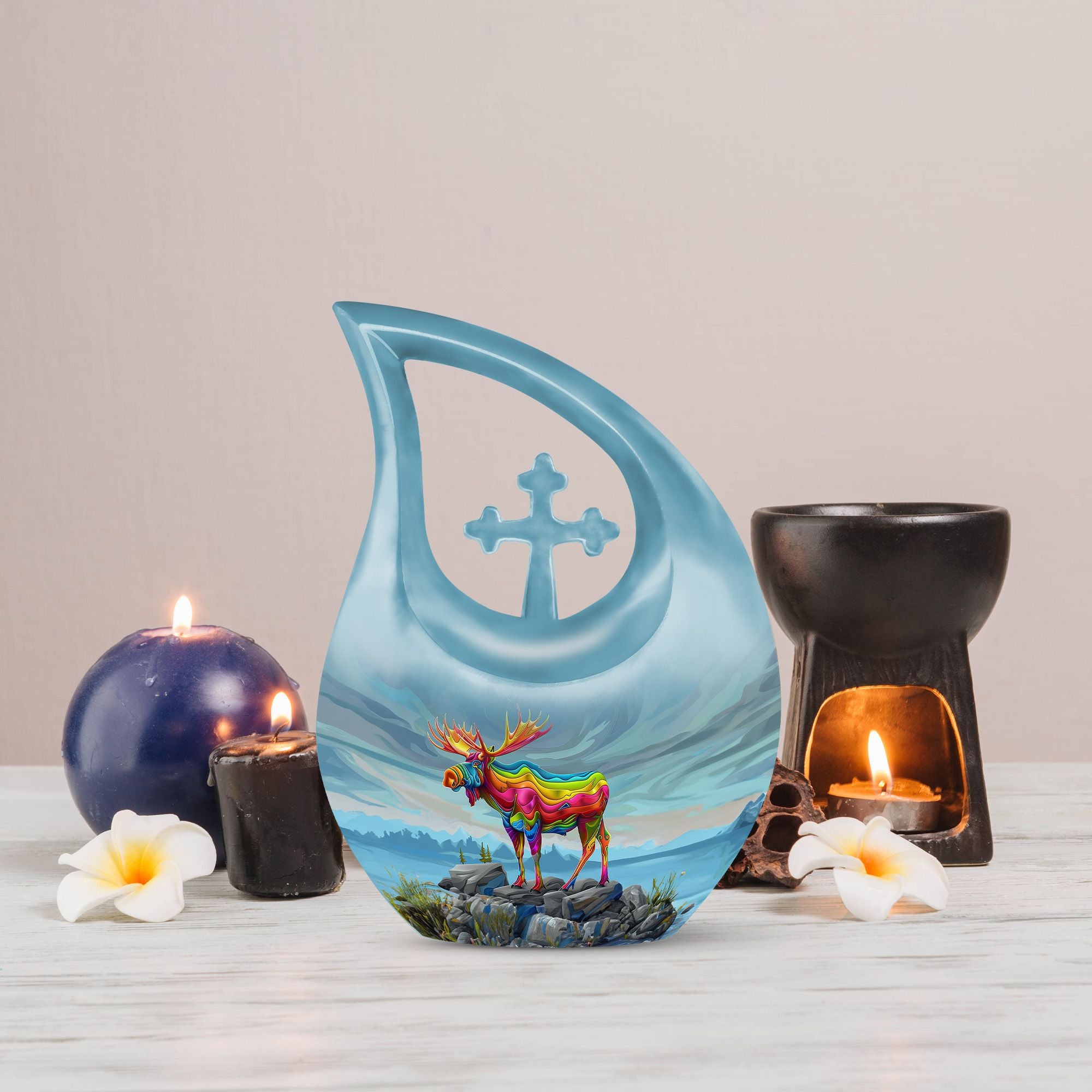The Rainbow Moose Design Cremation Urn offers a heartfelt and symbolic way to honor a loved one, blending strength and serenity in its beautifully detailed artwork. Families seeking cremation urns for ashes or cremation urn mom options will find this design both meaningful and comforting, providing a peaceful tribute for any adult.