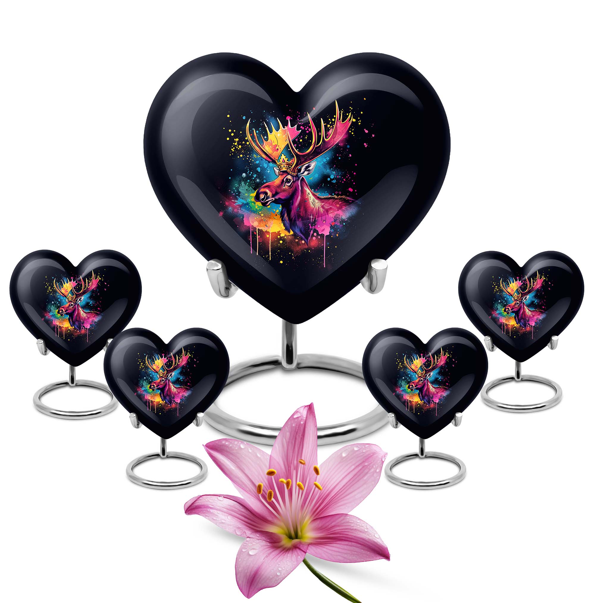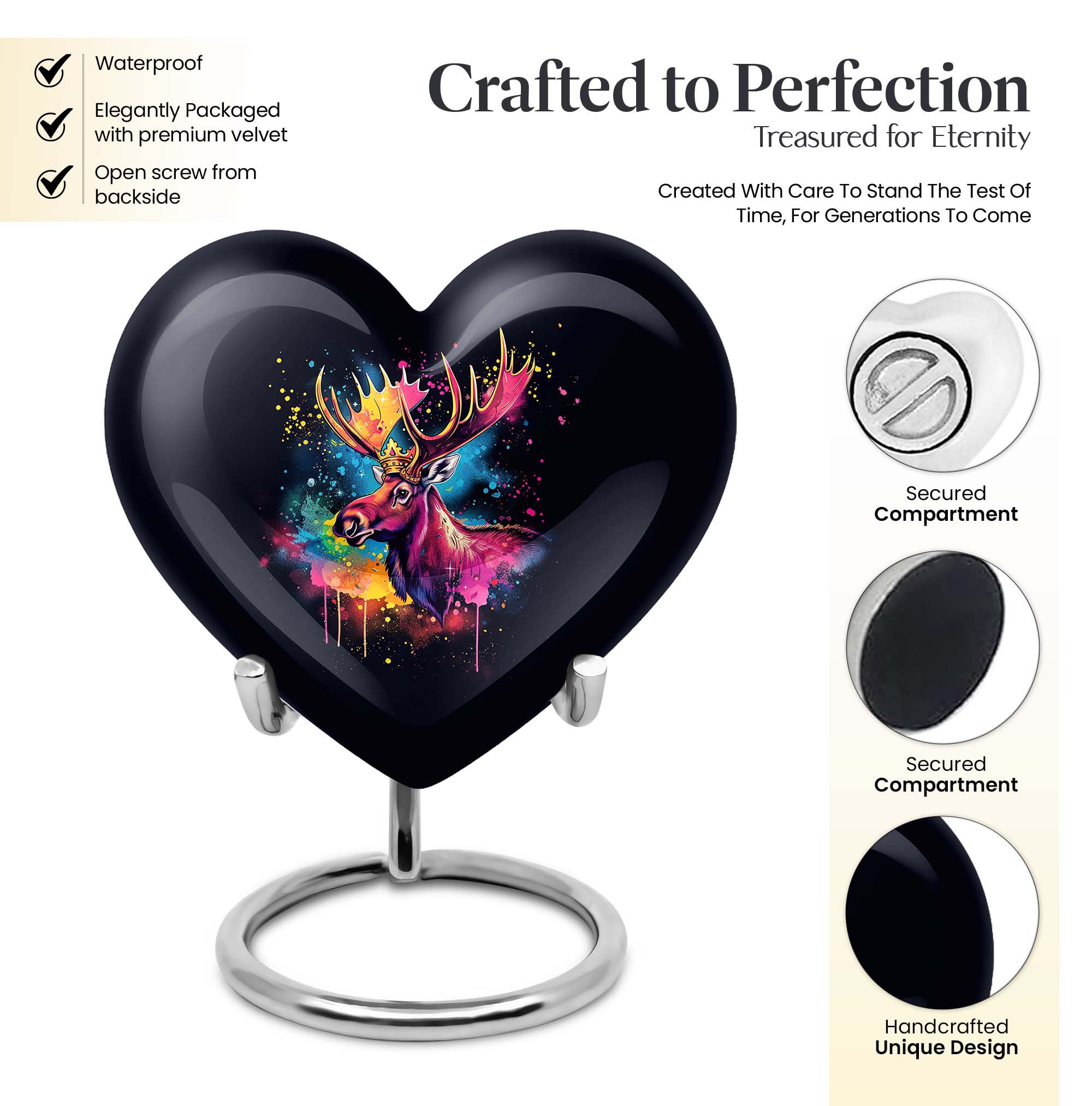 This captivating 10-inch Moose Walking Urn is not just a memorial tool, but a symbol of endless love and memories. Crafted with meticulous detail, this piece boasts a unique Abstract theme, adding an artistic touch to its overall aesthetic. It's more than just an Urn; it's a large, tangible symbol of remembrance. Weighing 3.3 pounds and standing 10 inches tall, it finds balance between size and functionality. Made from high-grade Aluminium, it promises durability and elegance packaged into one. Its heart shape provides a tender touch, showcasing the affection and warmth shared with your loved ones. This urn has a capacity of 200 cubic inches, ample space for safekeeping the ashes. The package also includes a velvet pouch for the containment of ashes, adding an extra layer of protection. With the customization option, you can personalize it with engraved names, bringing a more intimate connection to this lasting memorial. Ideal for those seeking cremation urns for mom or personalized urns for human ashes adult, this product indeed creates a memorial that will stand the test of time.