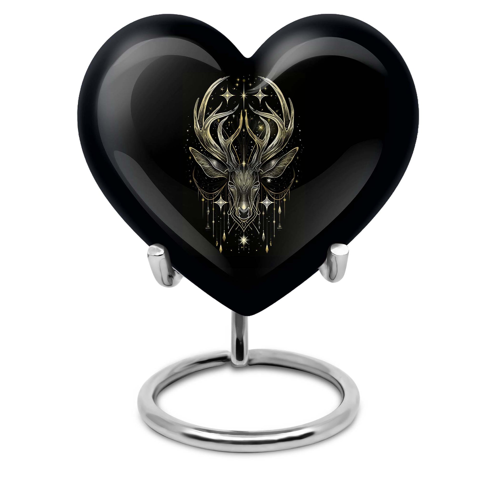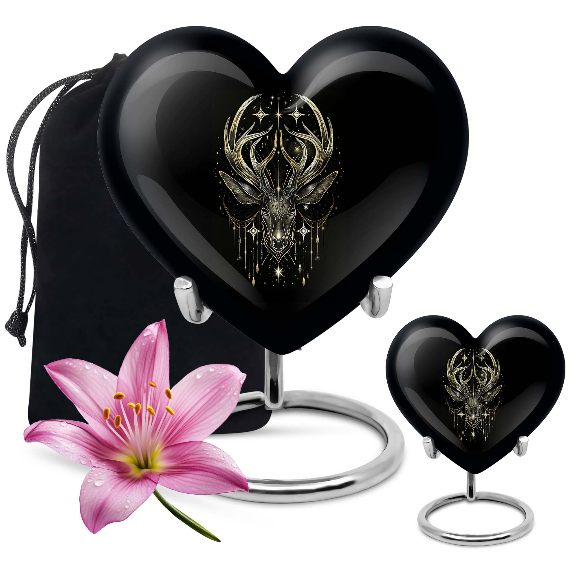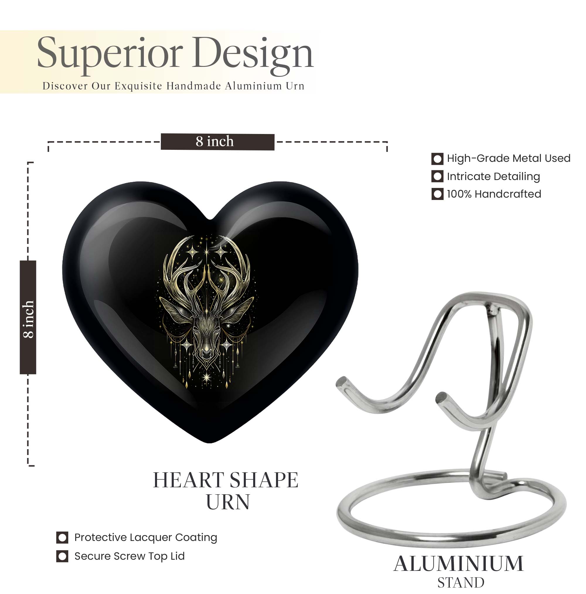 This exceptional moose walking urn creates a heartfelt tribute to your departed loved ones. Serving as a prominent burial urn for ashes for adults, it makes a poignant statement with its abstract theme and heart shaped design. A large urn measuring 10 inches in height, it has an ample capacity of 200 cubic inches making it perfectly suited for adult human ashes. The urn is crafted from superior material, aluminium, that ensures its durability and longevity. Weighing 3.3 pounds, it is stable and resilient. The urn also offers customization options where you can personalize it with engraved names, helping in creating a more bespoke memorial. One of the standout aspects of this piece is its intricacy in design that evokes memories and emotions. This cremation urn package includes a velvet pouch for containing the ashes securely. Ideal for those in search of memorial adult urns or cremation urns for dad. An uncommon, exquisite, and cherished choice for those commemorating their loved ones.