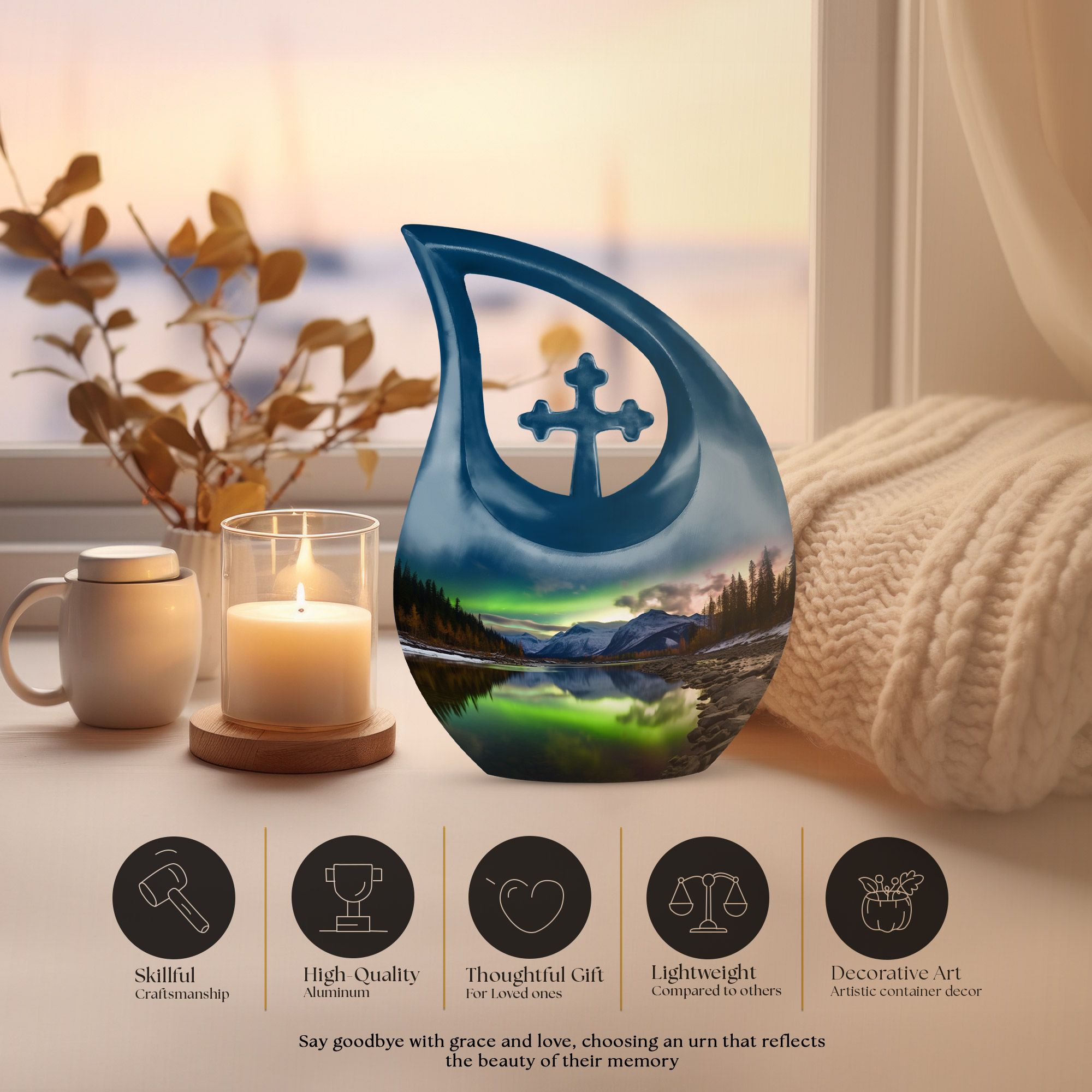 Crafted from premium aluminum, this urn adult cremation piece combines elegance and durability. The soft, scenic artwork portrays the harmony of nature — mountains, sky, and still waters — offering comfort and serenity. Suitable for cremation urn adult ash or cremation urn human ash, this urn provides a dignified resting place for loved ones. Families can also pair it with cremation keepsakes ashes or cremation urns adult women for smaller memorials and shared remembrance.