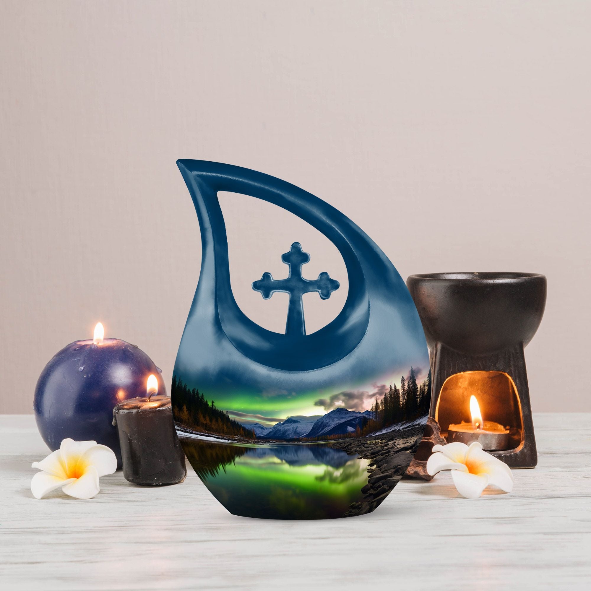 The Mountain Lake Cremation Urn for Human Ashes reflects the tranquility and strength of nature — a peaceful tribute for a beloved mother, father, or family member. Its calming design mirrors a serene mountain lake at sunset, reminding us that love, like water, endures and flows endlessly. Ideal for families seeking cremation urns for adult ashes small or human cremation urns adult, it beautifully captures both peace and remembrance.