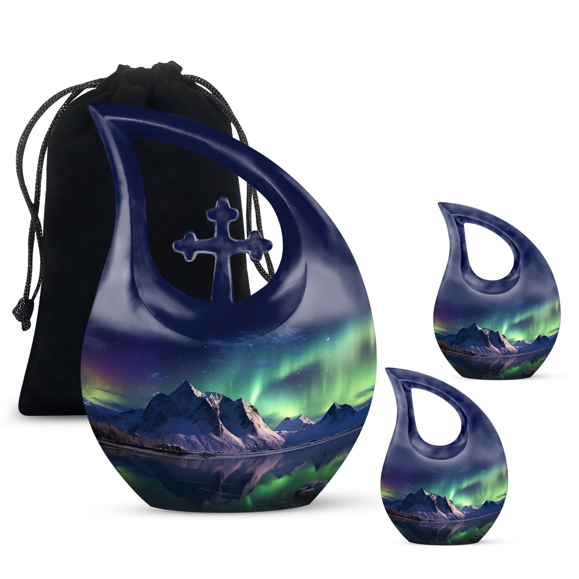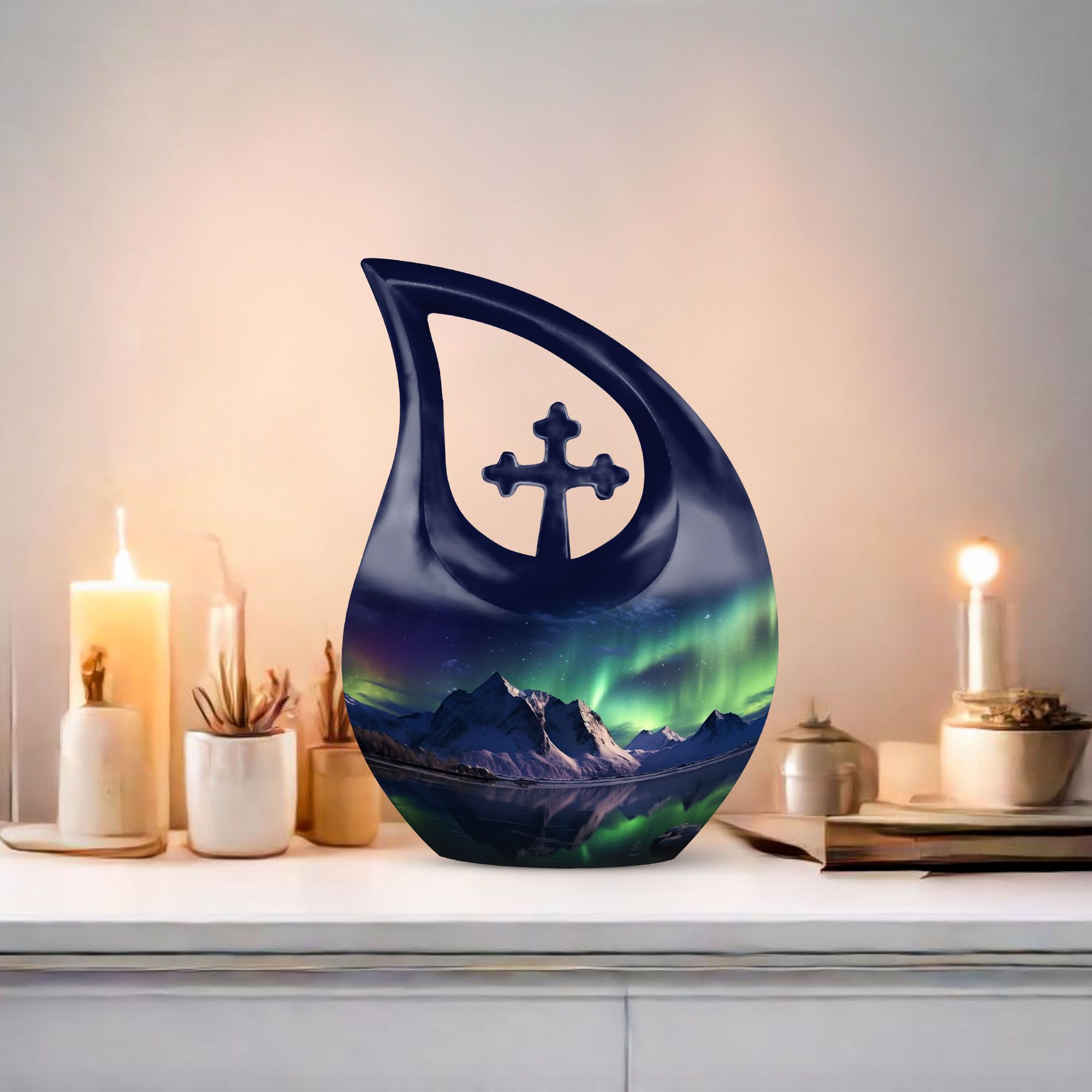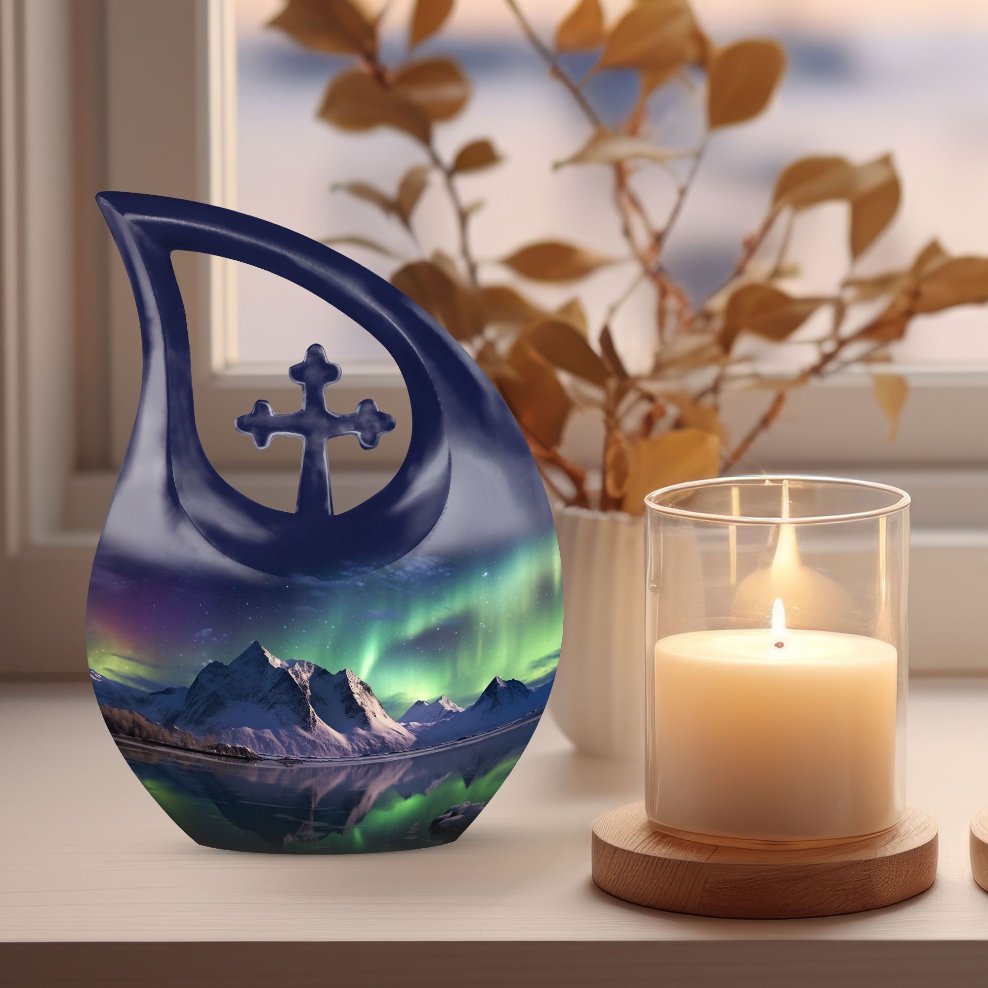 The Snowy Mountain Memorial Urn for Female captures the awe-inspiring beauty of the Aurora Borealis glimmering above tranquil mountain peaks. This stunning urn for cremation represents serenity, love, and everlasting remembrance — a heartfelt tribute to a soul that continues to shine bright beyond the horizon. Perfect for home memorials or burials, it provides families a comforting symbol of eternal light.