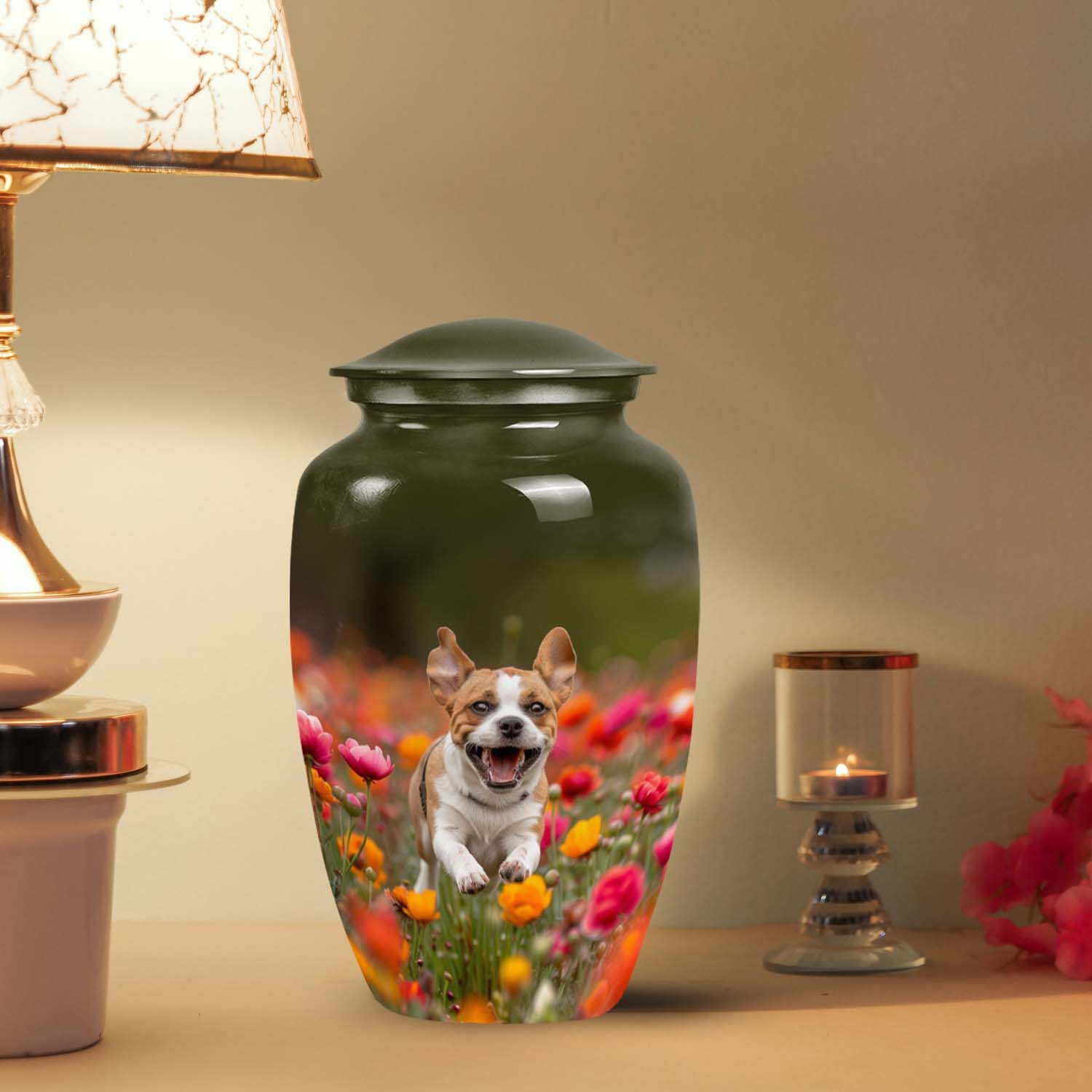 Honor the memory of your beloved Beagle with this beautifully crafted pet cremation urn. Featuring a heartwarming image of a joyful Beagle running through a vibrant field of flowers, this urn captures the spirit of happiness and loyalty that your pet brought to your life.