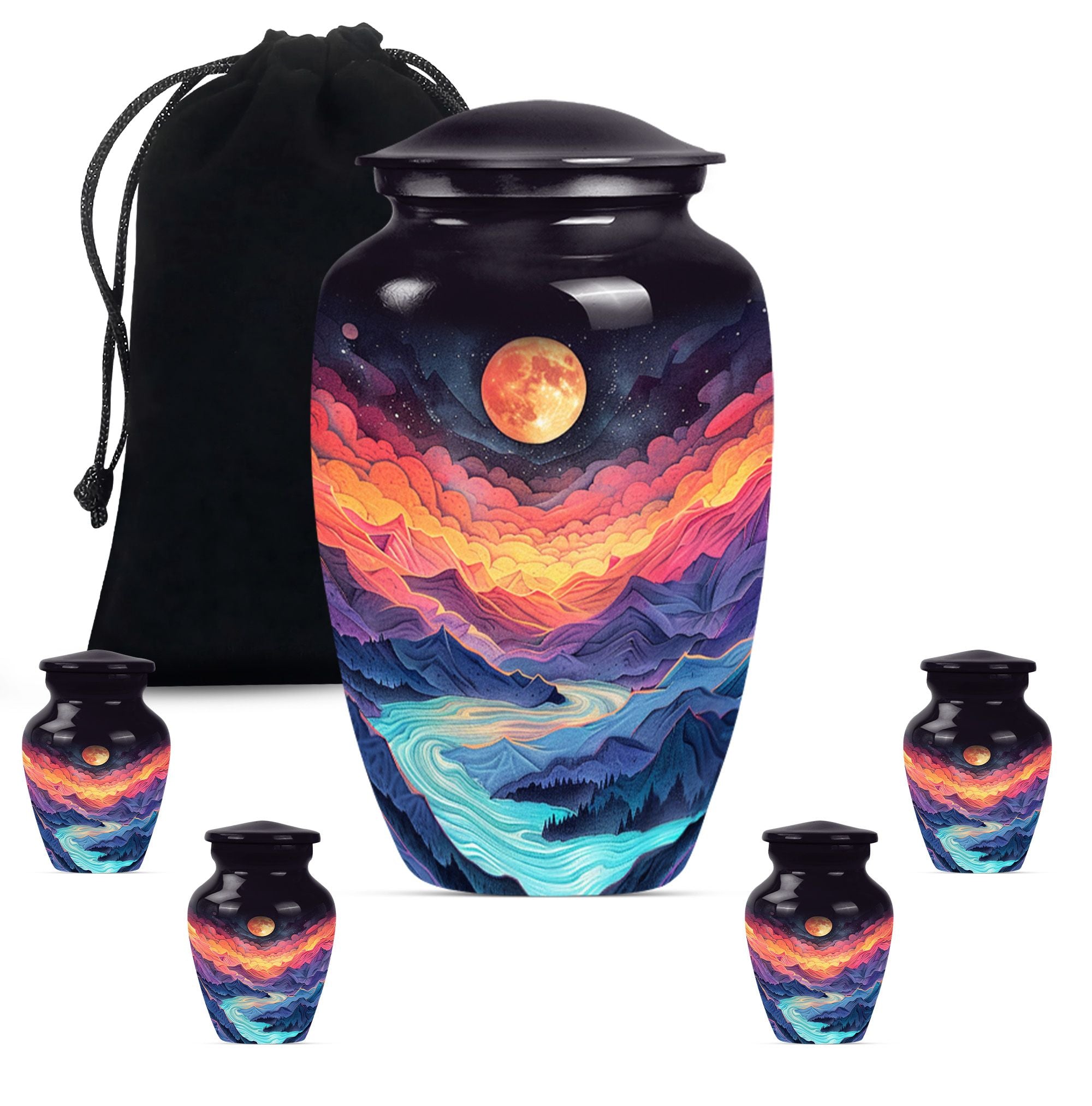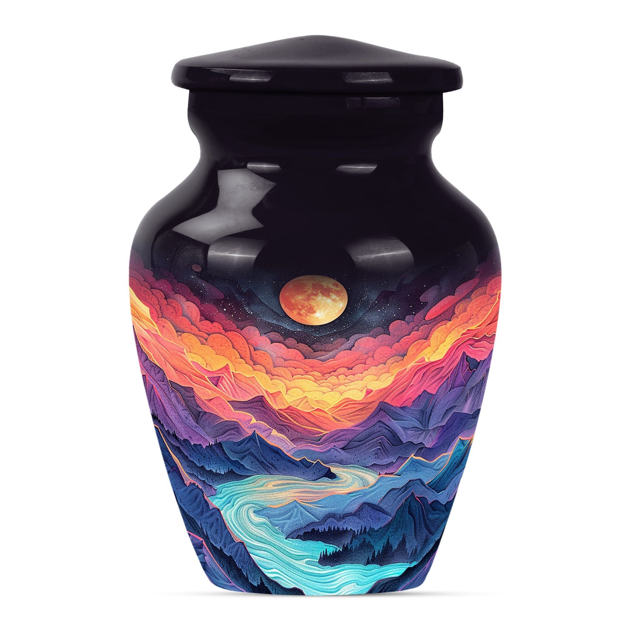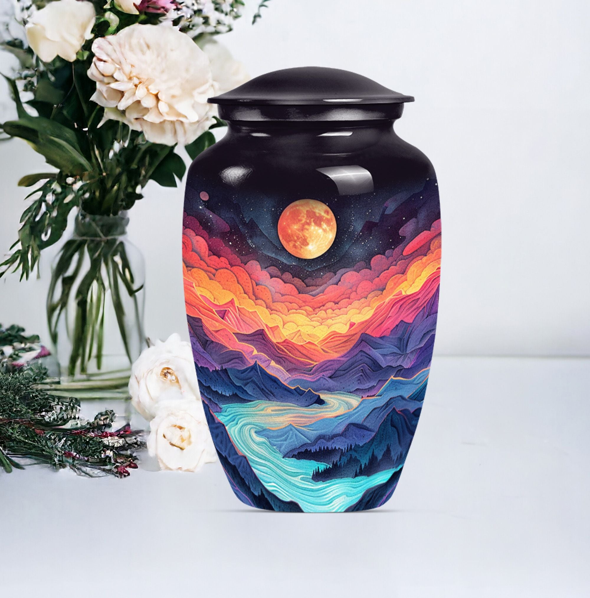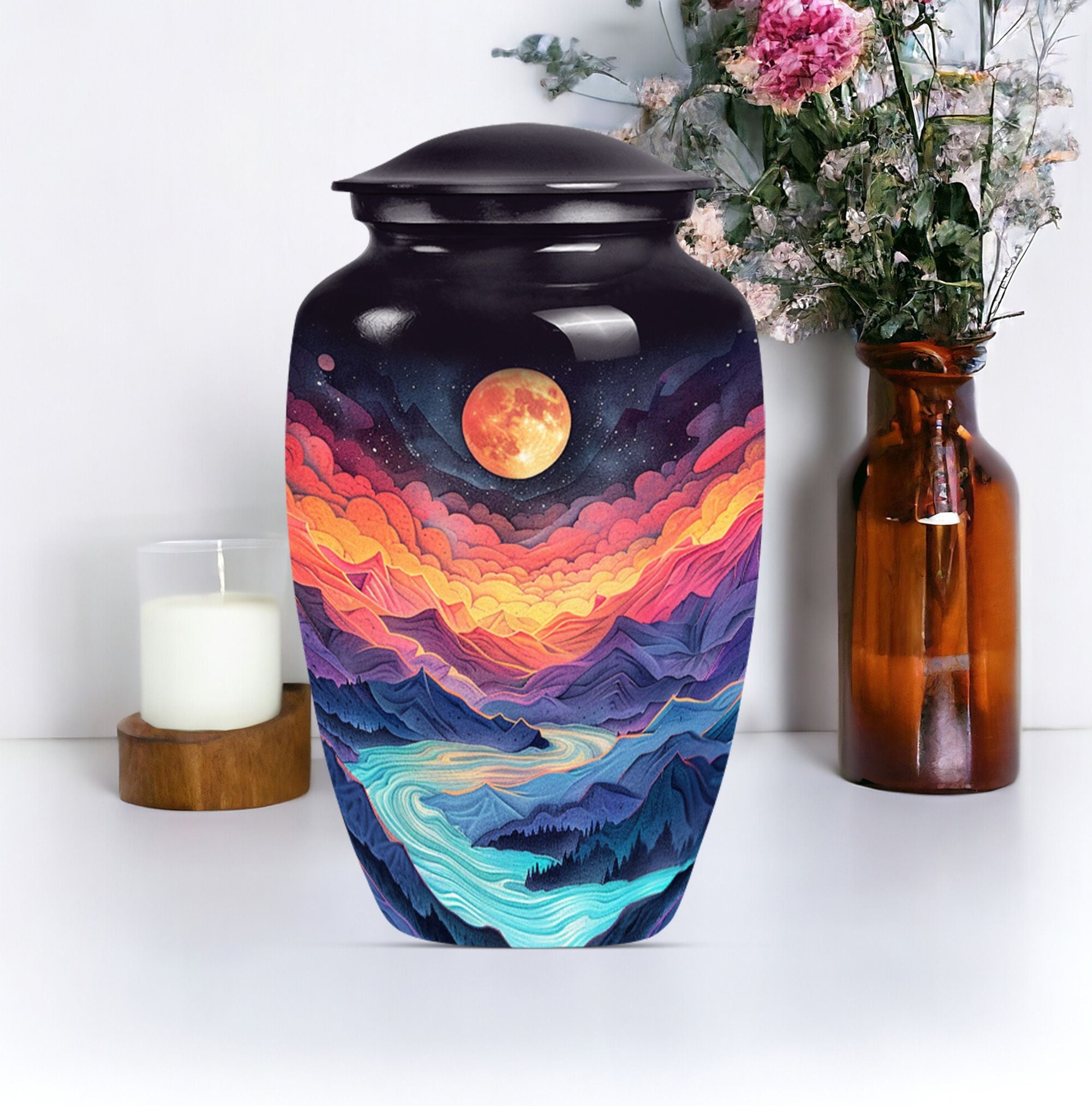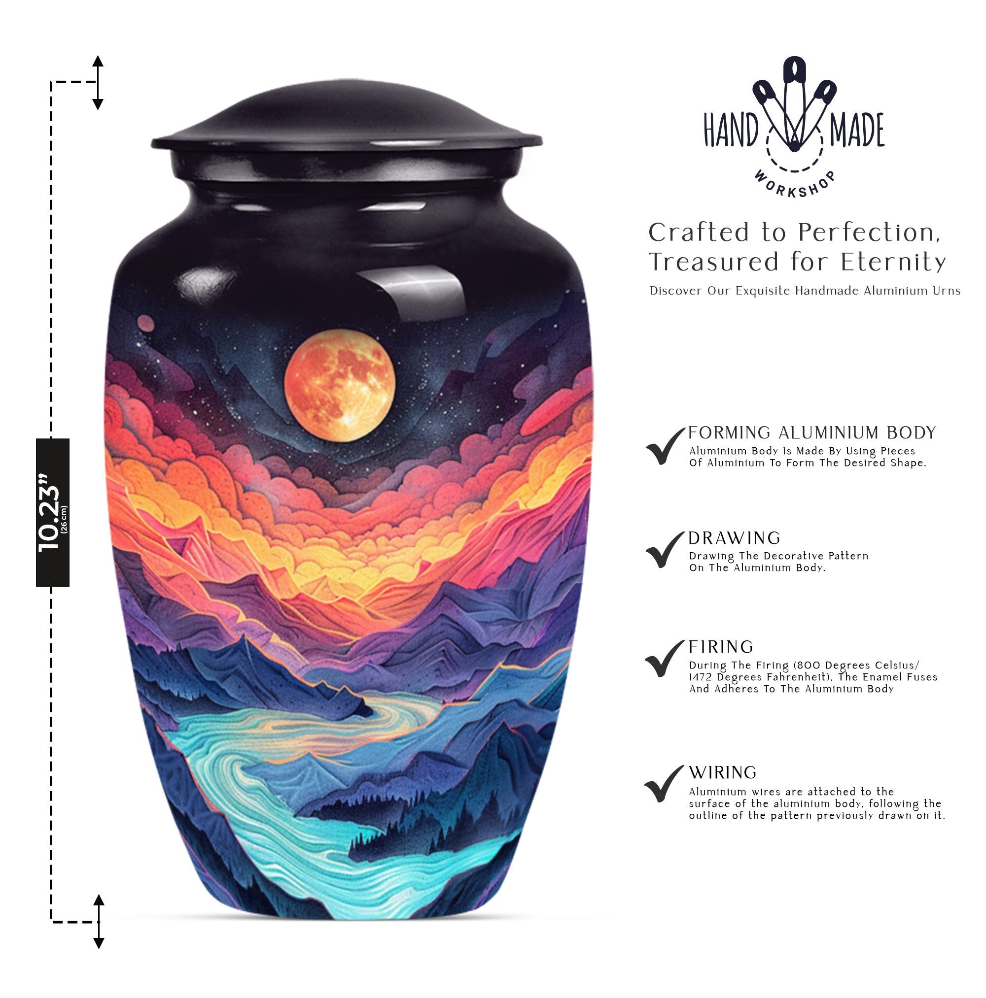 Commemorate the memory of your loved ones with an elegant MOUNTAINS urn. Crafted from premium Aluminium material, this large urn stands at 10 inches tall, encapsulating so much more than just 200 cubic inches of ash it has been designed to safekeep. Weighing a modest 3.3 pounds, this urn is robust yet unobtrusive. Echoing the tranquility of a Purple Meadow, the tasteful theme mirrors the decorous Large Urns type that this urn typifies. What's more, this memorial urn allows for personalization where you can engrave names making it more intimate and personal. The urn also comes with a velvet pouch for containment of ashes, providing an enveloping sense of peace and reverence. This is not just an ordinary cremation urn, it is a role model for funeral cremation urns and human ash holders. As a tastefully crafted article, this urn can also double up as a unique 'shape box for gift' and serves as a piece of stamped, unique craftsmanship that you will not come across daily.
