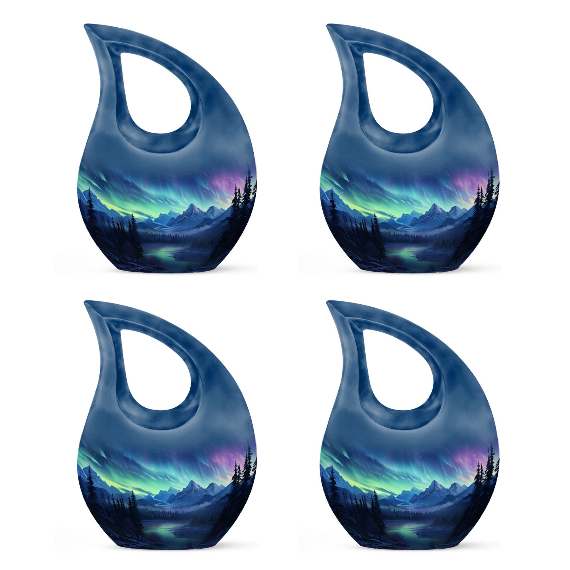 Crafted from high-quality aluminum, this large decorative urn for human ashes features a stunning mountain landscape illuminated by the mesmerizing hues of the Northern Lights. Each detail is artistically hand-finished, ensuring that every urn is unique. The large adult urn provides a secure and elegant resting place, with a durable finish that resists fading. With its generous capacity, this urn mom ashes large design is suitable for a full set of adult human ashes and offers a peaceful way to preserve cherished memories.