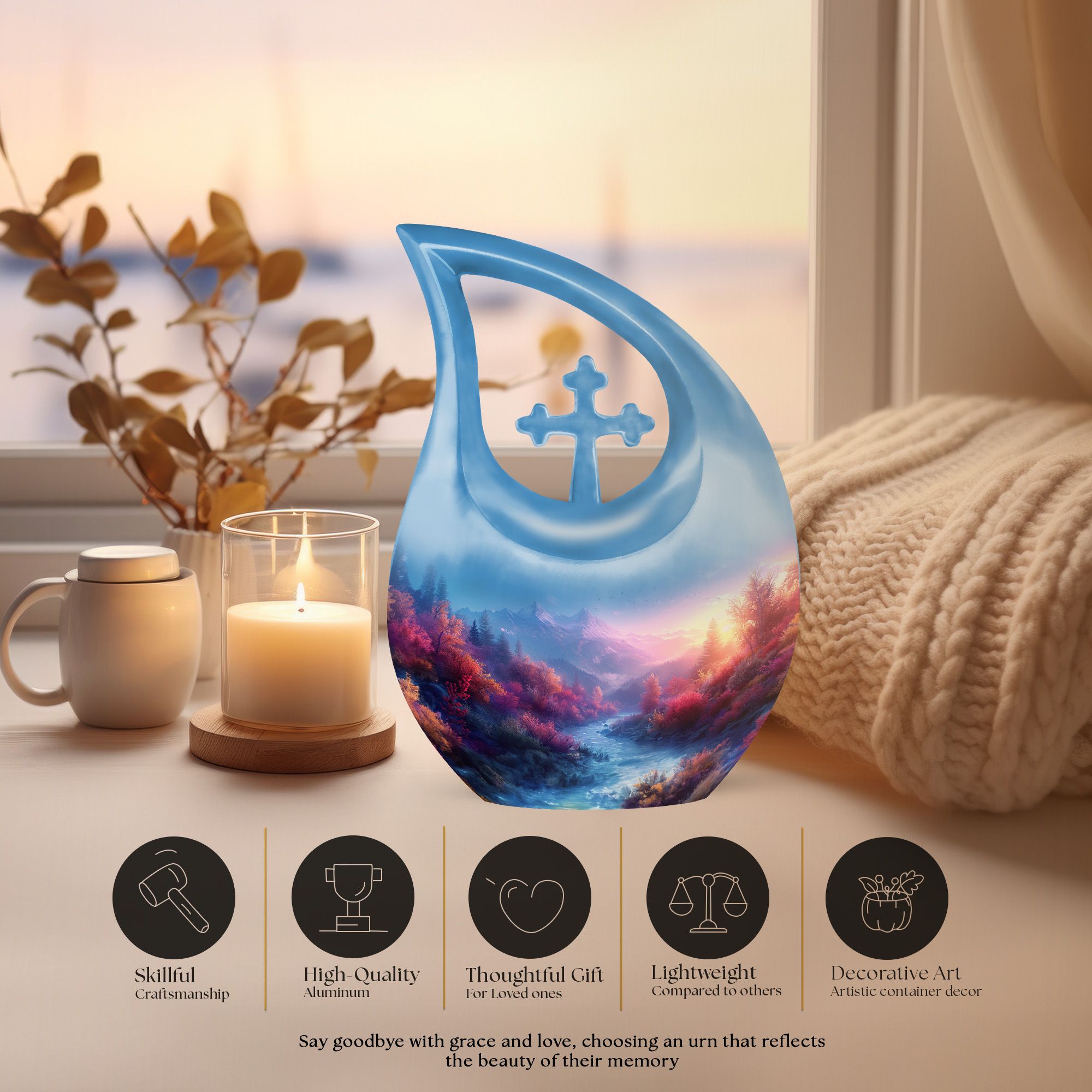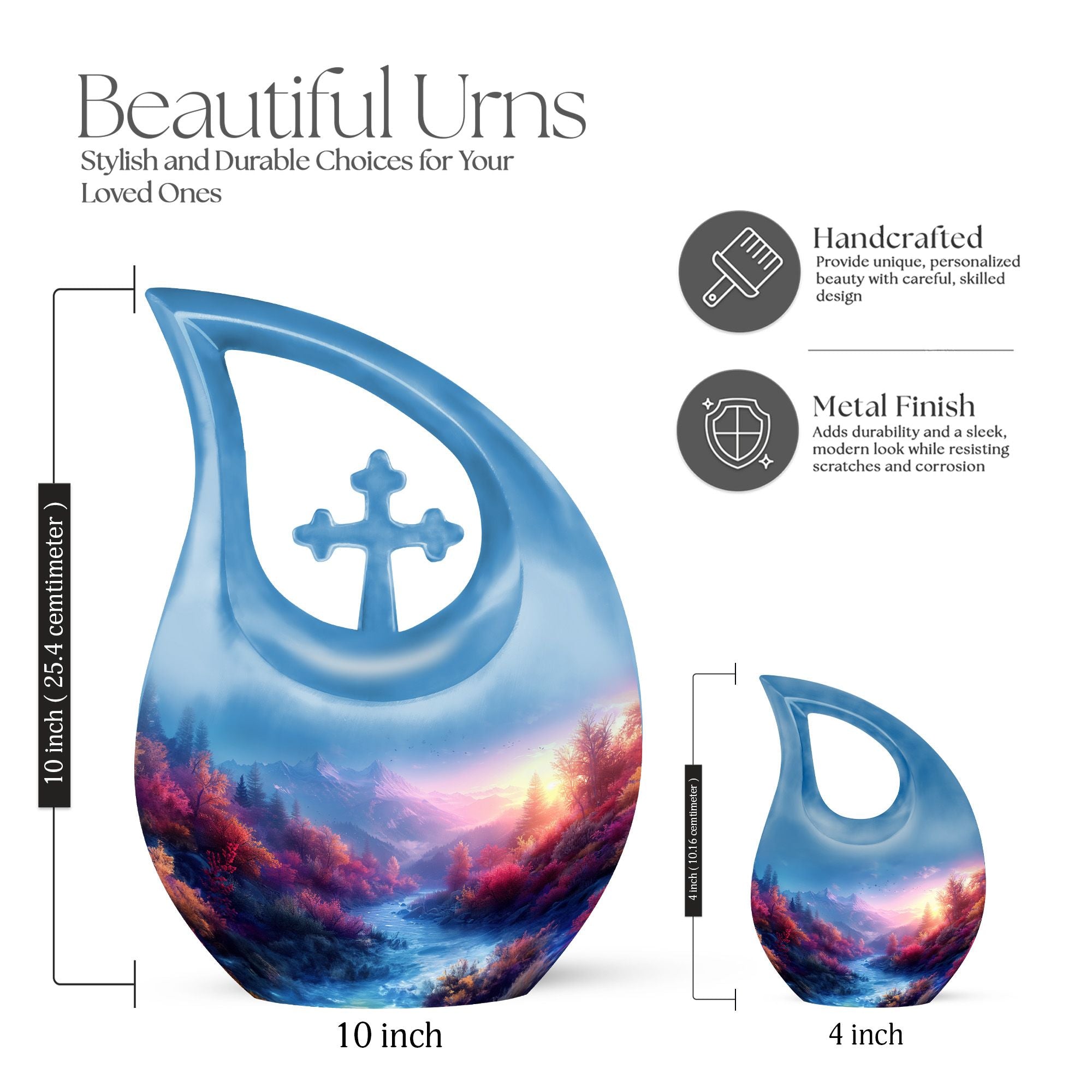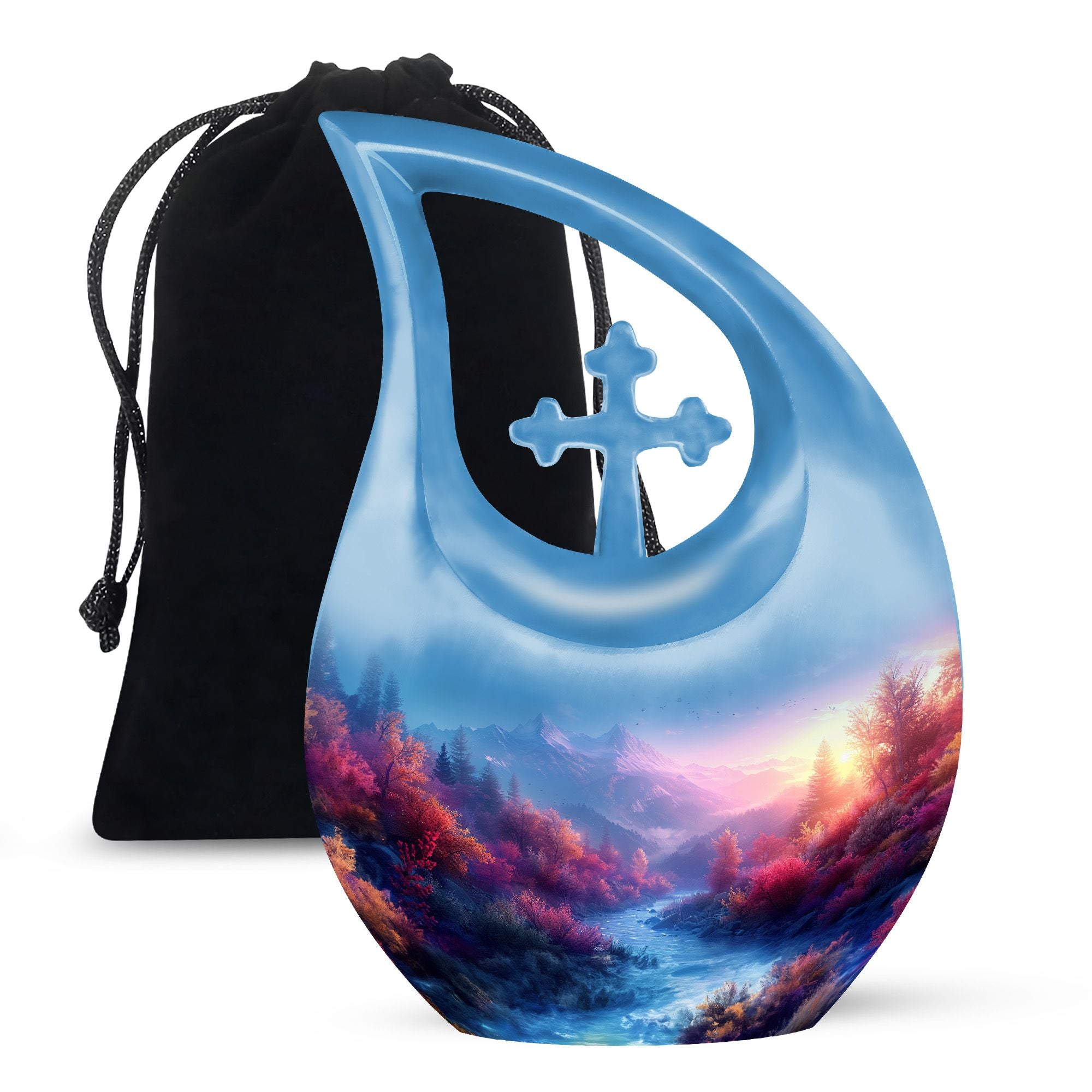 Unveil the serenity of the Mountains urn, a redefined approach to memorial urns. Imprinted with the vivid theme of 'Mountains,' this large urn stands 10 inches tall and showcases an enchanting 'Cross Drop' motif. The urn exudes a light yet emotionally profound presence with its 3.3 pounds of weight. Catering to a more practical aspect, it boasts a significant capacity of 200 cubic inches, effortlessly embracing the sacred ashes of your beloved. The urn is meticulously crafted from high-quality aluminium, ensuring longevity and a gracefully aesthetic finish. Your purchase nestles within a thoughtful velvet pouch, providing an elegant containment for the ashes. As a further gesture of our personal touch, we extend the facility to personalize the urn with engraved names. Complementing a primary search for 'Mountains Urn' or 'Mini Urn,' it also responds to secondary keywords including 'Custom Urns,' 'Keepsake Urns,' and 'Funeral Urns.' An epitome of reverence and remembrance, this urn beautifully converges tradition and contemporary elegance.