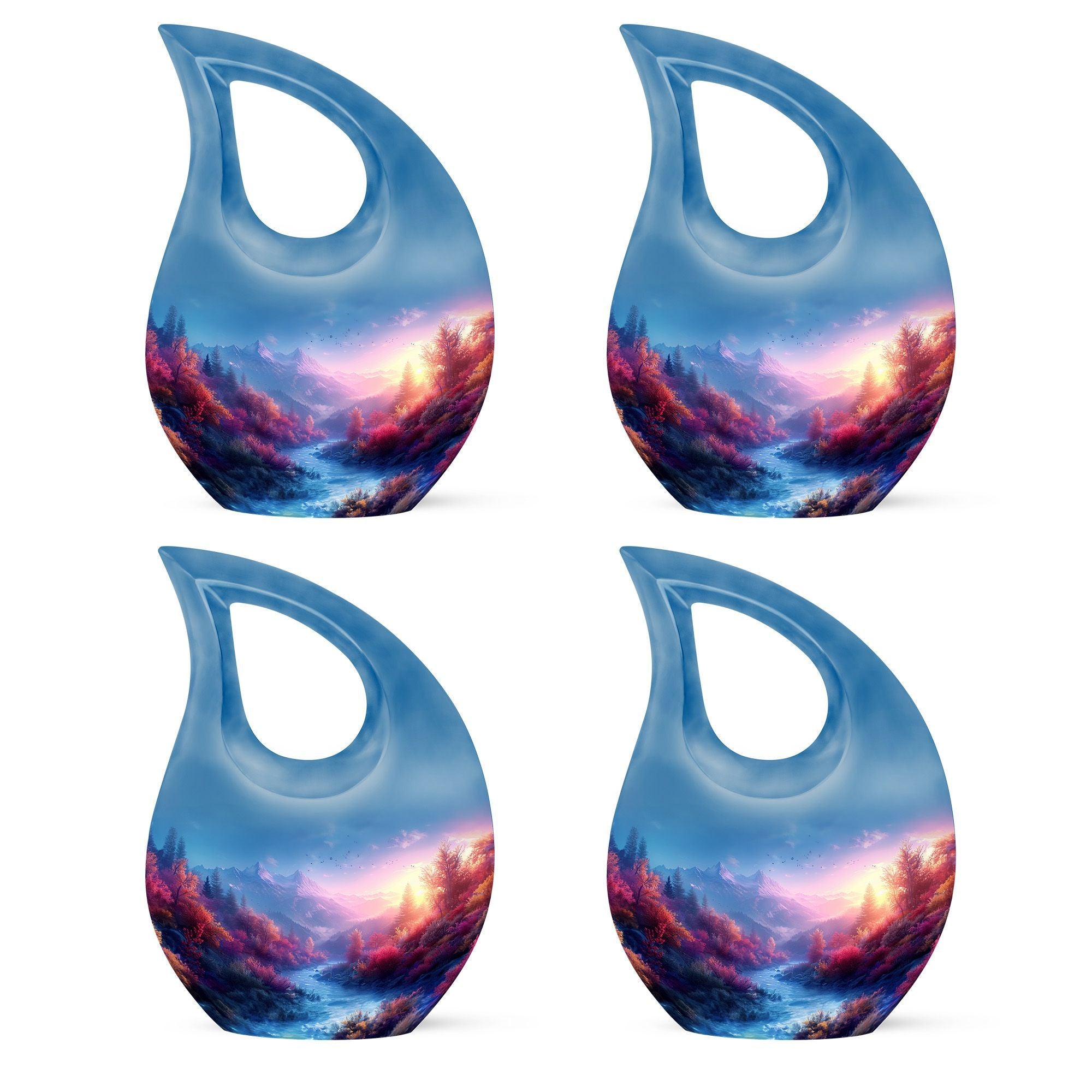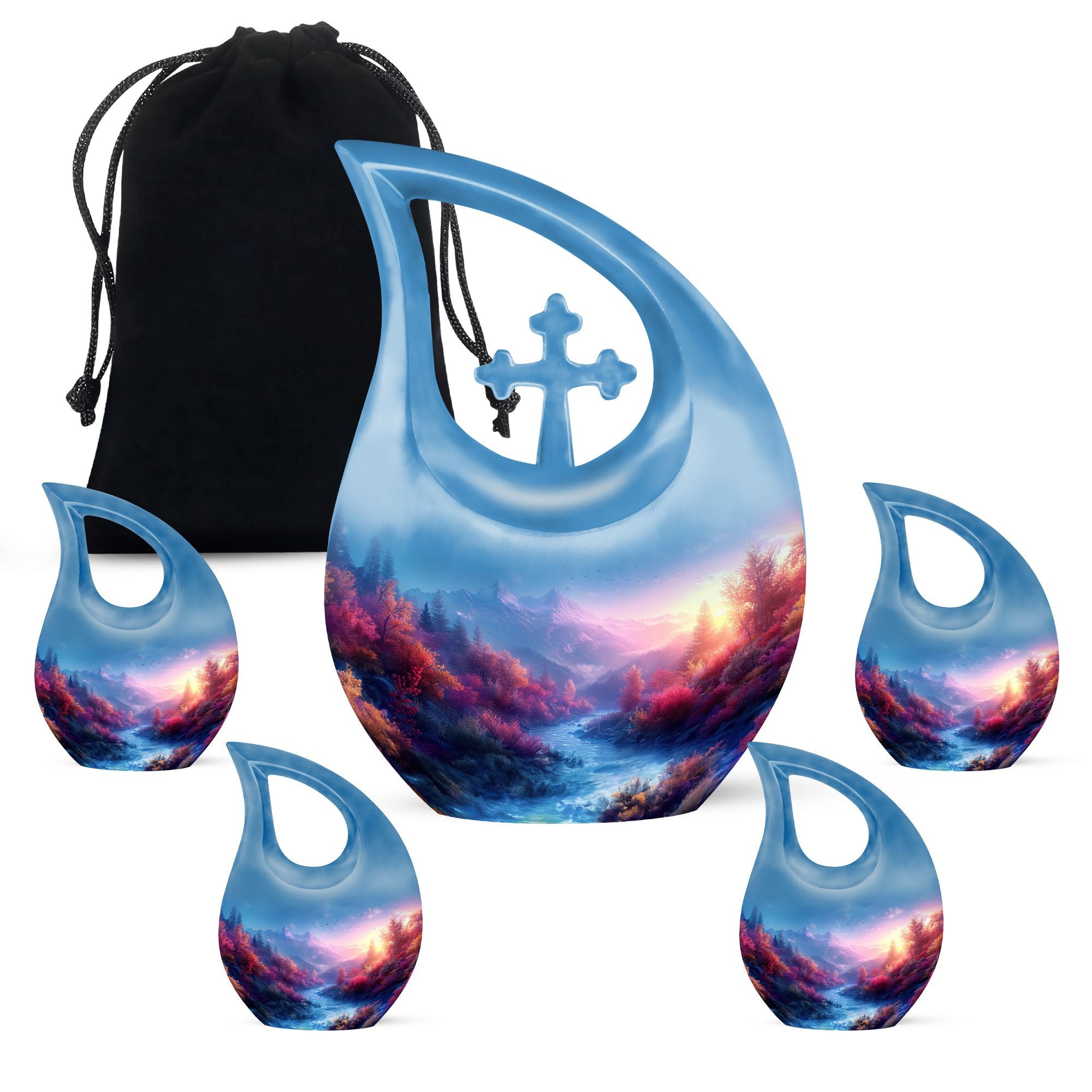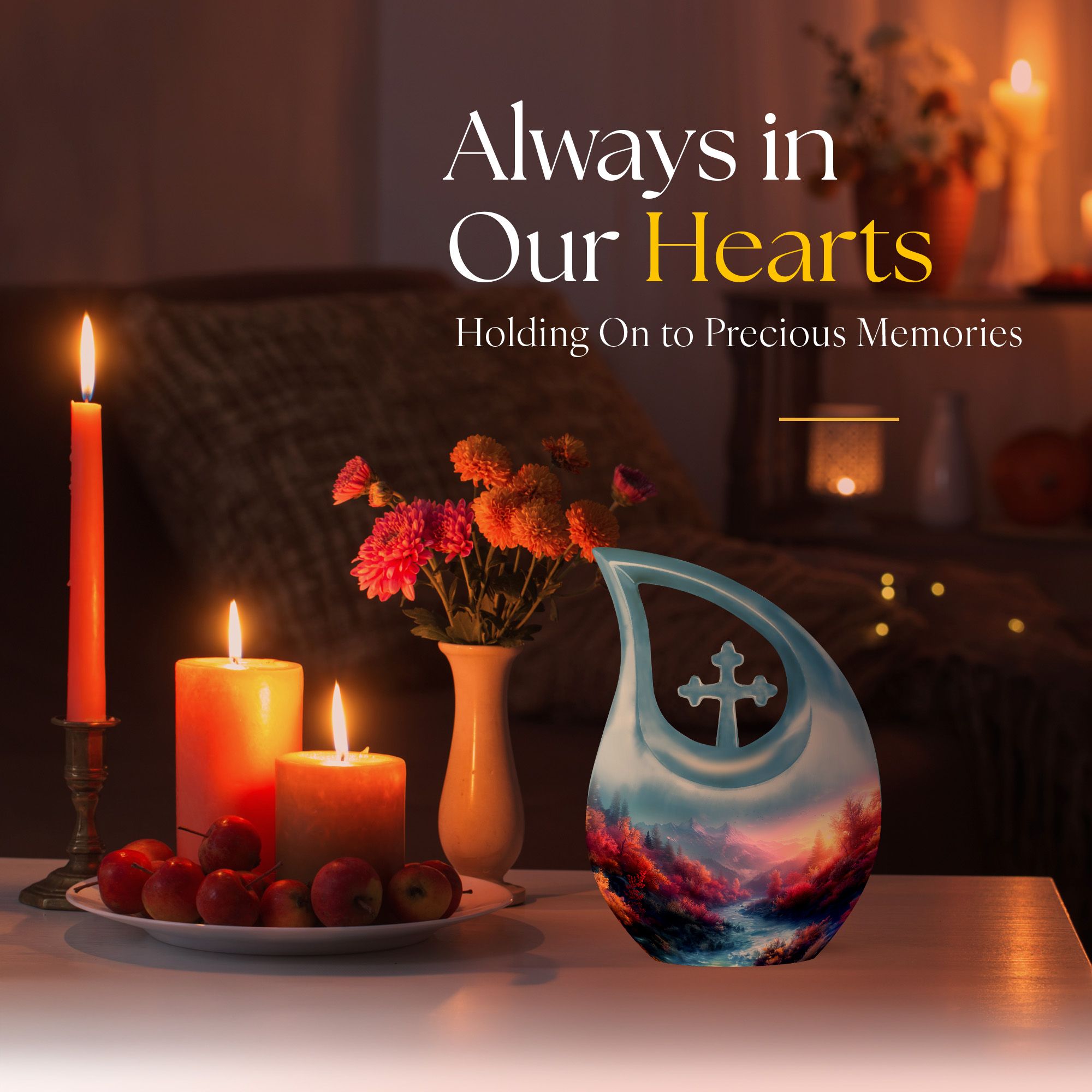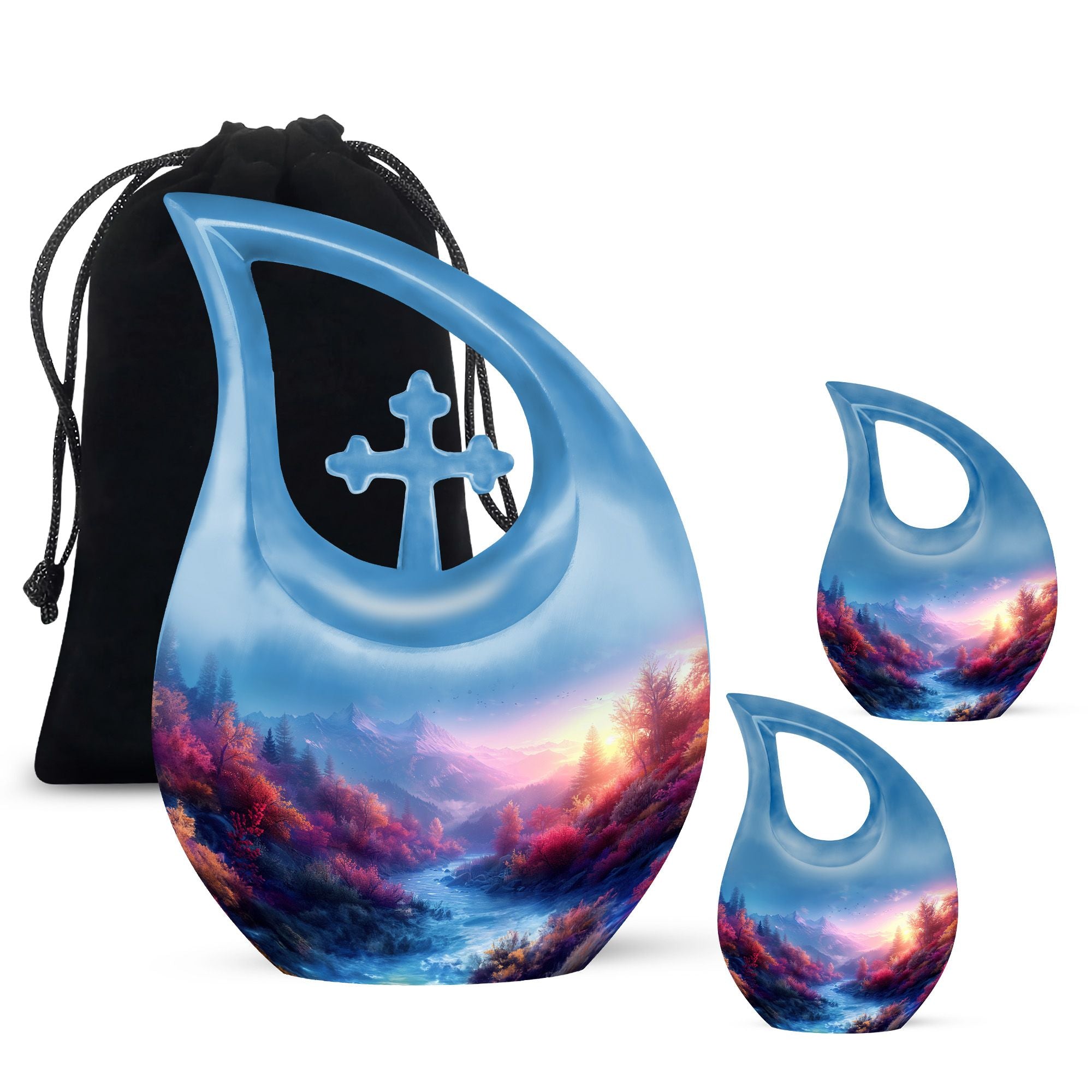 Unveil the serenity of the Mountains urn, a redefined approach to memorial urns. Imprinted with the vivid theme of 'Mountains,' this large urn stands 10 inches tall and showcases an enchanting 'Cross Drop' motif. The urn exudes a light yet emotionally profound presence with its 3.3 pounds of weight. Catering to a more practical aspect, it boasts a significant capacity of 200 cubic inches, effortlessly embracing the sacred ashes of your beloved. The urn is meticulously crafted from high-quality aluminium, ensuring longevity and a gracefully aesthetic finish. Your purchase nestles within a thoughtful velvet pouch, providing an elegant containment for the ashes. As a further gesture of our personal touch, we extend the facility to personalize the urn with engraved names. Complementing a primary search for 'Mountains Urn' or 'Mini Urn,' it also responds to secondary keywords including 'Custom Urns,' 'Keepsake Urns,' and 'Funeral Urns.' An epitome of reverence and remembrance, this urn beautifully converges tradition and contemporary elegance.