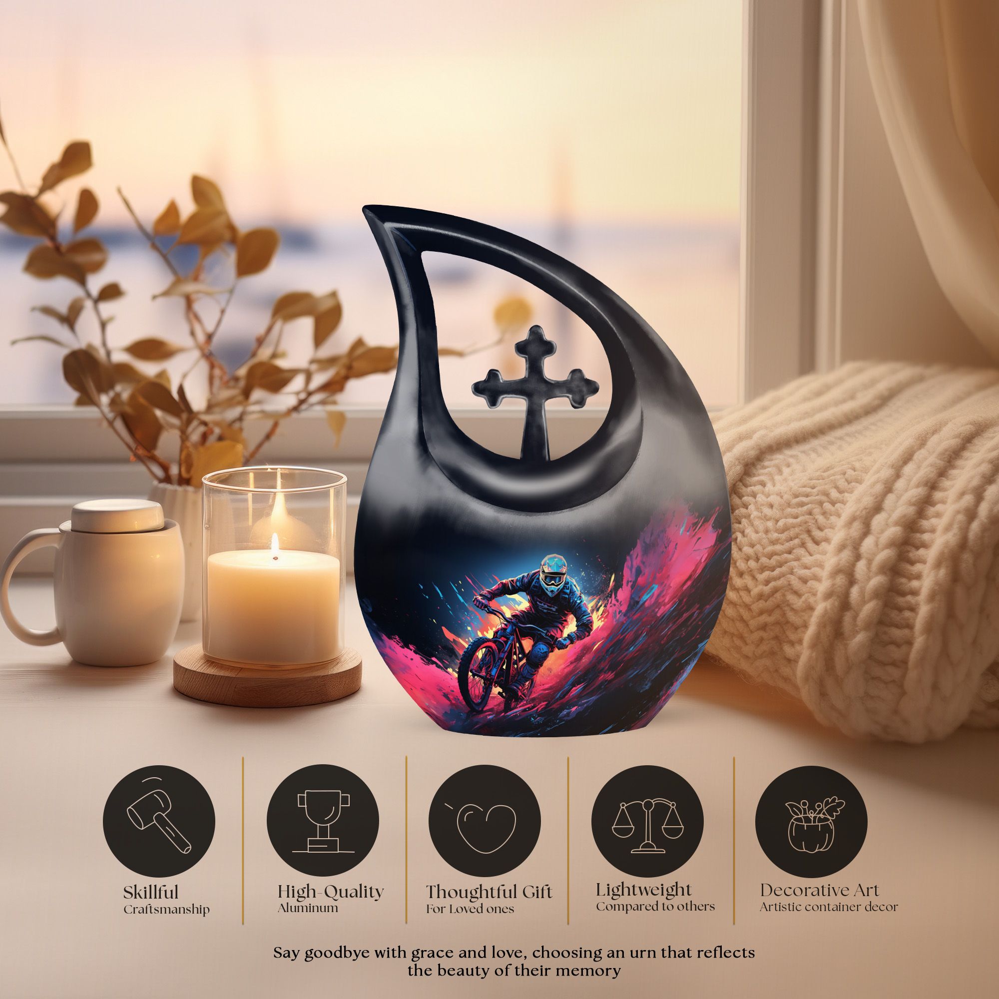 Crafted from durable aluminum, the urn features detailed mountain bike–themed artwork symbolizing strength, exploration, and the joy of the trail. Its secure screw-top lid ensures long-term protection, while the full-size design provides ample capacity for adult remains. This urn pairs beautifully with mini urns for ashes, miniature urns for human ashes, mini urns for human ashes mom, mini urns for human ashes dad, or mini keepsake urns for human ashes to create a coordinated memorial set. Whether used for display, ceremonies, or shared remembrance, this MTB urn offers both beauty and functionality.