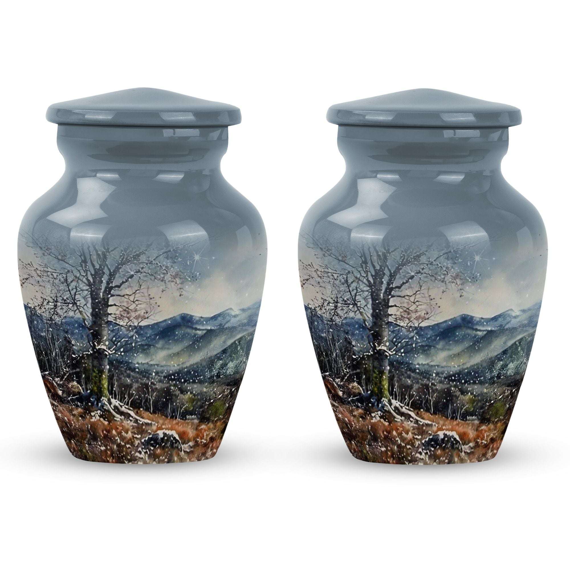 Create a memorable and touching tribute to your loved ones with this 10-inch Mountains Urn, designed to elegantly store adult ashes. Available in the abstract theme, this Large Urn resonates with a comforting sense of peace and closure. Made from sturdy aluminium, it weighs a stable 3.3 pounds and provides a generous capacity of 200 cubic inches. Personalize this memorial ash urn with engraved names, adding a unique and deeply personal touch to help preserve fond memories. The package includes a velvet pouch, offering a safe and dignified containment for the precious contents. This urn is not just an object, but a vessel that carefully safeguards the physical remnants of your beloved. Beyond its vital function, it surely acts as a subtle and tastefully made decorative piece. Forget the conventional funeral urns for men's ashes; choose the Mountains Urn for a personal, enduring remembrance. Keep in mind that 'Elegant urns' and 'memorial urns' are some of the keywords you may want to use while searching for this product online.