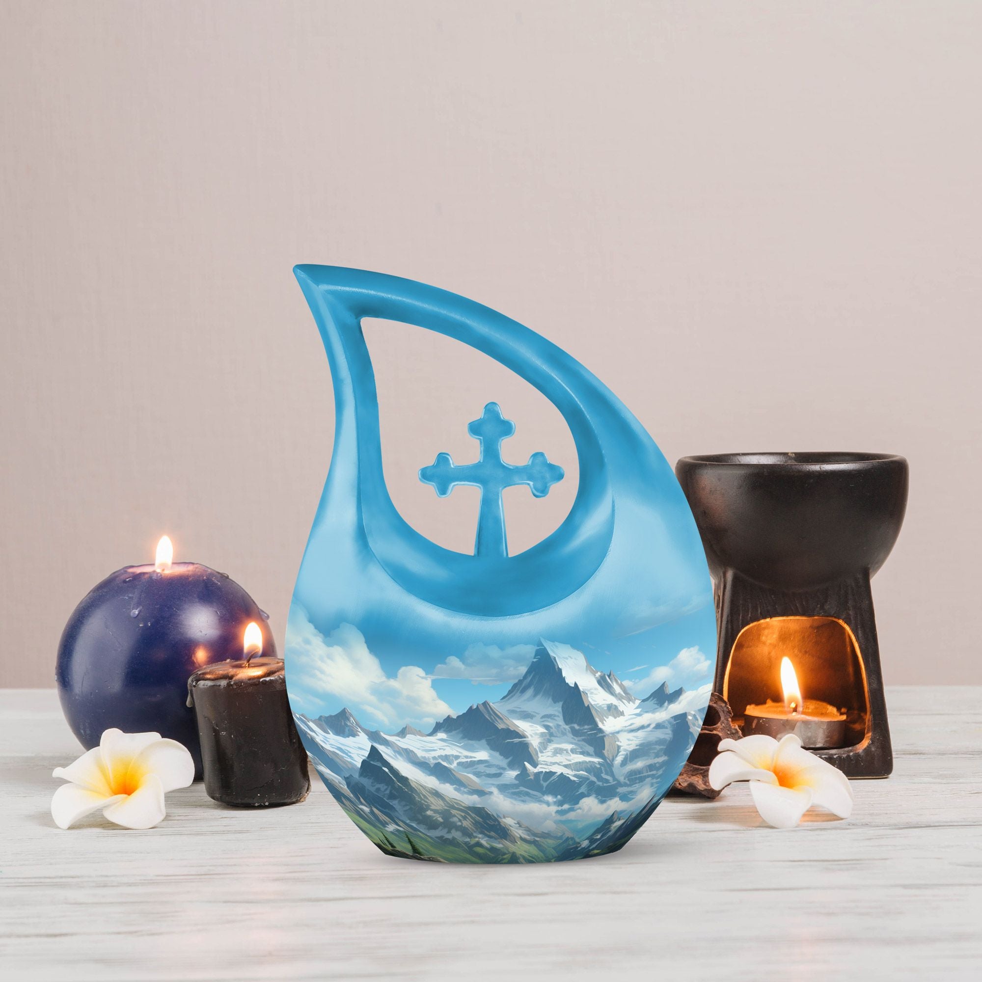 Step into the heart of tranquil serenity with our Mountain Urn, a masterful blend of design and elegance that will surely honor your Dad's unique and cherished personality. Crafted from durable Aluminium, this urn is both resilient and elegant. The stately, 10-Inch high urn has a 200 cubic inch capacity, large enough to carry the essence and memories of your loved one. The handcrafted Cross Drop design adorns the urn, symbolizing faith and strength in incomparable times. We understand that this urn becomes a vessel for preserving precious memories, hence we offer the option of personalizing it with engraved names, ensuring a lasting and bespoke tribute. With your purchase, you also receive a velvet pouch to safeguard and preserve the ashes. This product, a beautiful container for ashes of loved ones, artfully bridges the gap between style and affordability. We've incorporated features and materials that make it more than just a decorative urn for ashes, it is a unique and enduring monument in memory of your beloved dad. Thus, our Mountain Urn, is not just a cheap cremation urn but rather a meaningful, respectful and personalized remembrance.