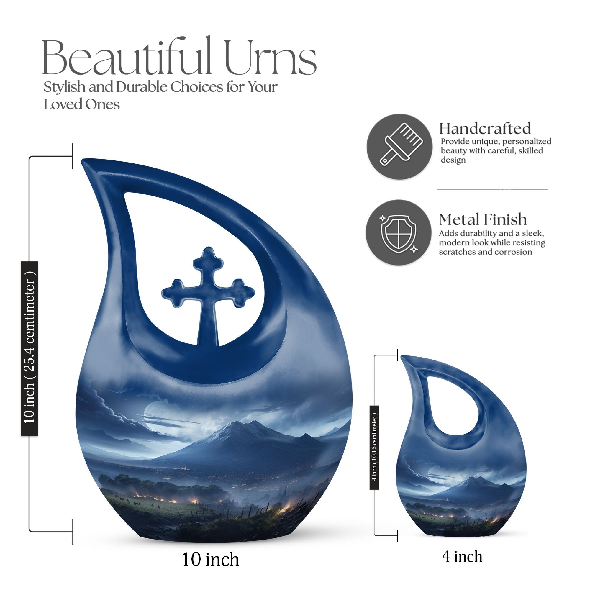 Cherish the memory of a loved one with the 10-inch Mountain Urn, a serene final resting place showcasing the Cross Drop design. As one of our large urns, this piece holds 200 cubic inches and doubles as an elegant piece of decor, subtly reminding you of your loved one's enduring presence. Crafted from premium aluminium, this urn weighs 3.3 pounds, underscoring its high-quality build and durability. The complimentary velvet pouch discreetly contains the ashes and facilitates a respectful interment. The urn also supports personalized engravings, allowing you to immortalize your loved one's name on the urn itself – a fitting tribute to their memory. Keywords akin to 'Mountain Urn, Urns For Cremated Remains, memorial urns, Companion Urns For Burial, Extra Large Cremation Urns, Blue Urns For Human Ashes, Pretty Urns' might lead you to this artifact. This urn, with its reverence to nature and the mountain theme, serves as a beautiful vessel for earthly remains, ensuring their respect and perpetuity.
