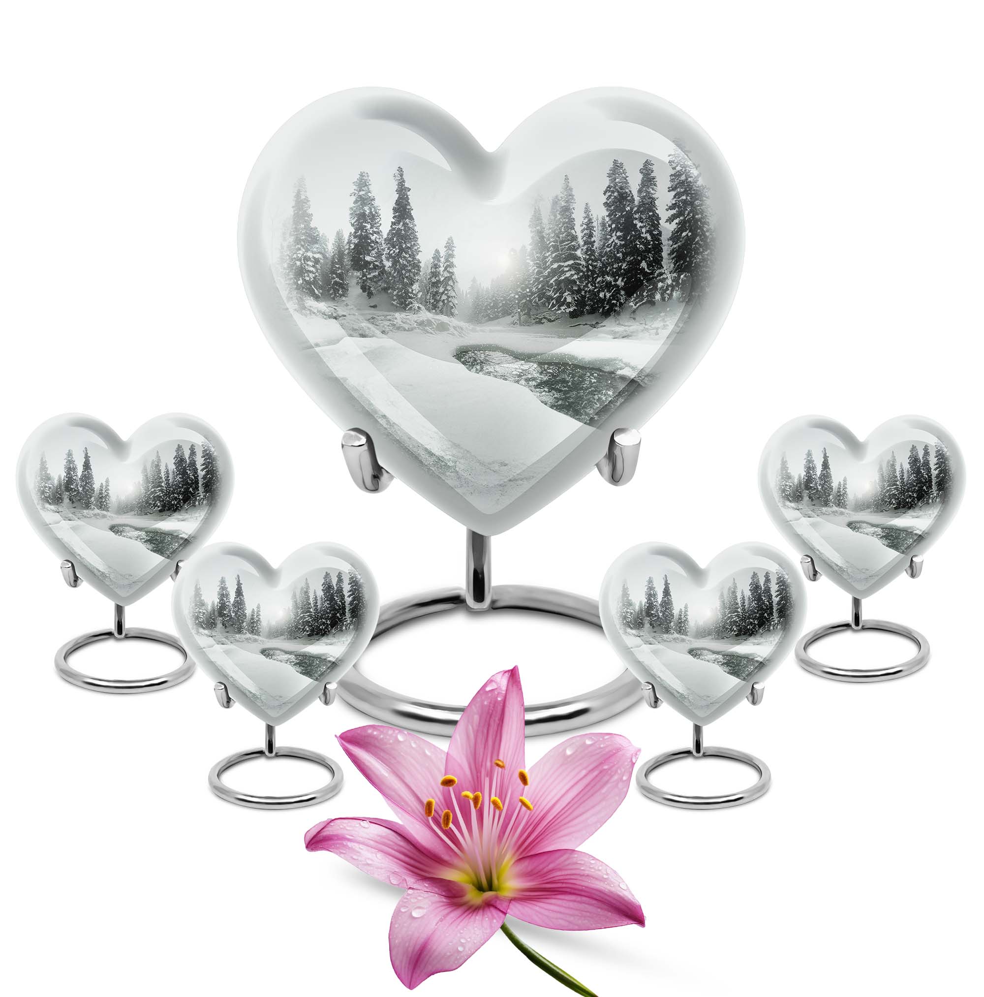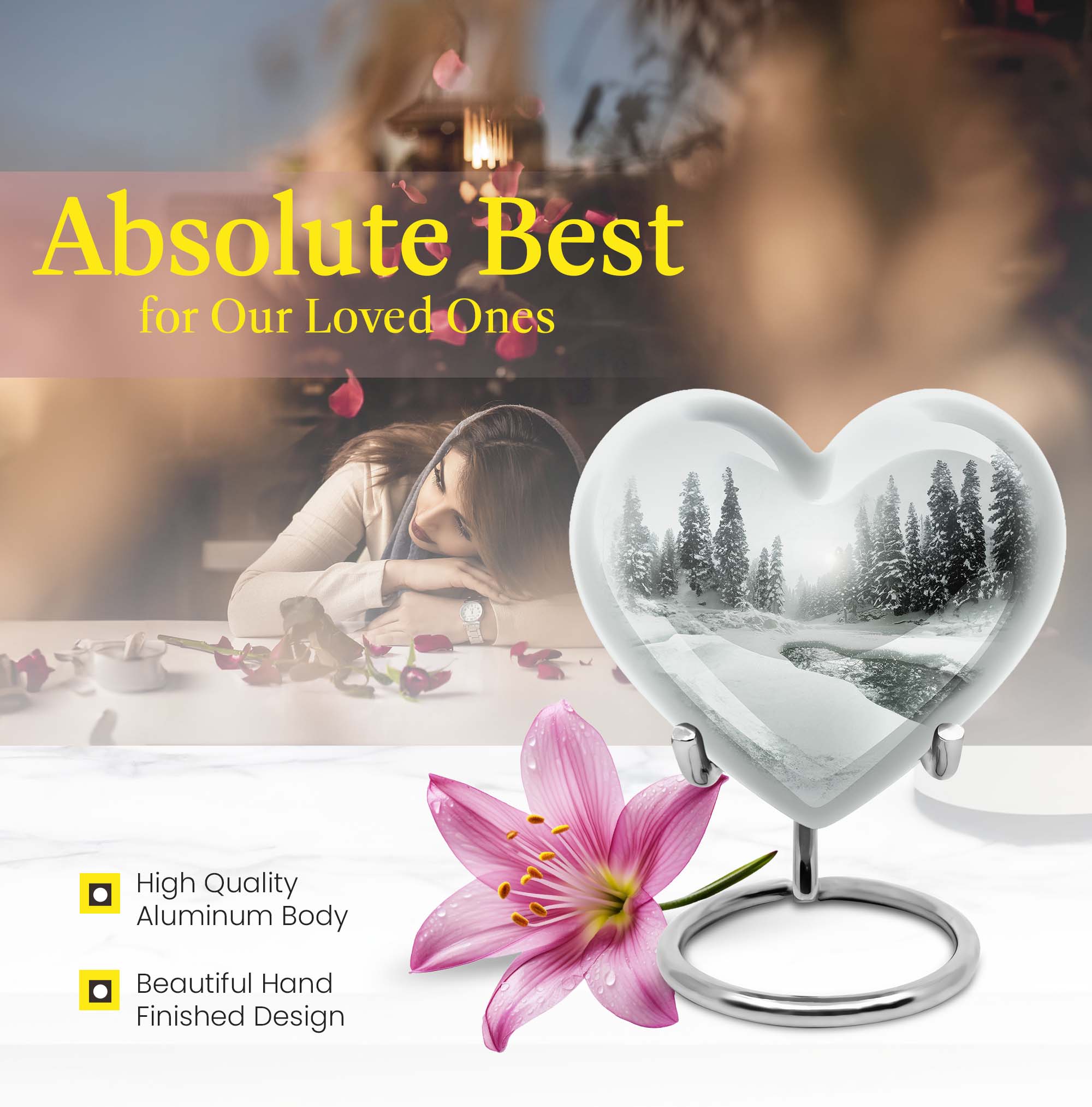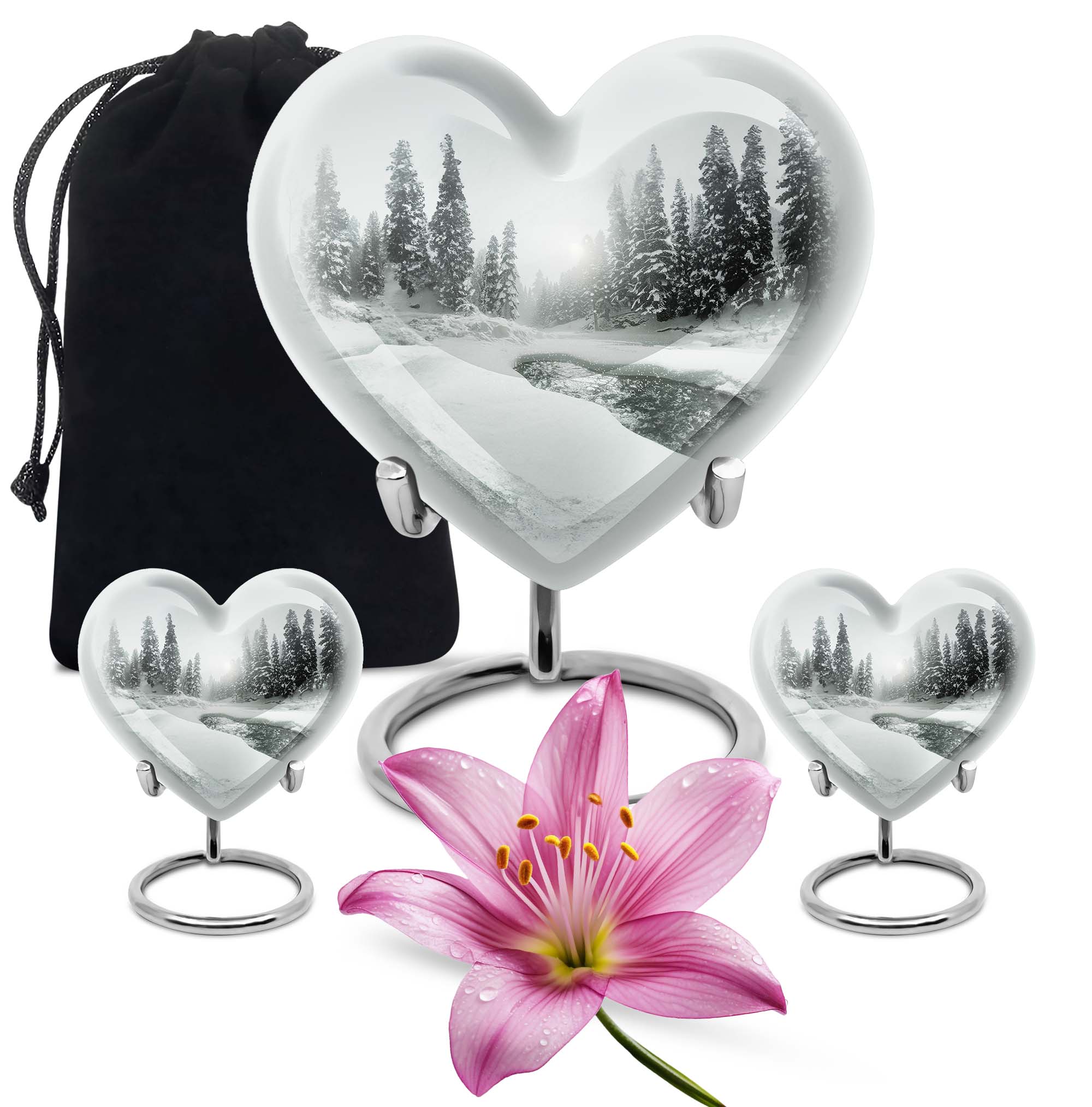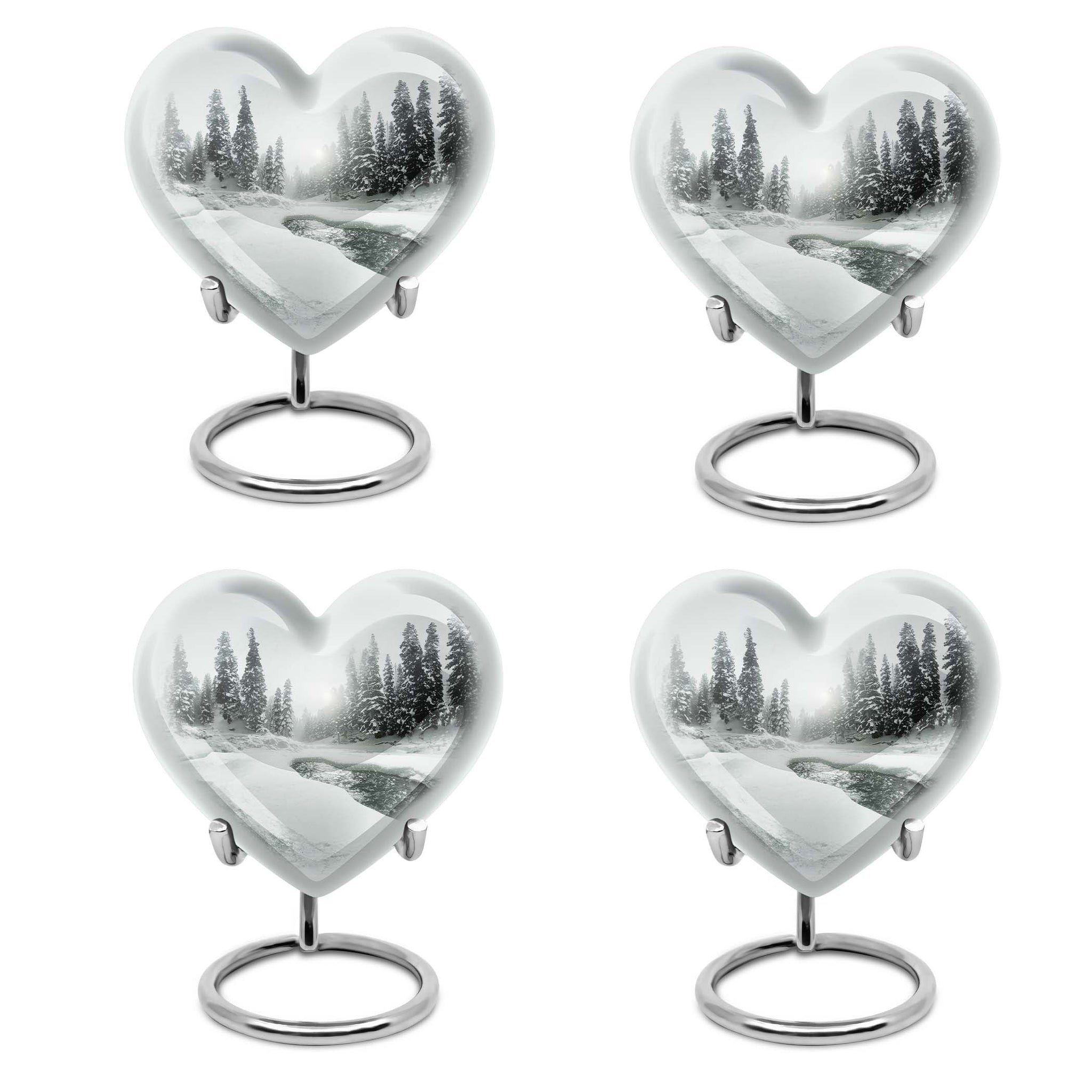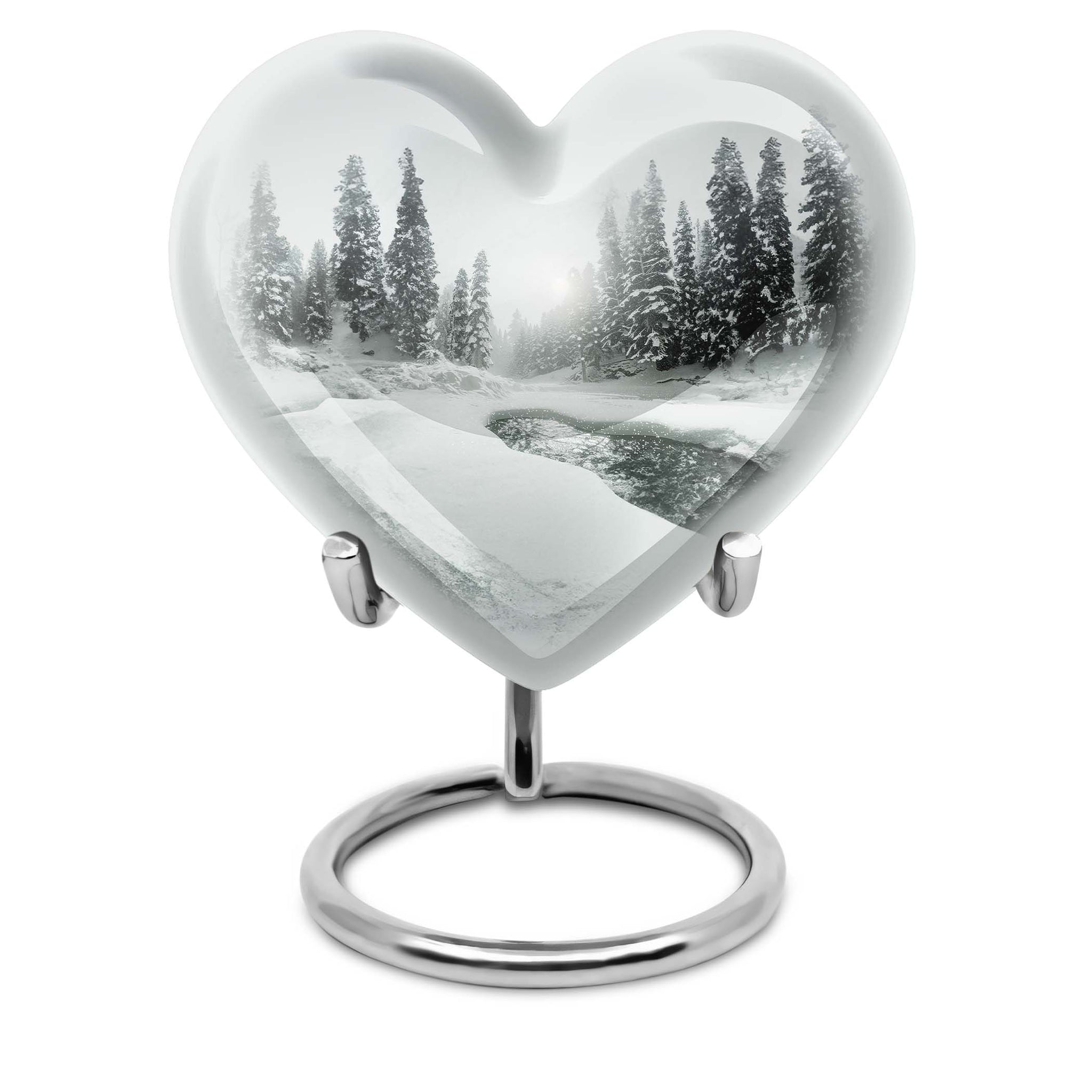 Introducing our Mountain Winter Urn, a place of peace and tranquility for your loved ones. This large urn is made from durable aluminium known for its lasting quality. The unique abstract theme emanates a serene aura, making it a thoughtful choice for a loved one's final resting place. It measures 10 inches in height, fitting comfortably at any memorial spot. Weighing 3.3 pounds, it demonstrates a perfect blend of sturdiness without being overly heavy. The given capacity is 200 cubic inches, suggesting ample room to accommodate adult ashes. Personalize your tribute further by getting engraved names added to it. Inside the package, you'll also find a velvet pouch, ideal for holding the ashes securely. This mountain winter urn converges on the theme of cremation or burials in the ground. It might also serve well for those considering cremation rings or metal urns for ashes. Overall, this high-quality urn offers an appealing blend of durability, personal touch, and ethereal beauty.