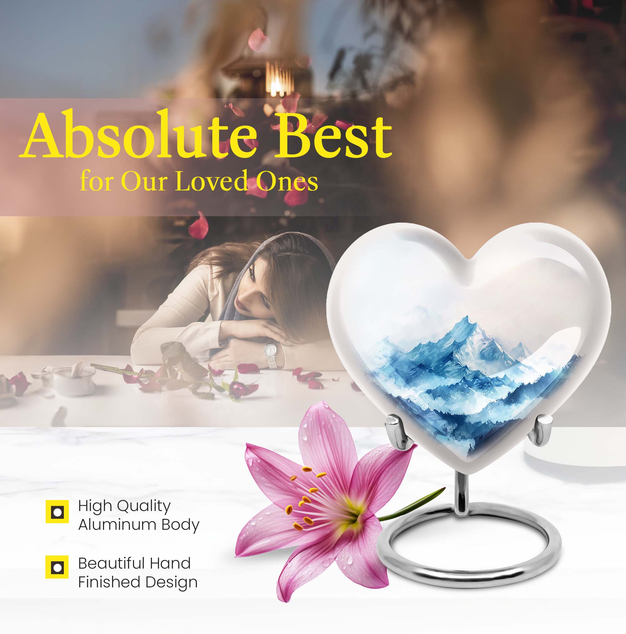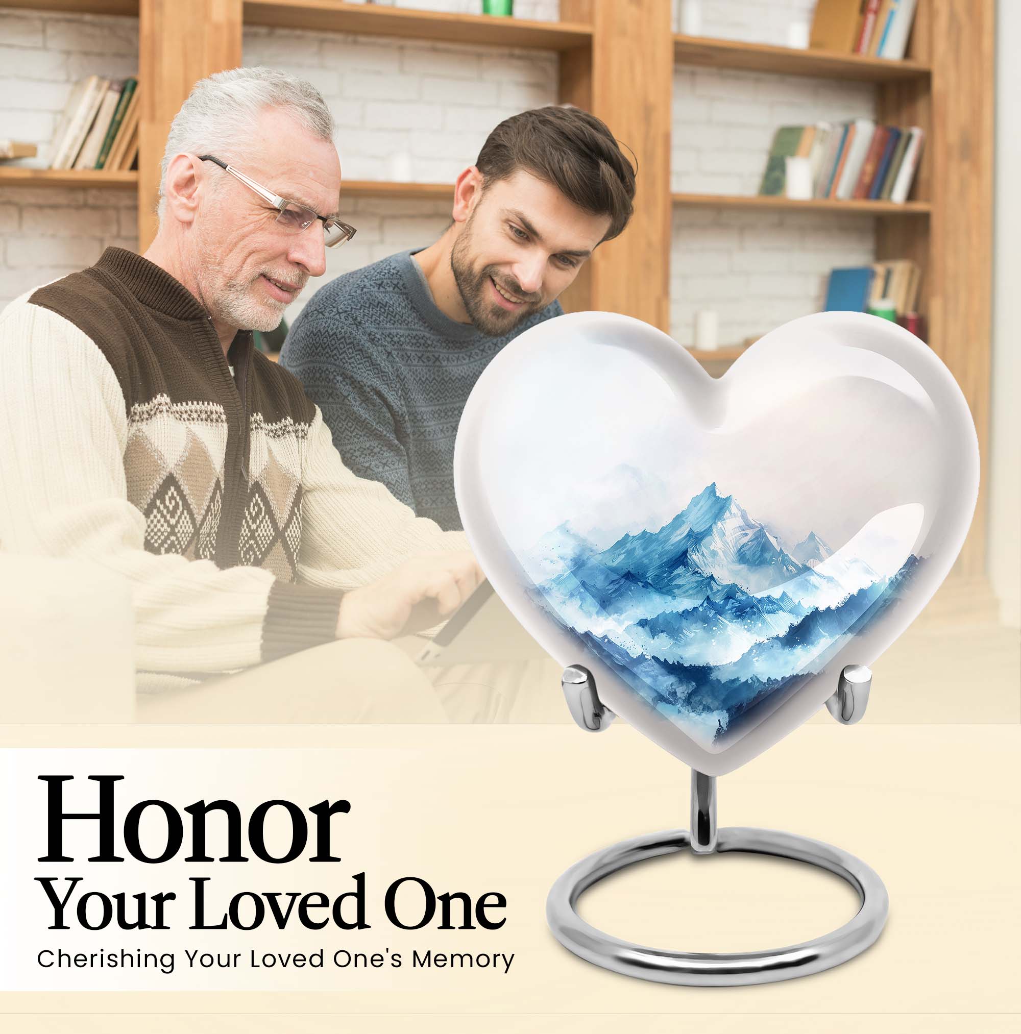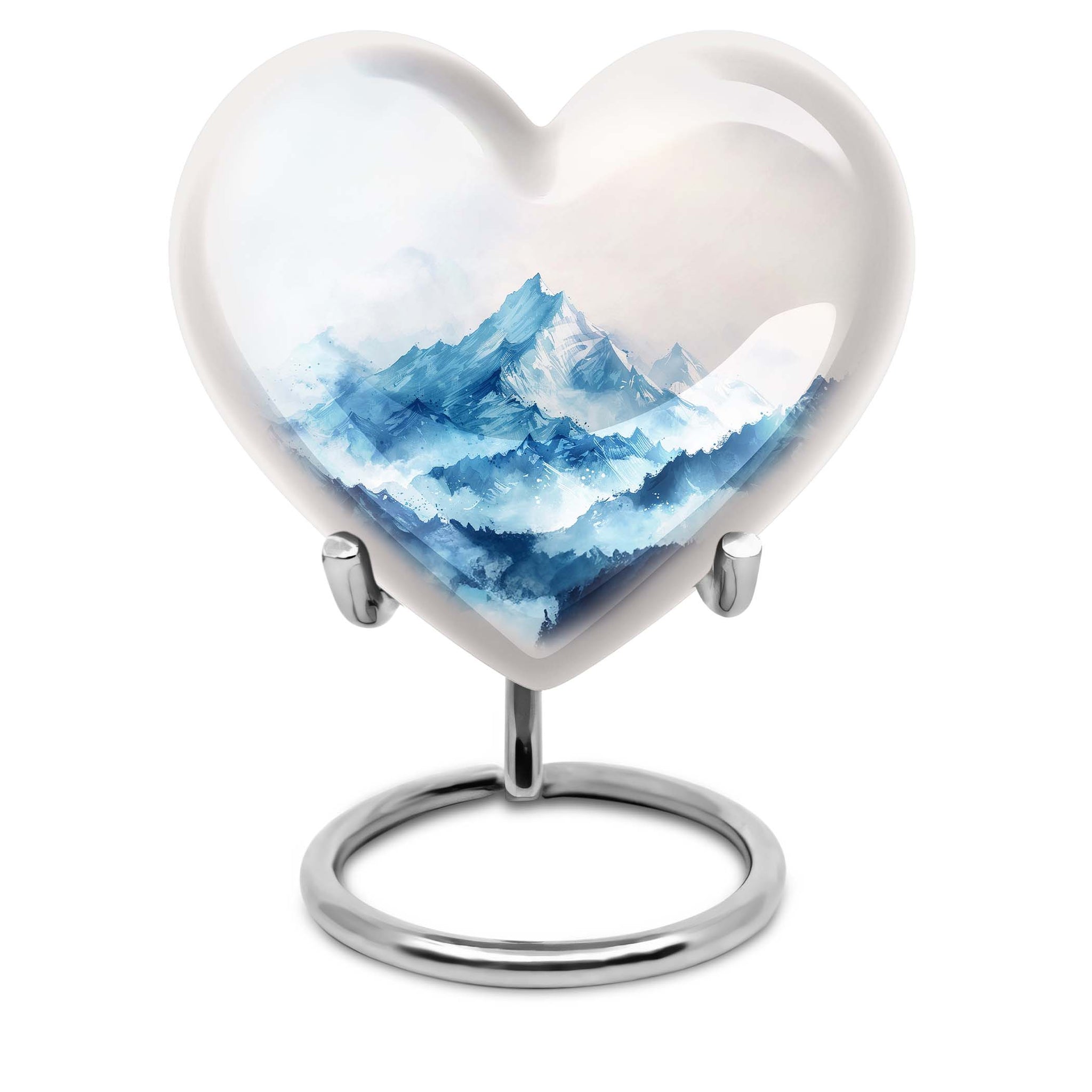 Honor your loved one with our mountains urn, specifically designed for adults and seniors seeking meaningful memorial ceremony supplies. Our large urn, standing tall at 10 inches in height and weighing 3.3 pounds, is a comforting presence in any room. Sculpted with an abstract theme, the heart urn provides a significantly stirring symbol. Meticulously crafted from robust aluminium, it ensures the safe containment of up to 200 cubic inches of ashes. We understand the sentiment behind remembering your mom, and our urn reflects that emotion profoundly. Your purchase includes a soft velvet pouch for the safe keeping of the ashes. To make the urn truly unique, take advantage of our customization option to engrave names and create a lasting tribute. Discover serenity and homage through our 'memorial urns,' where tasteful design and personalization meet.