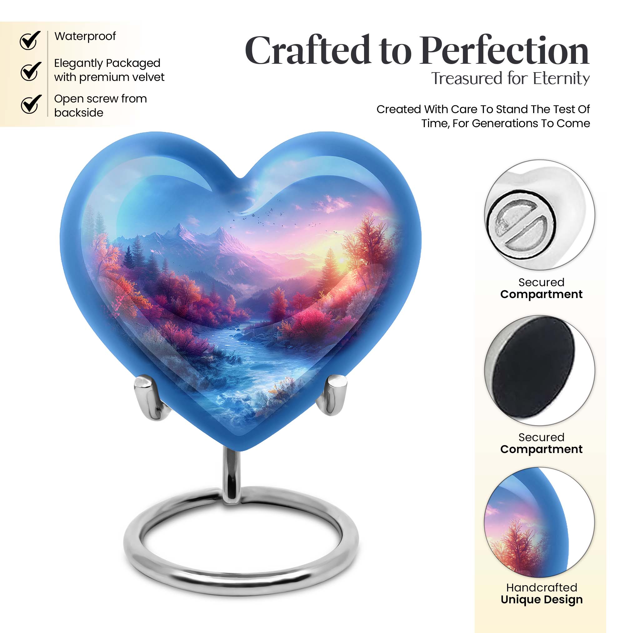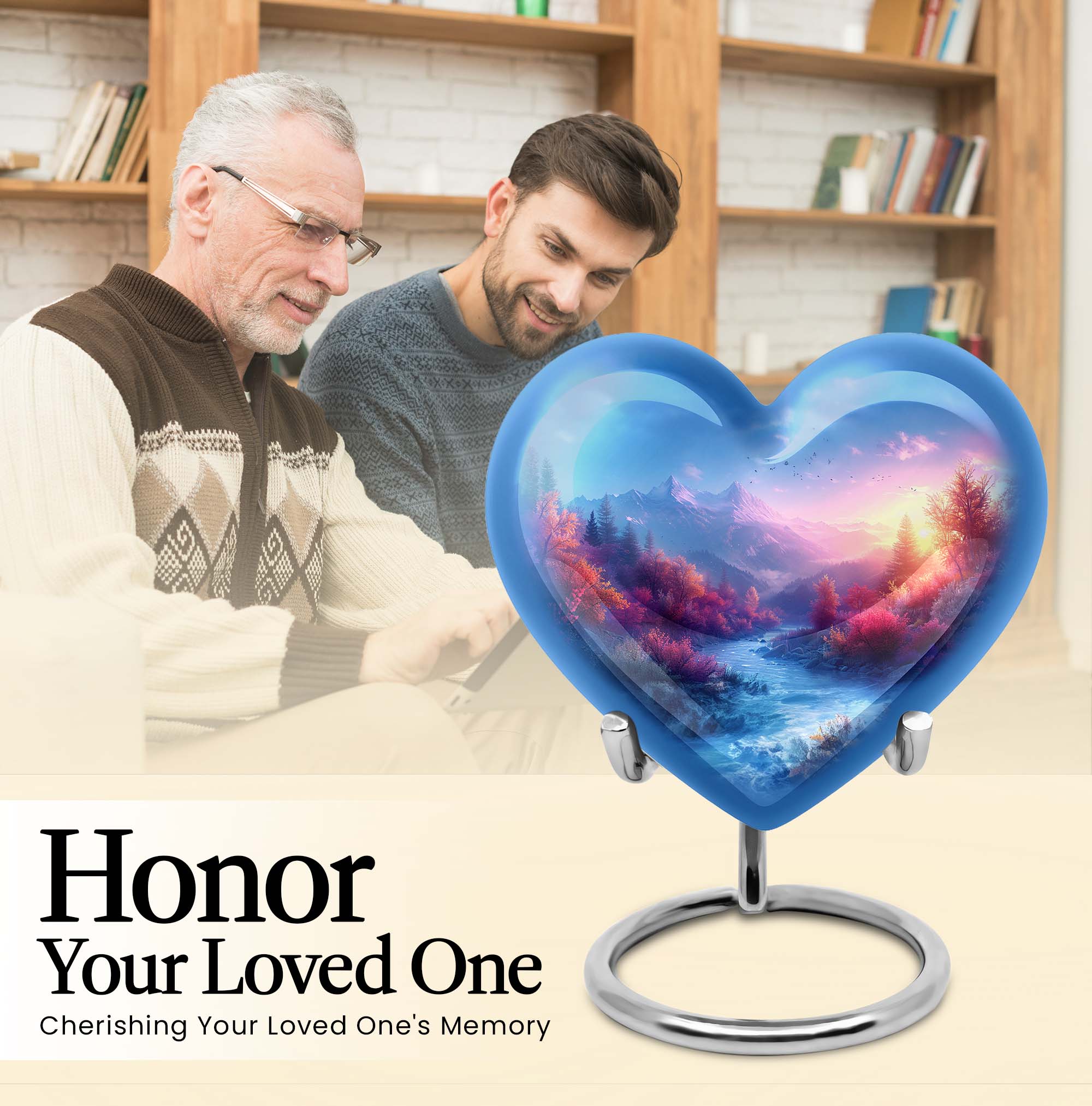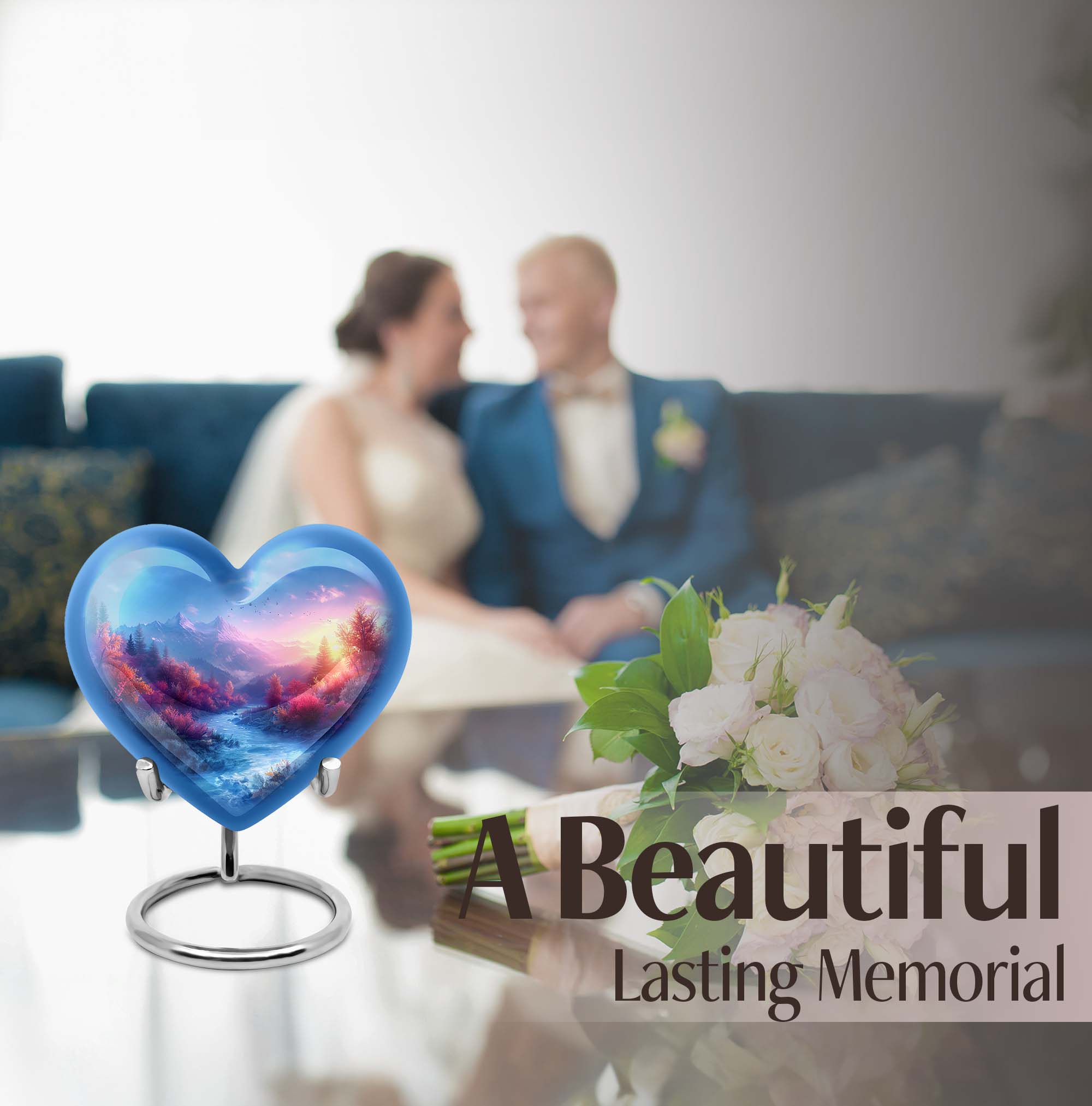 Immerse in the calm tranquility brought by the Heart Urn; an exquisite large-size urn for human ashes, serenely embodying the solace of the mountains. This stunningly abstract-themed work of art, measuring 10 inches in height with a capacity of 200 cubic inches, subtly speaks to the eternal spirit and captivating allure of nature's grandeur. Tucked away securely in a velvet pouch, this medium-sized, lightweight urn, tipping the scales at just 3.3 pounds, is designed from durable and premium quality aluminium. It features the flexibility to personalize with engraved names, allowing a highly intimate and sentimental element. Pervaded with the soft whispers of tender memories, this funeral and memorial urn perfectly cherishes the enduring love and respect for a beloved soul. Reflect on the timeless memories and precious moments, preserved safely within this memorial urn. Express your love and remembrances in a dignified, respectful manner with this eloquent, one-of-a-kind mountains urn.