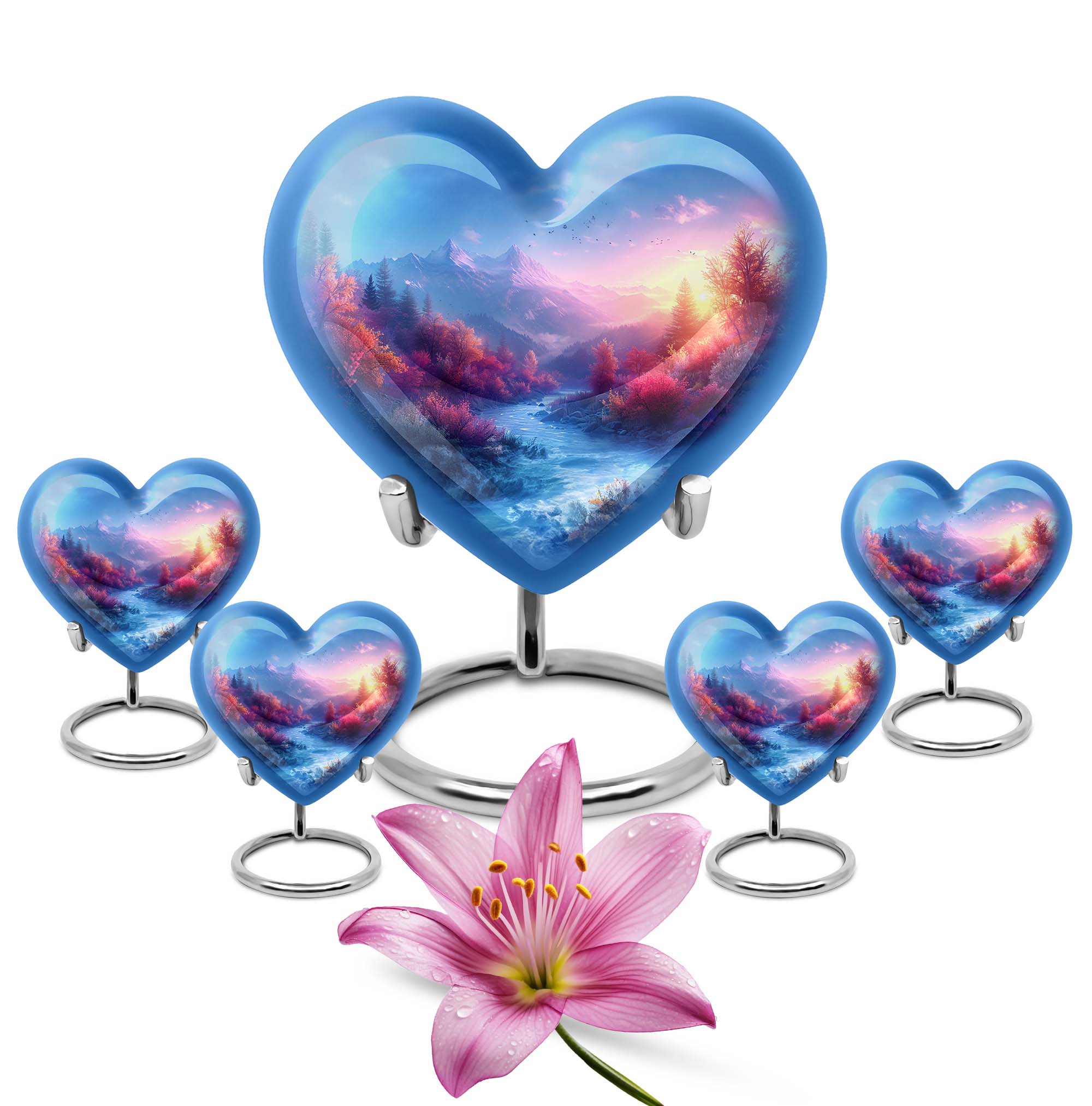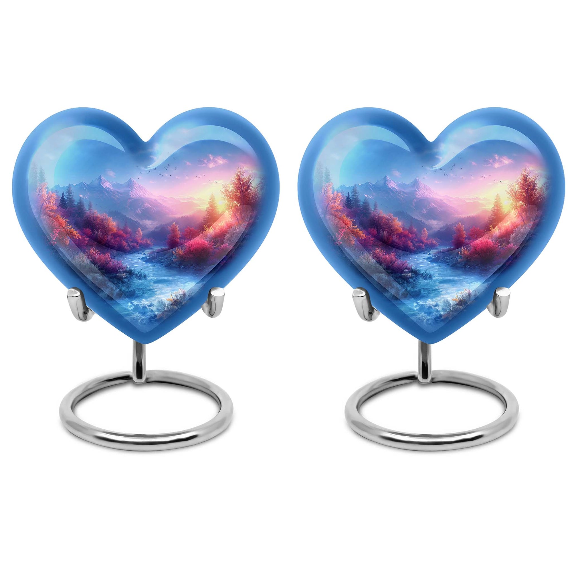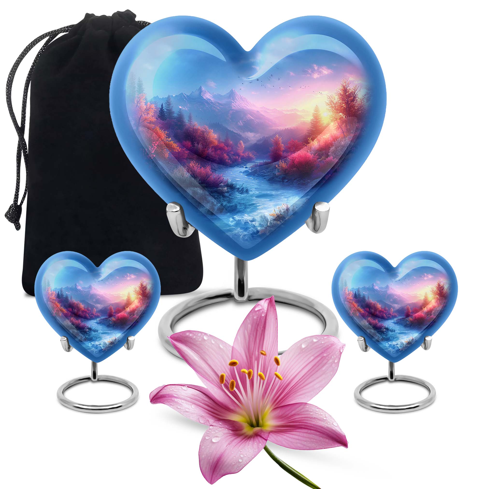 Immerse in the calm tranquility brought by the Heart Urn; an exquisite large-size urn for human ashes, serenely embodying the solace of the mountains. This stunningly abstract-themed work of art, measuring 10 inches in height with a capacity of 200 cubic inches, subtly speaks to the eternal spirit and captivating allure of nature's grandeur. Tucked away securely in a velvet pouch, this medium-sized, lightweight urn, tipping the scales at just 3.3 pounds, is designed from durable and premium quality aluminium. It features the flexibility to personalize with engraved names, allowing a highly intimate and sentimental element. Pervaded with the soft whispers of tender memories, this funeral and memorial urn perfectly cherishes the enduring love and respect for a beloved soul. Reflect on the timeless memories and precious moments, preserved safely within this memorial urn. Express your love and remembrances in a dignified, respectful manner with this eloquent, one-of-a-kind mountains urn.