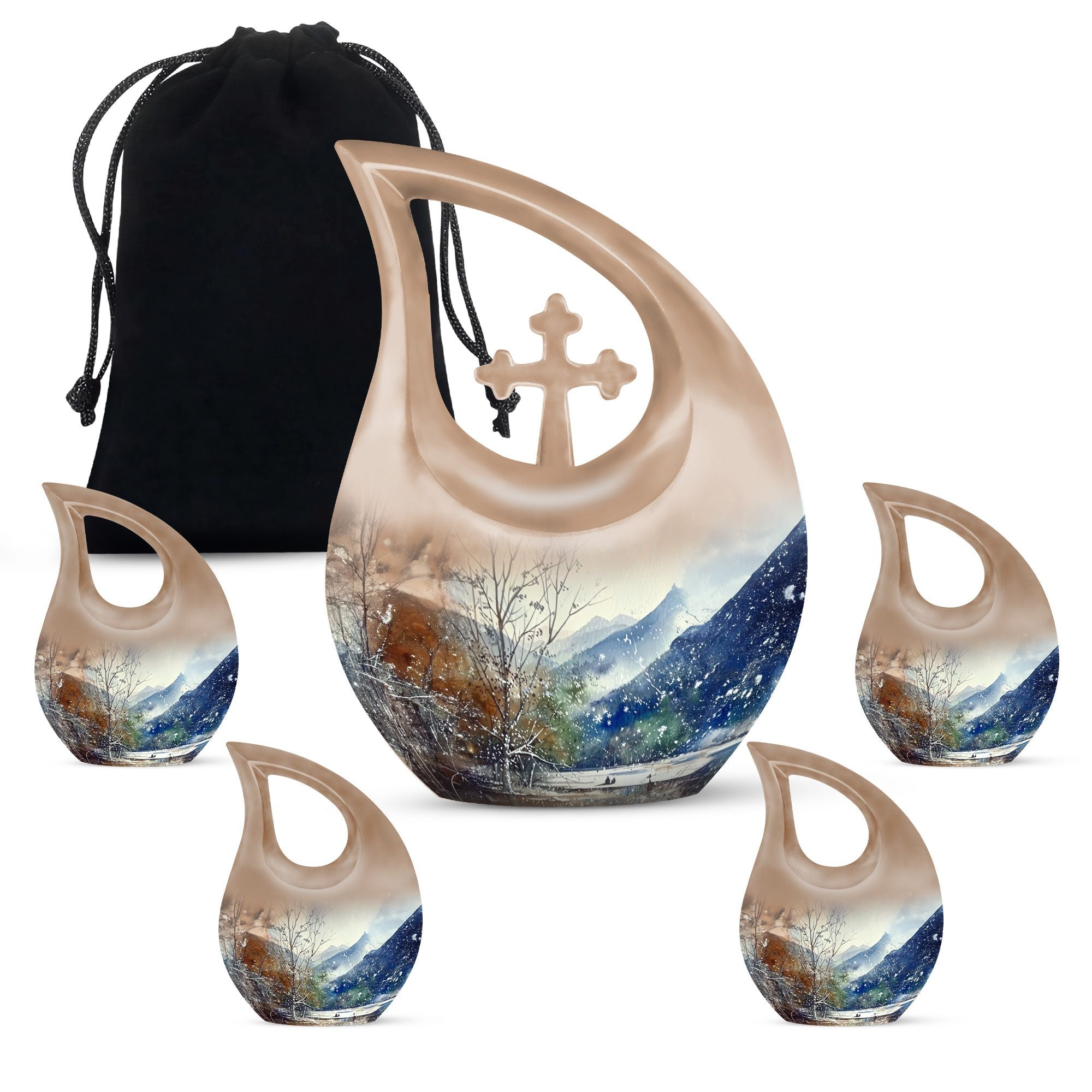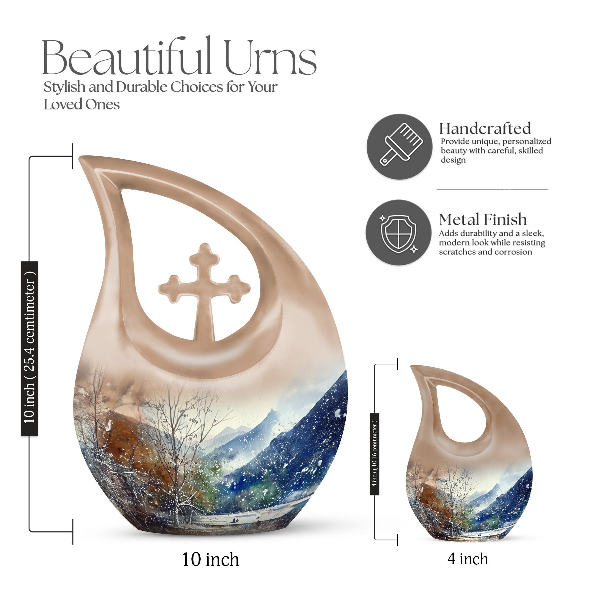 Show your love and respect to departed ones with our mountains urn, a thoughtful selection for memorial urns. Measuring 10 inches in height, this large urn, crafted meticulously from aluminium, balances durability with classic style. This unique urn is softly weighed at 3.3 pounds and offers a spacious capacity of 200 cubic inches, making it an appropriate choice for memorial urns for human ashes. Its solemn theme of mountains subtly communicates strength and resilience. The urn comes equipped with a velvet pouch, ensuring dignified containment of your loved one's ashes. The product offers customization option which allows you to personalize the urn with engraved names, transforming it into a truly unique homage for your loved ones. This exquisite cross drop urn is not just a resting place for ashes, but a beautiful piece of art that blends seamlessly in any corner of your home. With uncommon terminology such as 'cremation monuments, custom made urns for ashes and extra-large urns,' strategically incorporated, you are bound to notice our listing while exploring urn options online. Note that our urns help you hold onto the memories forever.