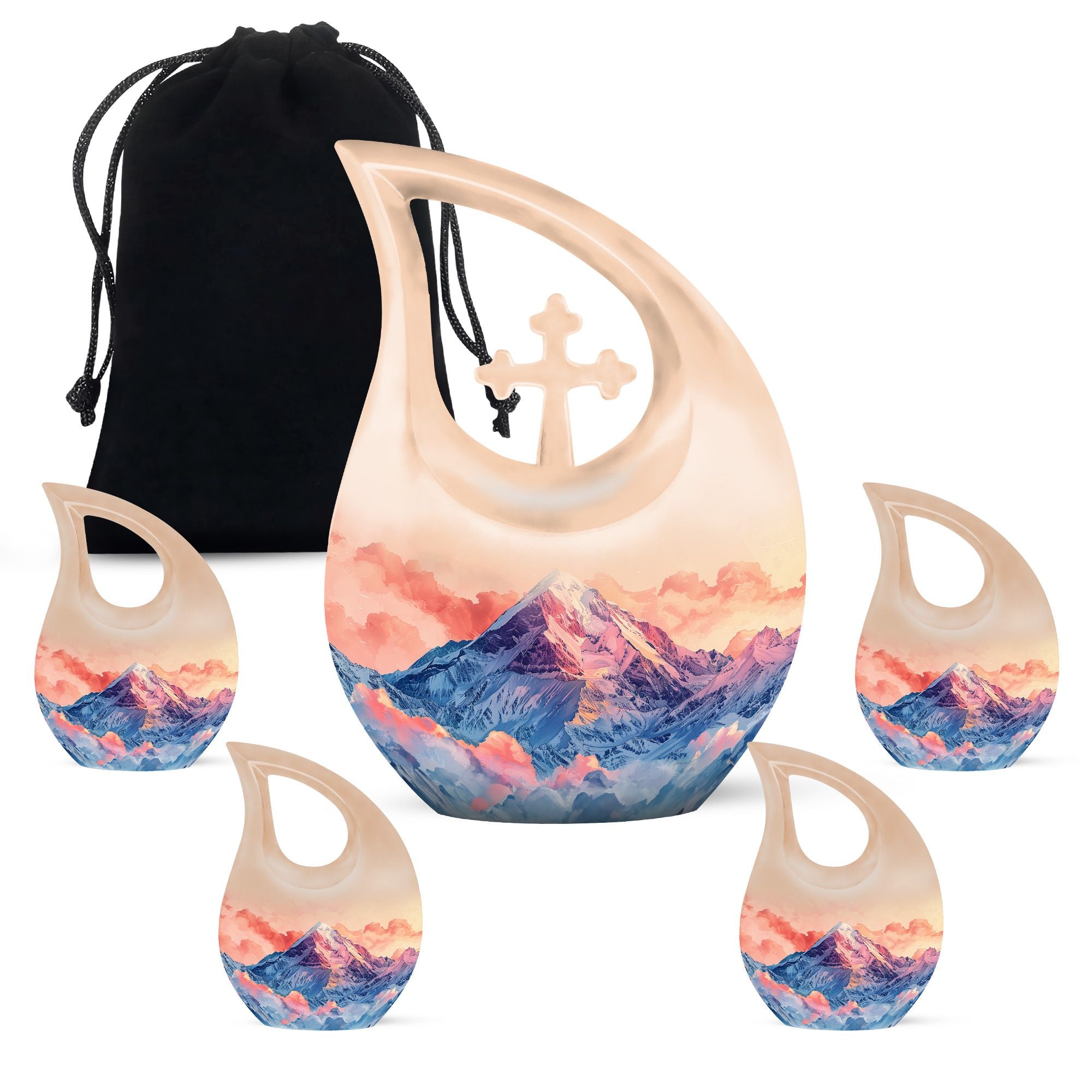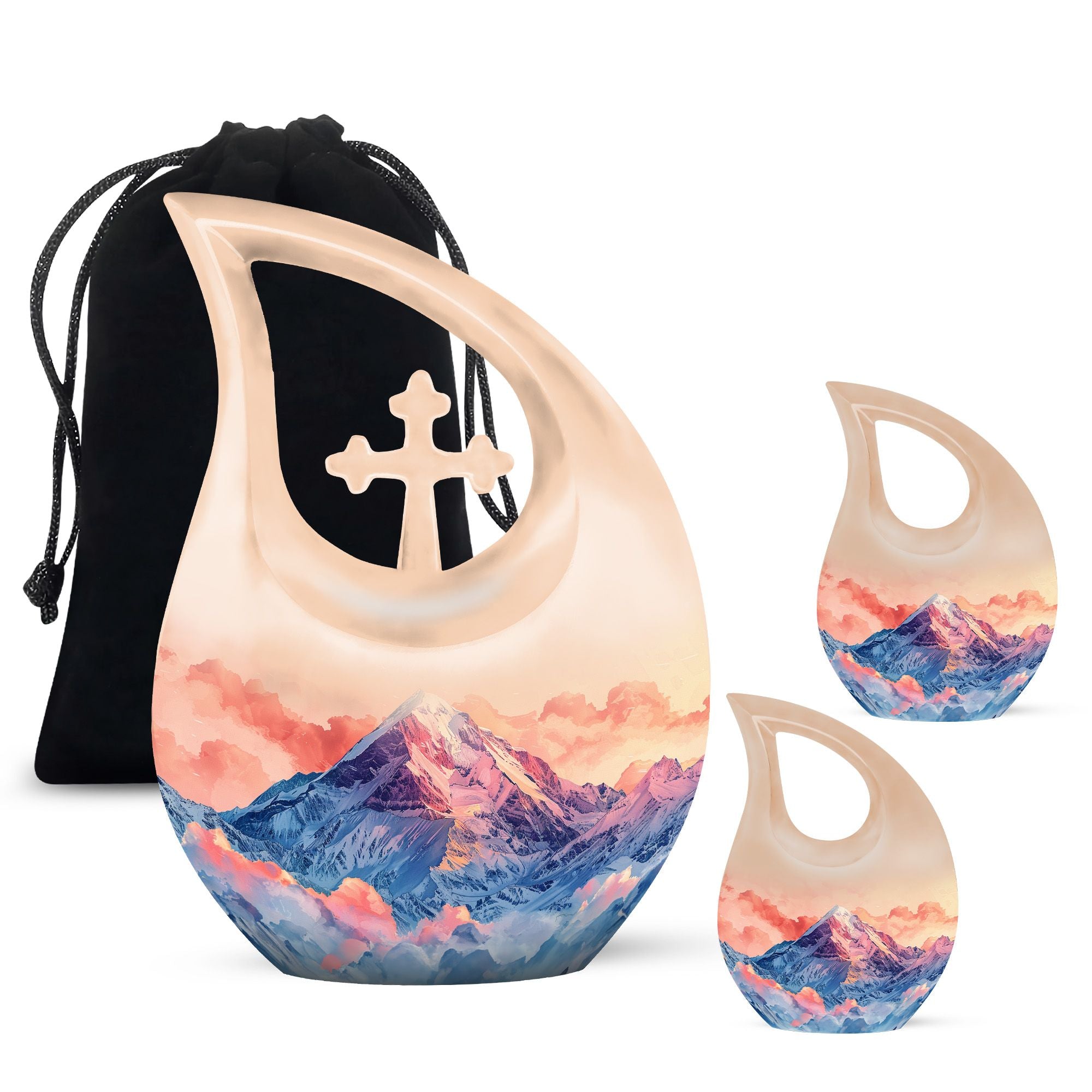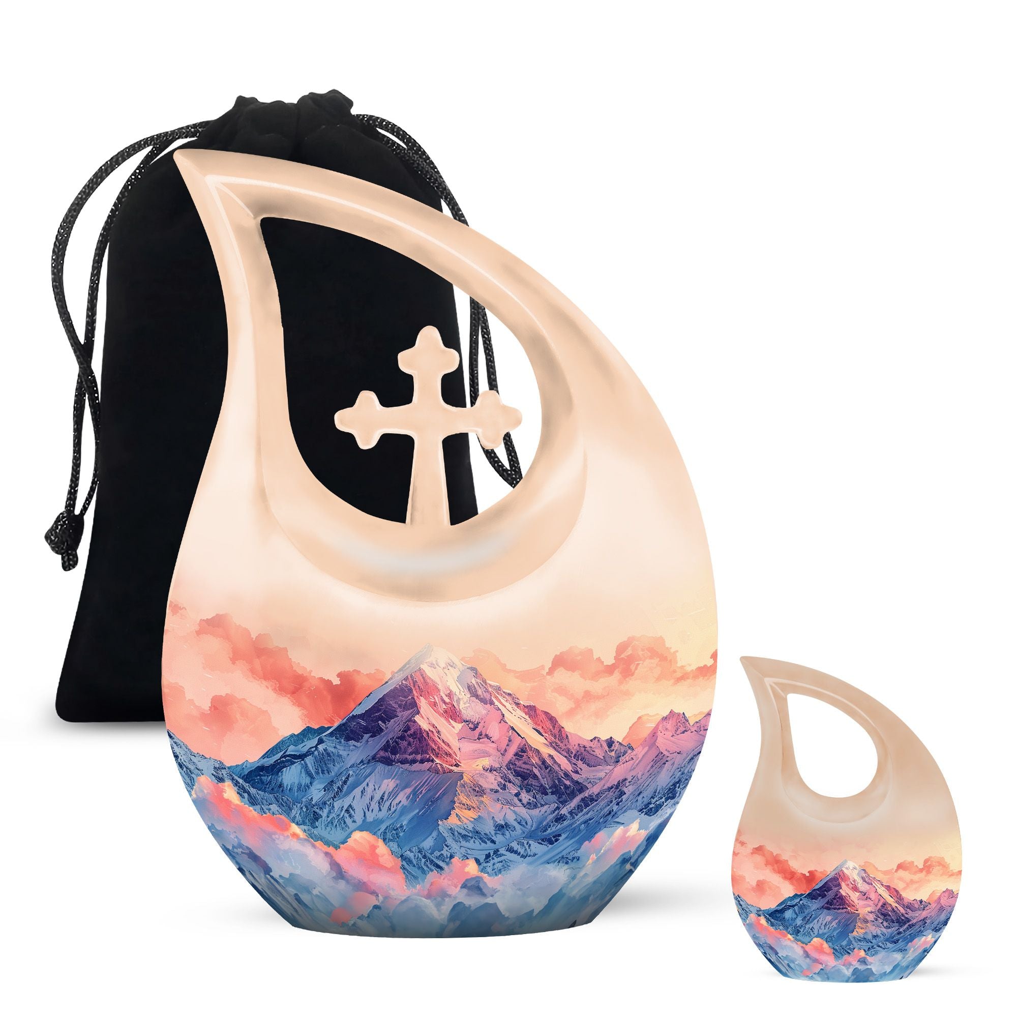 Introducing our 10-inch Mountains Urn, a beautifully conceived tribute to your departed loved ones. Crafted from resilient aluminium, this large urn balances durability with an intricate 'Cross Drop' motif, echoing your enduring faith. Boasting a capacity of 200 cubic inches, it provides ample room while maintaining a compact weight of just 3.3 pounds. Coupled with personalizable engravings, this urn serves as a unique memorial, encouraging individual expressions of remembrance. Adding to its elegance is a plush velvet pouch, ensuring safe containment of ashes and facilitating mobility. Whether you're seeking mini urns for ashes or companion urns, this versatile piece caters to a gamut of needs. Let your commemoration resonate with distinctiveness with our Small and Mountains urn, favouring both echo and singularity. Ideal for those searching specifically for 'memorial urns', 'cremation keepsakes' or simply cherishing the memories upheld by this exquisite keepsake.