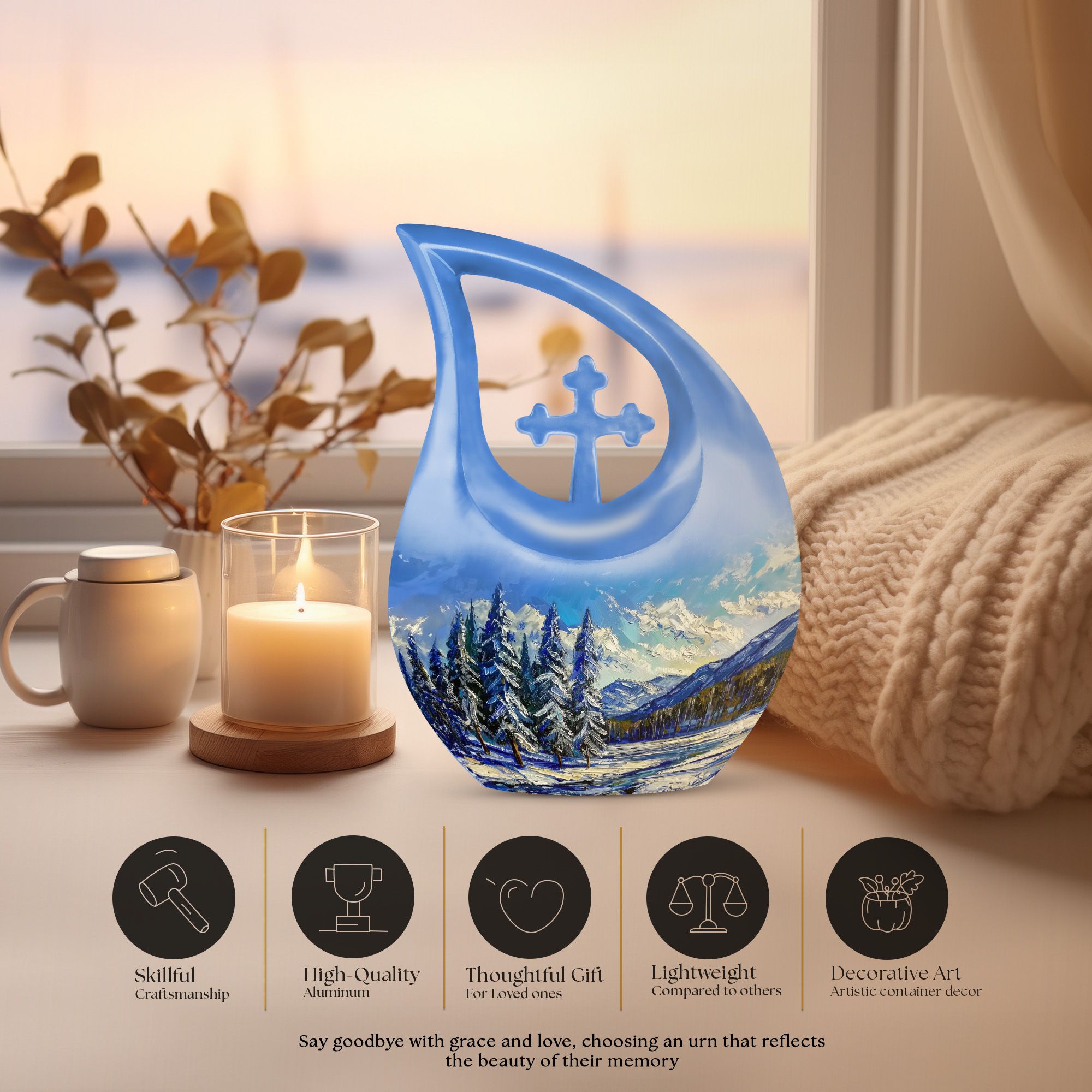 Crafted from durable aluminium, this adult funeral urn features a calming mountain landscape symbolizing eternity, guidance, and life’s enduring journey. Its refined finish and thoughtful design make it one of the unique urns for human ashes, suitable for home display or final resting. Designed as an urn for burial in ground, it includes a secure screw-top lid to protect ashes with care. This piece fits beautifully among cremation urns for burial and burial urns for ashes, blending visual beauty with dependable craftsmanship.