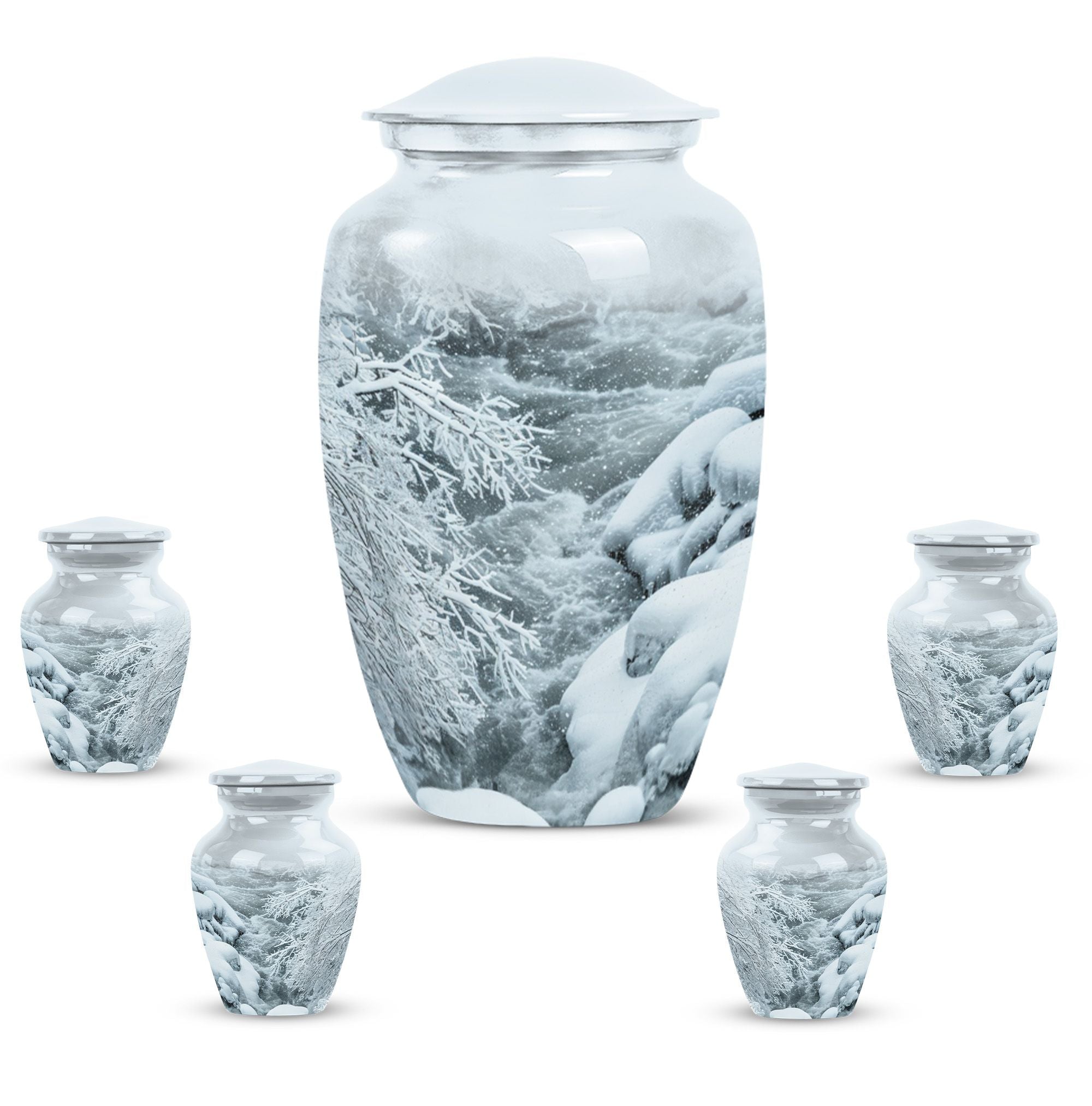 Cherish the memory of your loved ones with our stunning Mountains Urn, a unique memorial urn which serves as a gentle and thoughtful reminder of happier times. This urn combines artistic craftsmanship with functionality, having a height of 10 inches and a burial friendly weight of 3.3 pounds. The urn is constructed with durable aluminium, promising long-lasting preservation. With a large capacity of 200 cubic inches, it can comfortably contain ashes in a velvet pouch, included with your purchase. In addition, the urn offers customization options. You can personalize it by engraving names of your beloved, ensuring their memory lives on. This abstract-themed urn is not just a container for ashes, but a tribute to the departed soul. Suitable for both, men and women, the Mountains Urn is part of our Medium Size Urns range. Infuse your memoriam with tranquility and elegance with the classic and artistic urn. Note: The urn size and capacity are conducive to burial in-ground.