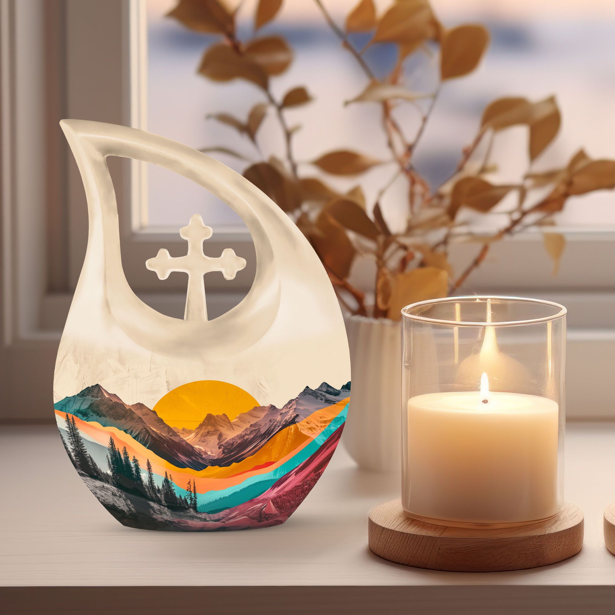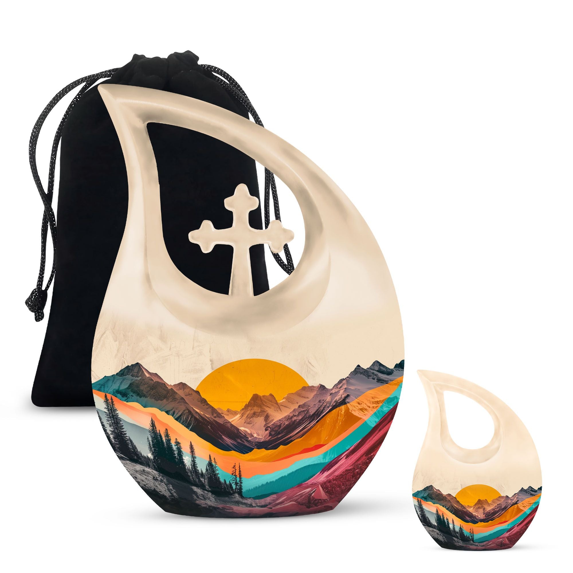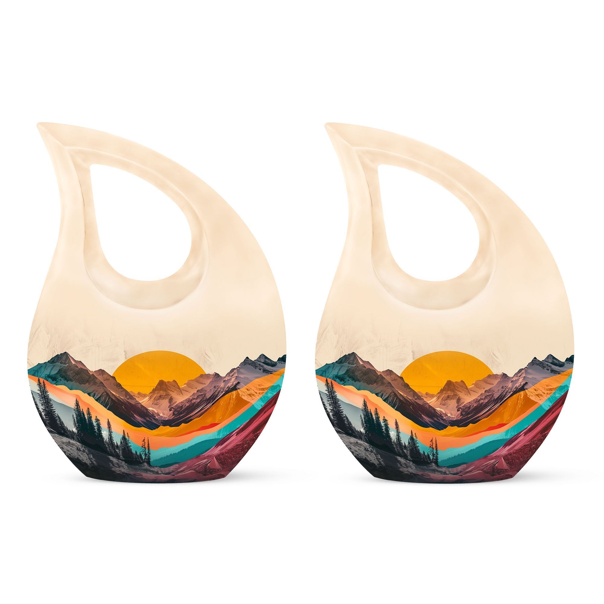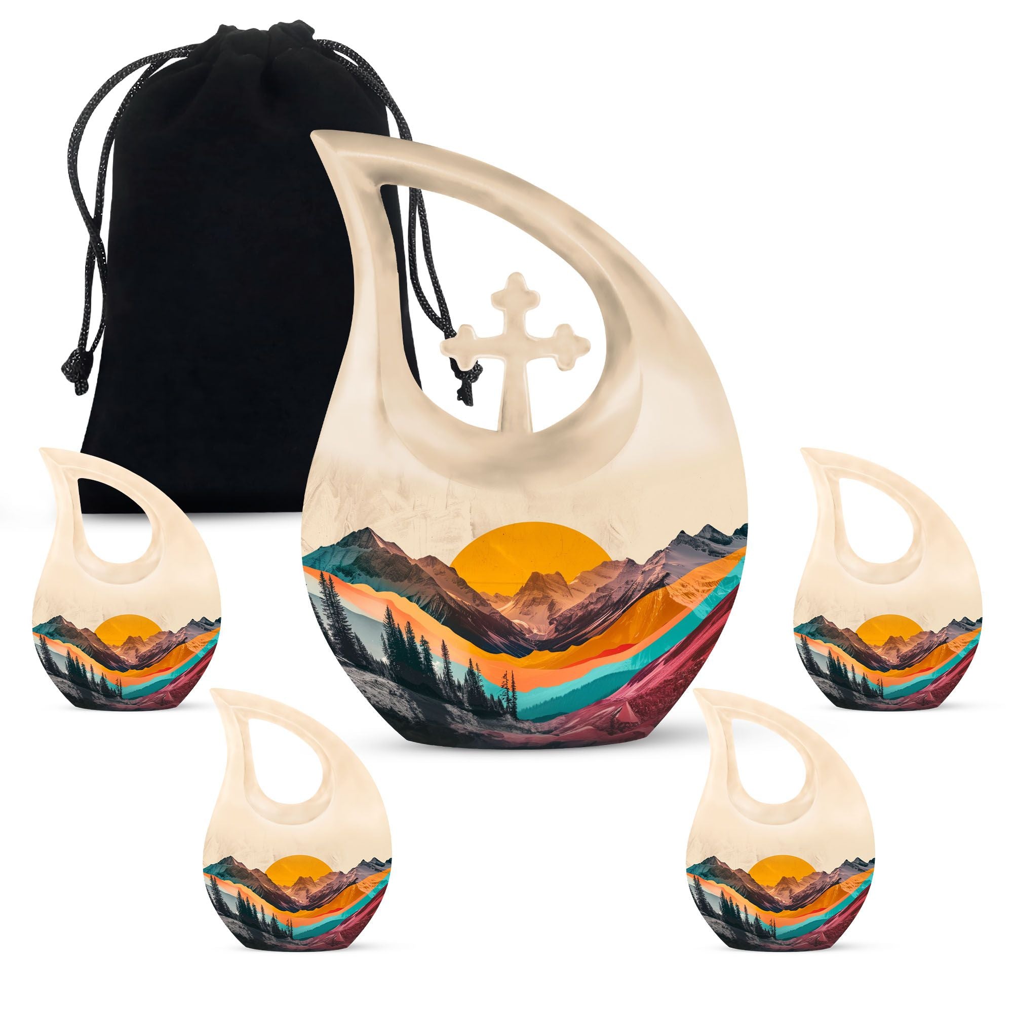 Crafted from durable aluminum, this adult cremation urn features a breathtaking mountain valley design in rich natural hues that reflect dignity and tranquility. The polished surface and secure screw-top lid ensure protection and timeless elegance. Available as a cremation urns set, it includes smaller cremation ashes keepsake urns — perfect for family members to share in remembrance. Each piece in this cremation urns for human ashes adult set is designed to safeguard precious memories while bringing visual harmony to any memorial display.