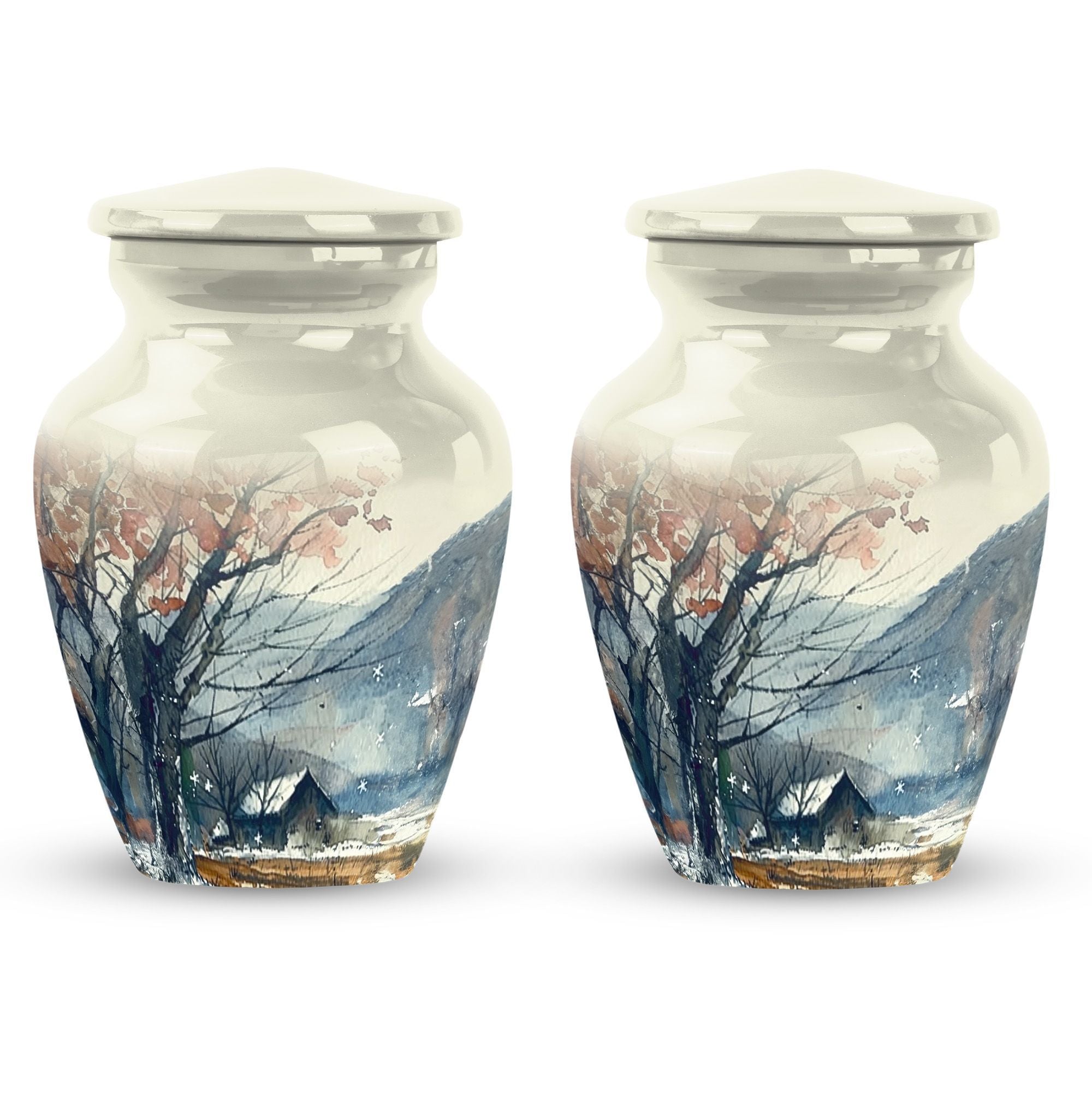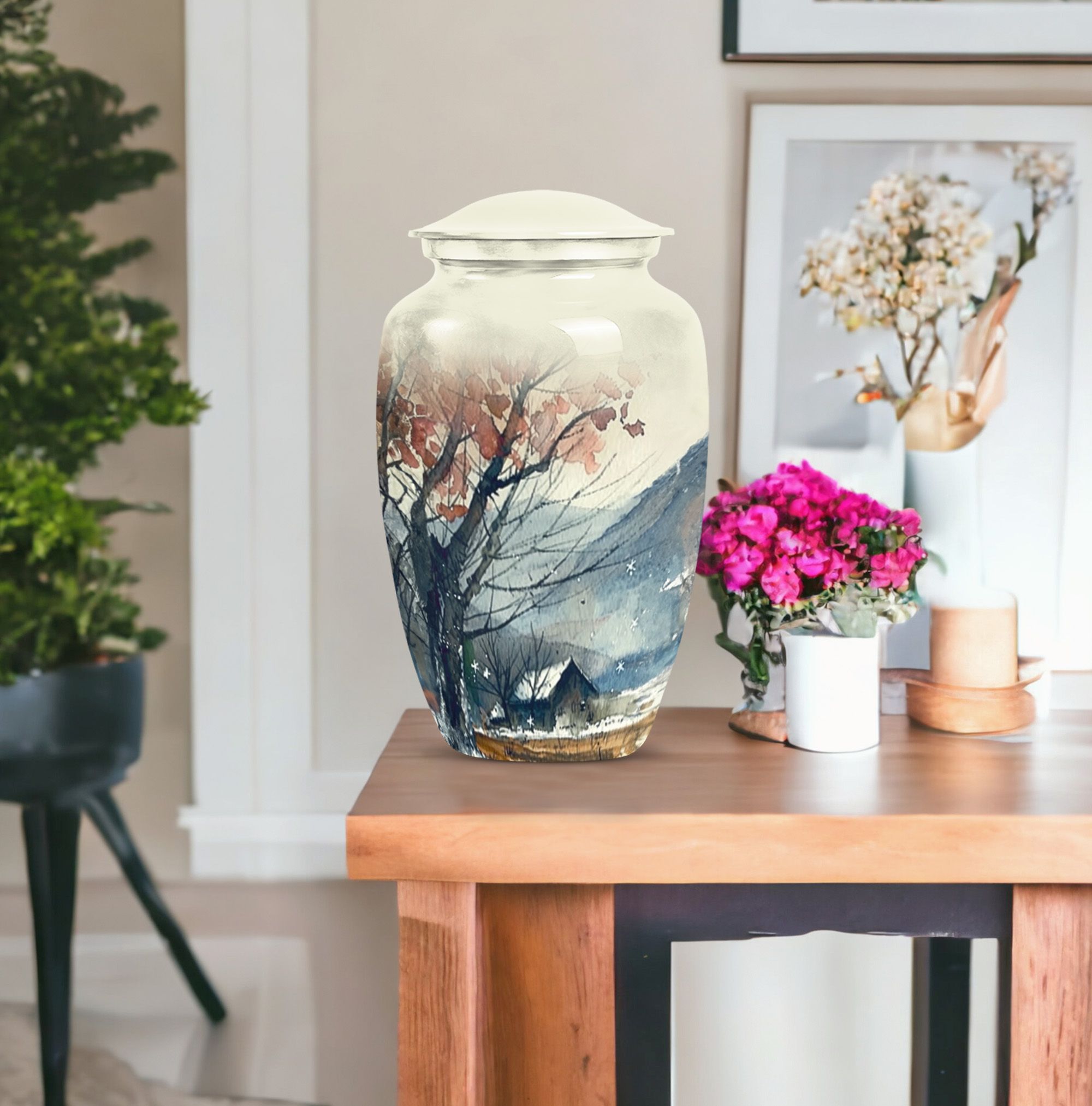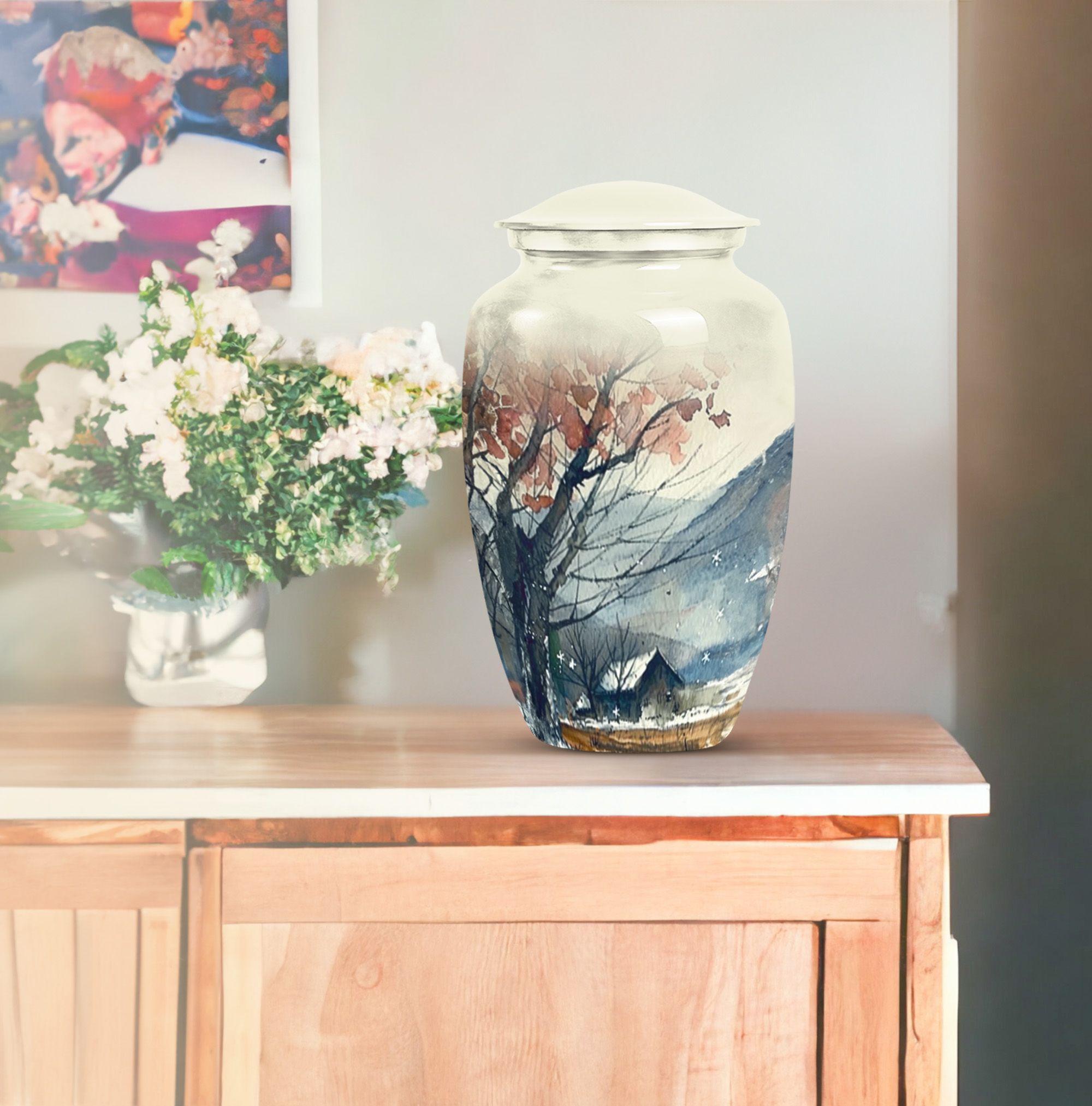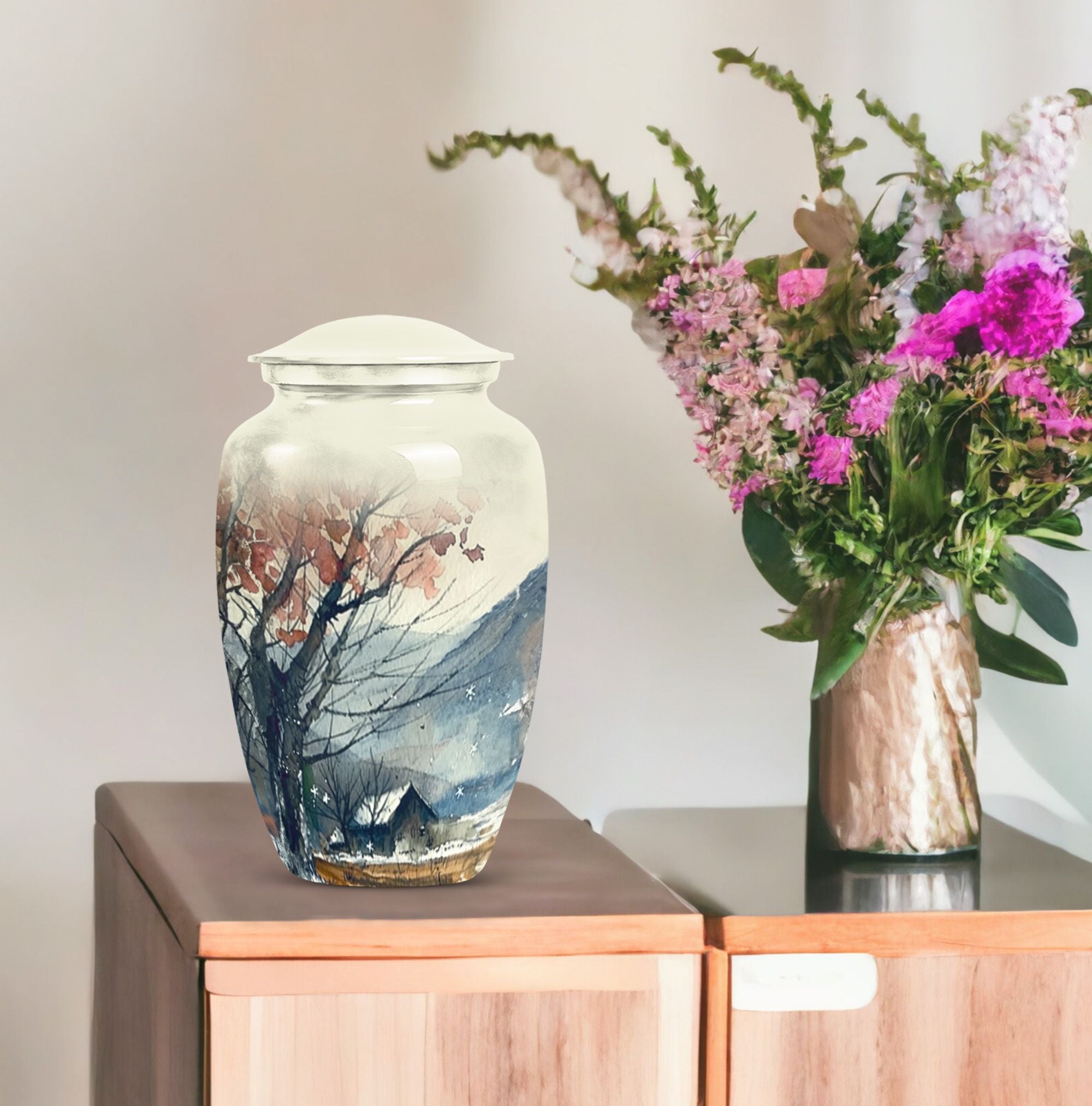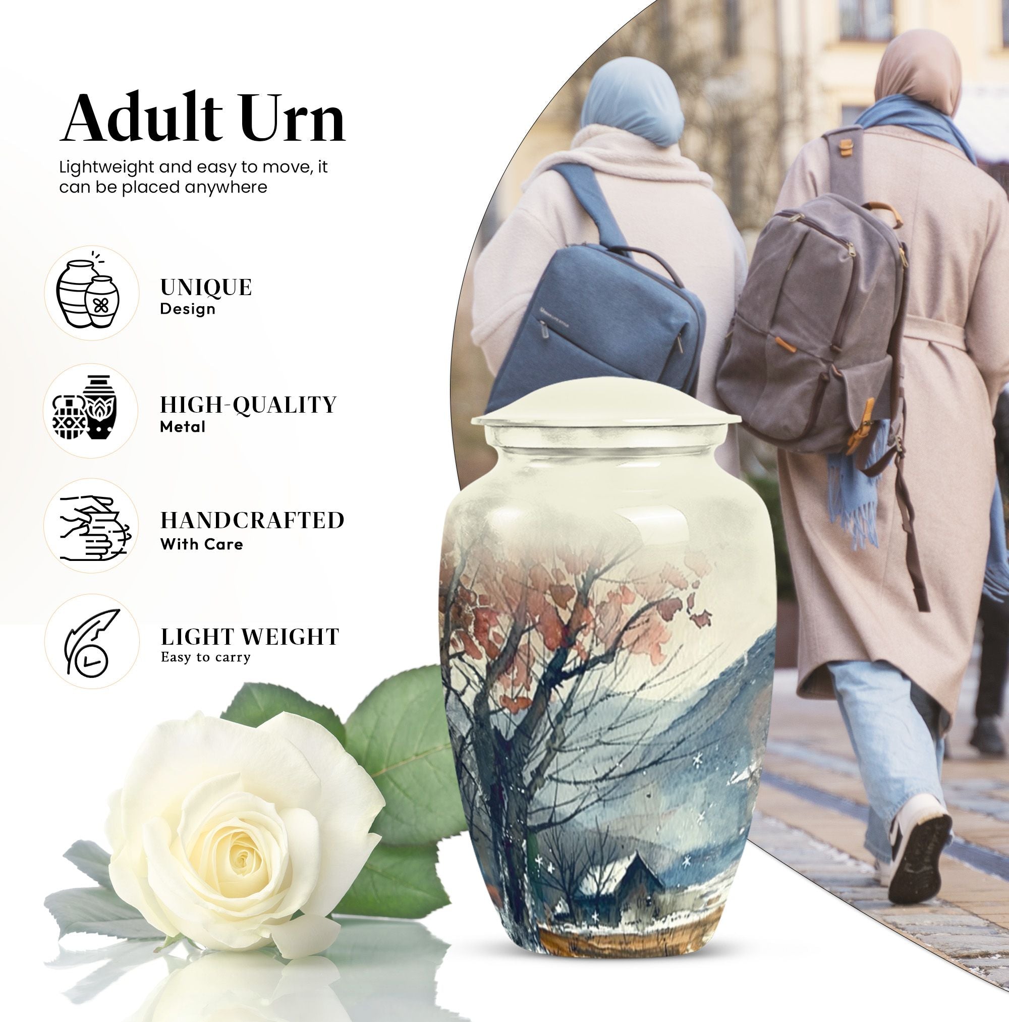 Experience a profound sense of peace with our meticulously crafted Mountains Urn. Made from premium quality aluminium, this urn is designed to hold up to 200 cubic inches of ashes, making it perfect for adults. This abstract-themed, large urn comes with the potential for customization - allowing you to personalize it with engraved names for that sentimental element. The classic 10-inch high urn is not just a burial funeral cremation urn, it also serves a decorative purpose, blending gracefully with your home decor. Weighing just 3.3 pounds, this urn isn't cumbersome, and its dimensions ensure it fits perfectly in various spaces. Each purchase includes a velvet pouch to securely hold the ashes. Whether you’re searching for 'cremation urns for human ashes adult male,' 'urn human ash urn adult ash woman,' or 'man metal cremation urn', our Mountains Urn is an ideal choice, carefully bridging the gap between memorial urns and aesthetics.