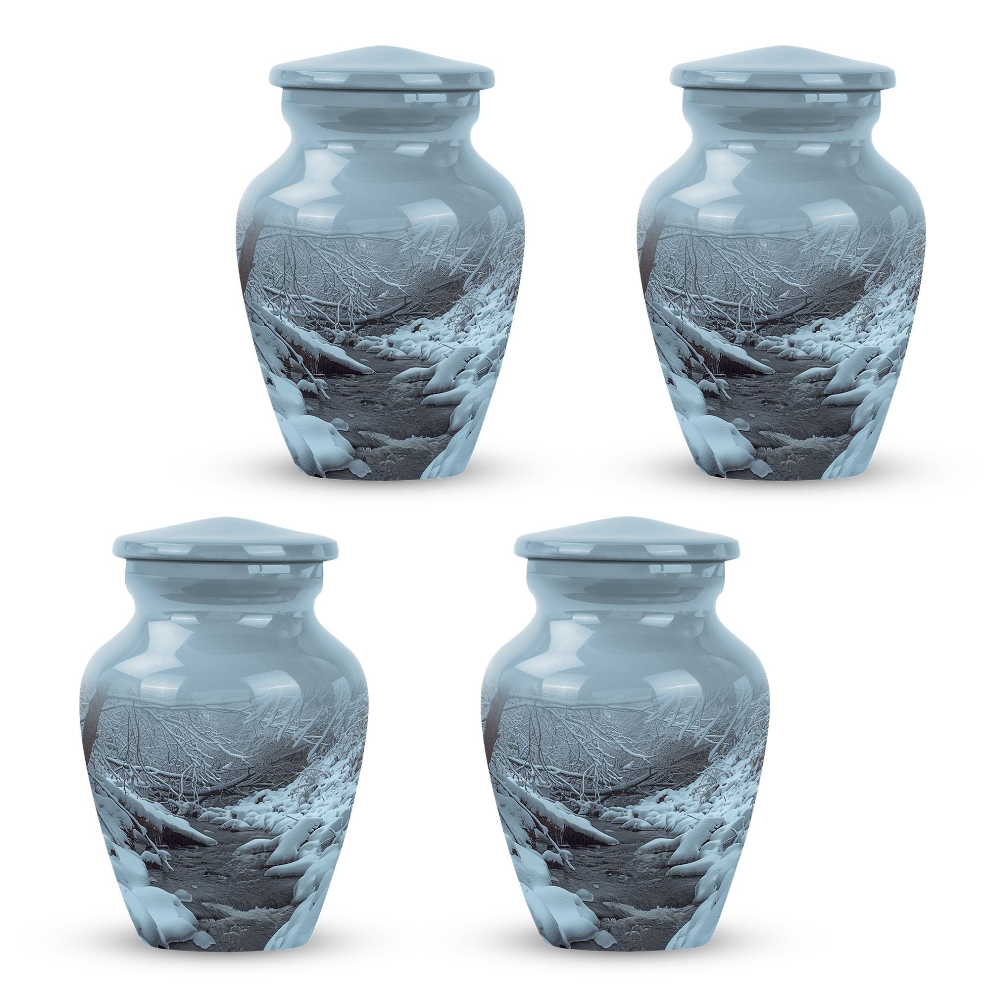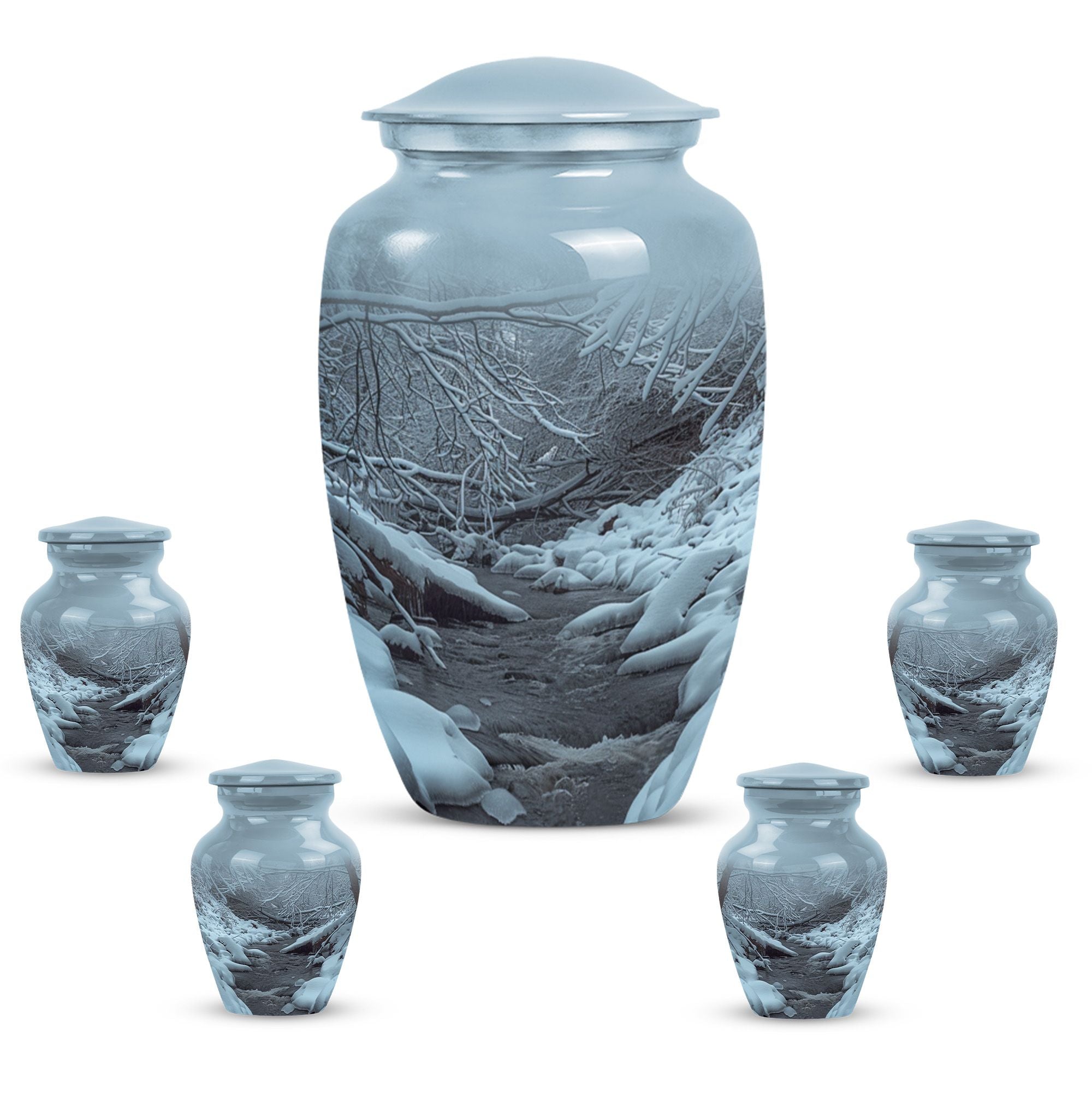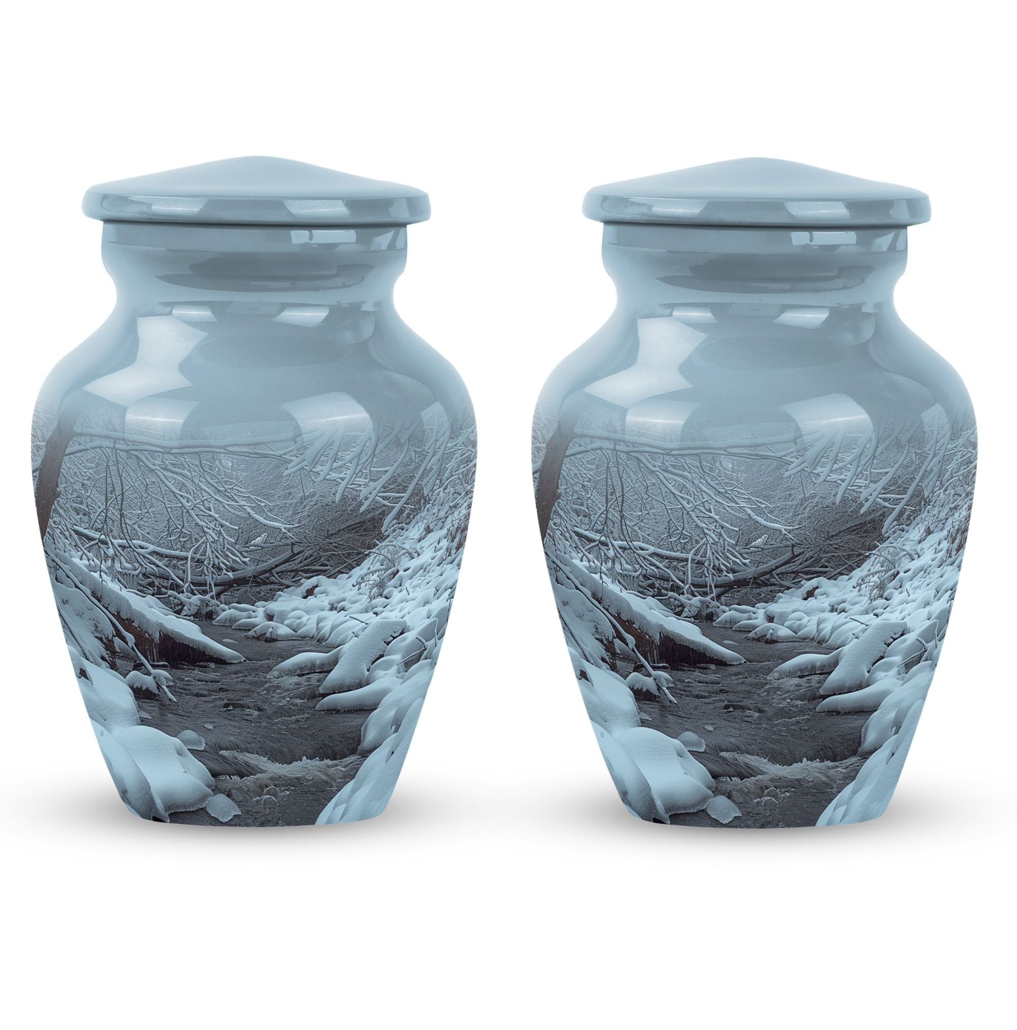 This 10-inch Mountains Urn is a dignified tribute and an ideal choice for memorial ceremony supplies. As a grand, large urn, its capacity holds up to 200 cubic inches for the containment of cremation remains. Crafted from high-quality aluminium, this funeral urn for men, bears an abstract theme, effectively mirroring individuality. Its weight affirms its sturdiness, being 3.3 pounds, conveying durability and resilience. The product arrives elegantly packaged with a dedicated velvet pouch, provided for the containment of ashes. Unique personalization options are available, allowing for an engraved names addition, adding an exceptional touch to commemorate a loved one's memory. This traditional, yet distinctive abstract themed urn, resonates reliability, ensuring a resolute and substantial memorial for your loved one. Ideal for those looking for memorial human urns for ashes, urn human funeral urns, burial urns or metal urns, this product presents a timeless choice.