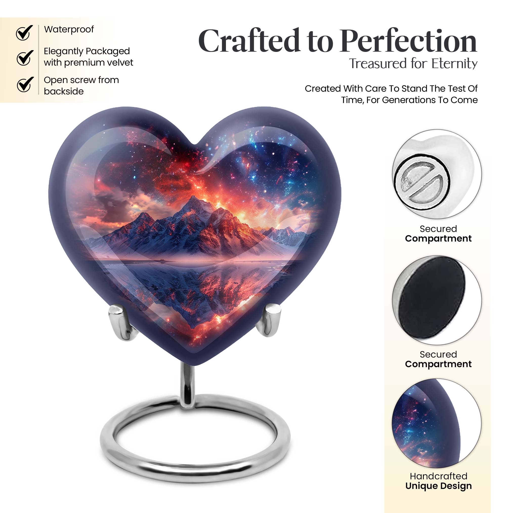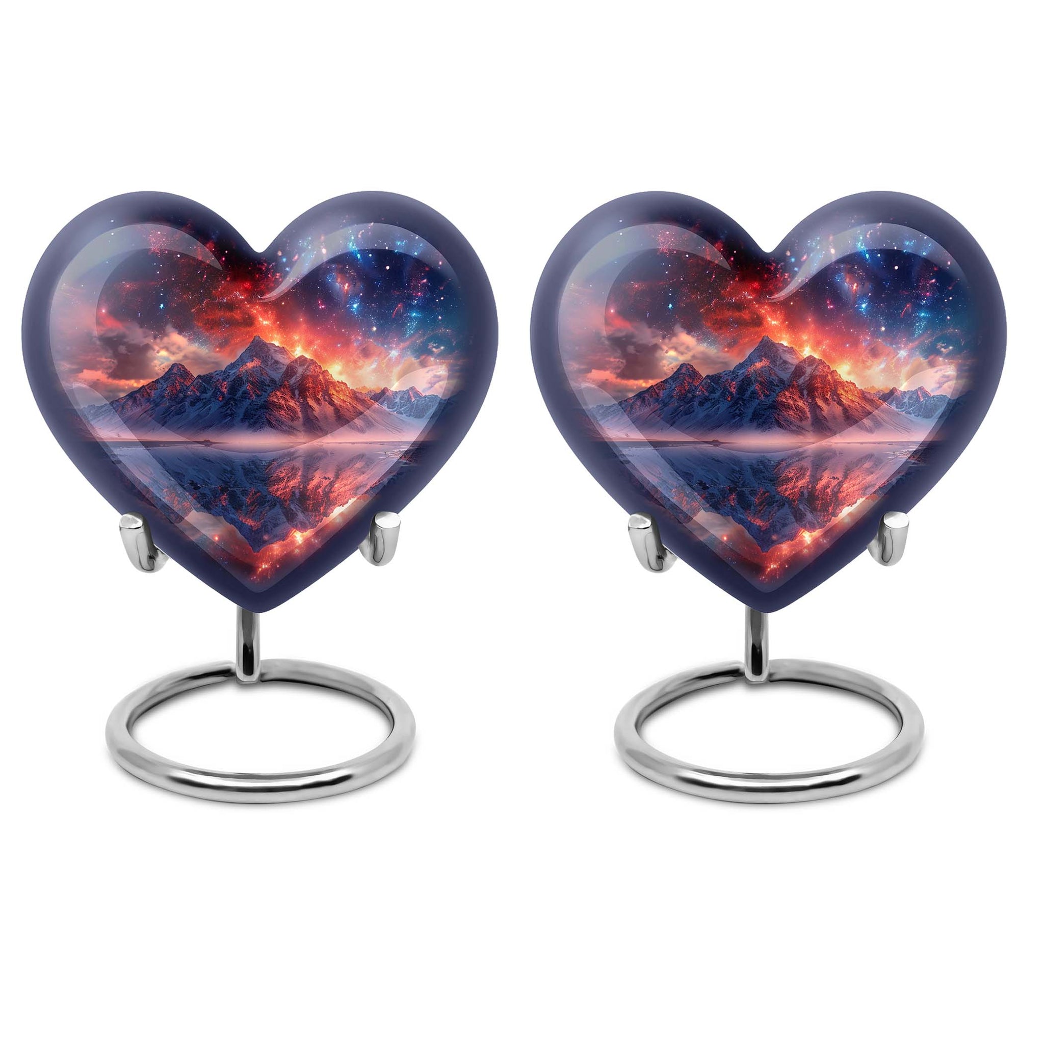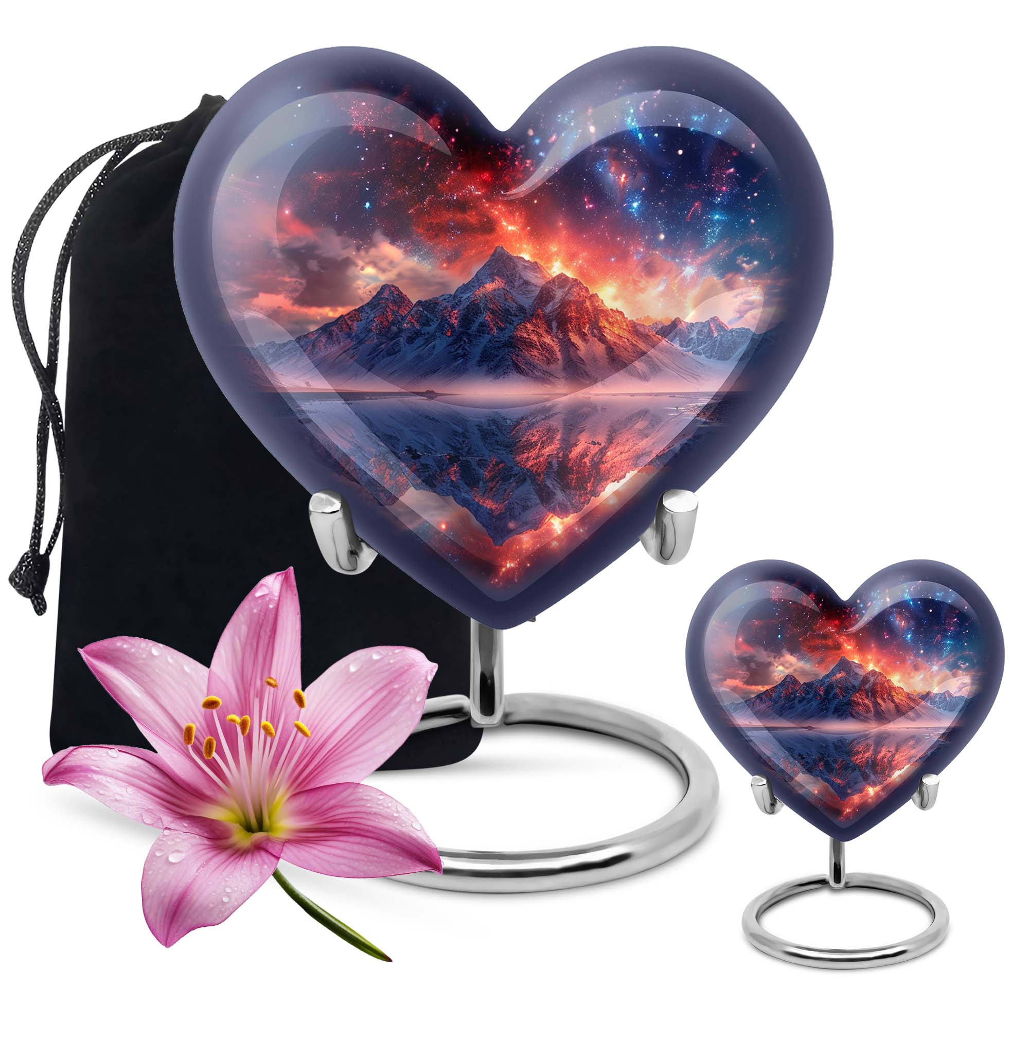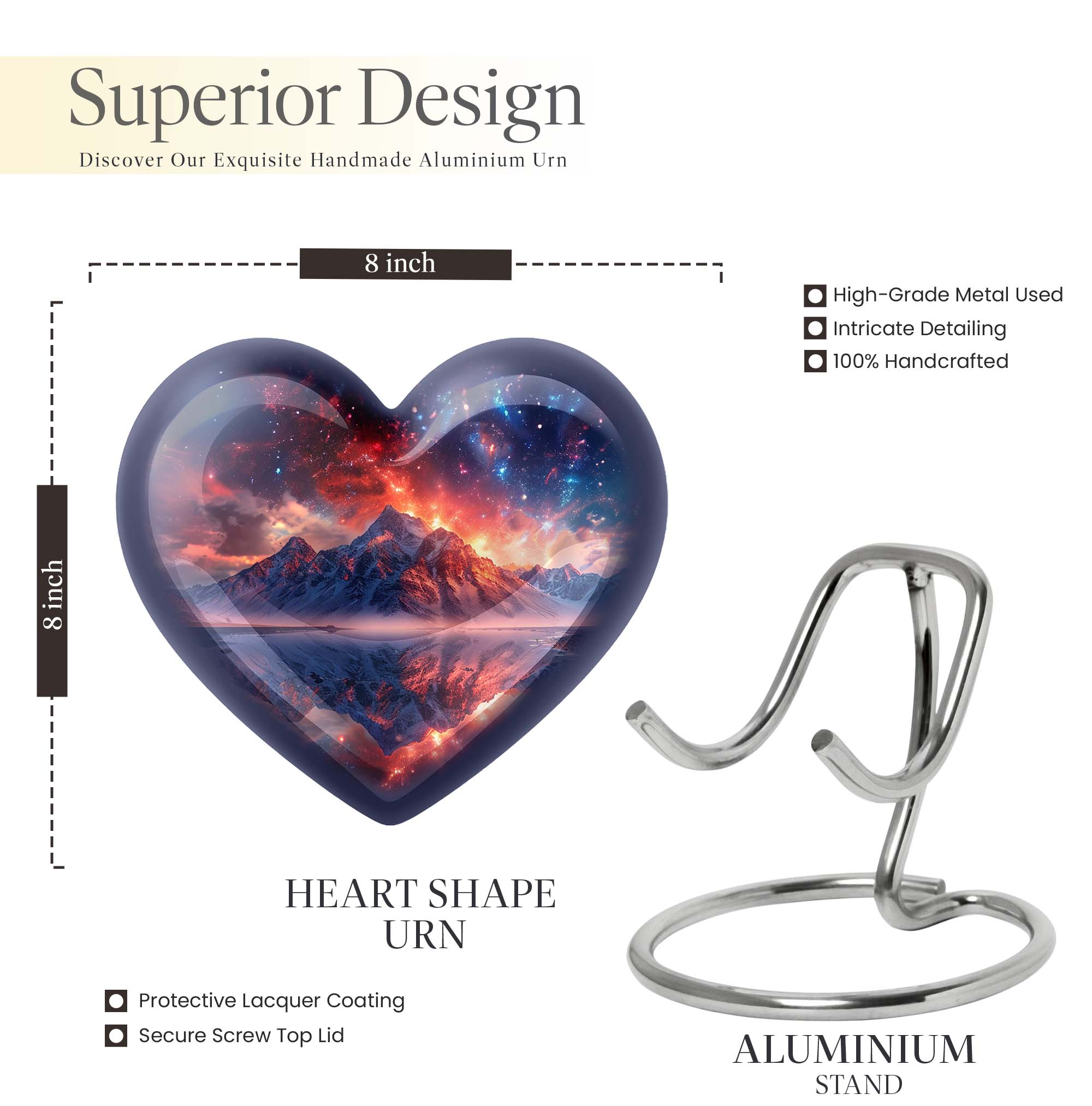 Preserve the memory of your loved ones with our beautifully crafted 10 Inch Heart Urn. Fashioned from quality Aluminium, this 'mountain urn' is a perfect memorial urn that displays the love and respect you have for the departed soul. Beyond simply a burial ash urn for humans, it's a symbol of reverence and everlasting bonding. The urn is sizeable with 200 cubic inches capacity, perfect for storing adult cremation ashes. Amid its abstract theme, lies a unique distinctiveness, setting it apart from the usual urns for adult cremation ashes. We understand the need for personal sincerity, and thus, offer you an option to customize this large urn with engraved names. The package includes a velvet pouch designed for secure containment of ashes. Weighing 3.3 pounds and 10 inches in height, it’s a tangible size, yet lightweight for mobility. Perfectly suited for both adult female ashes and urn human ash adult male. Break from the norm and celebrate in memoriam with this unique urn!
