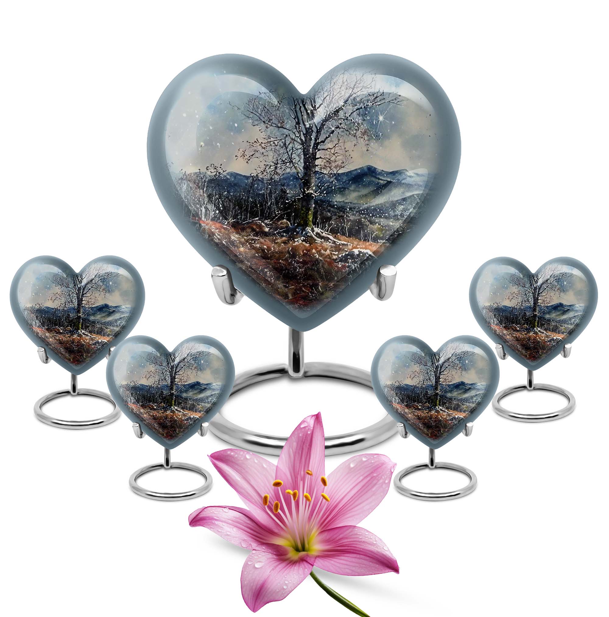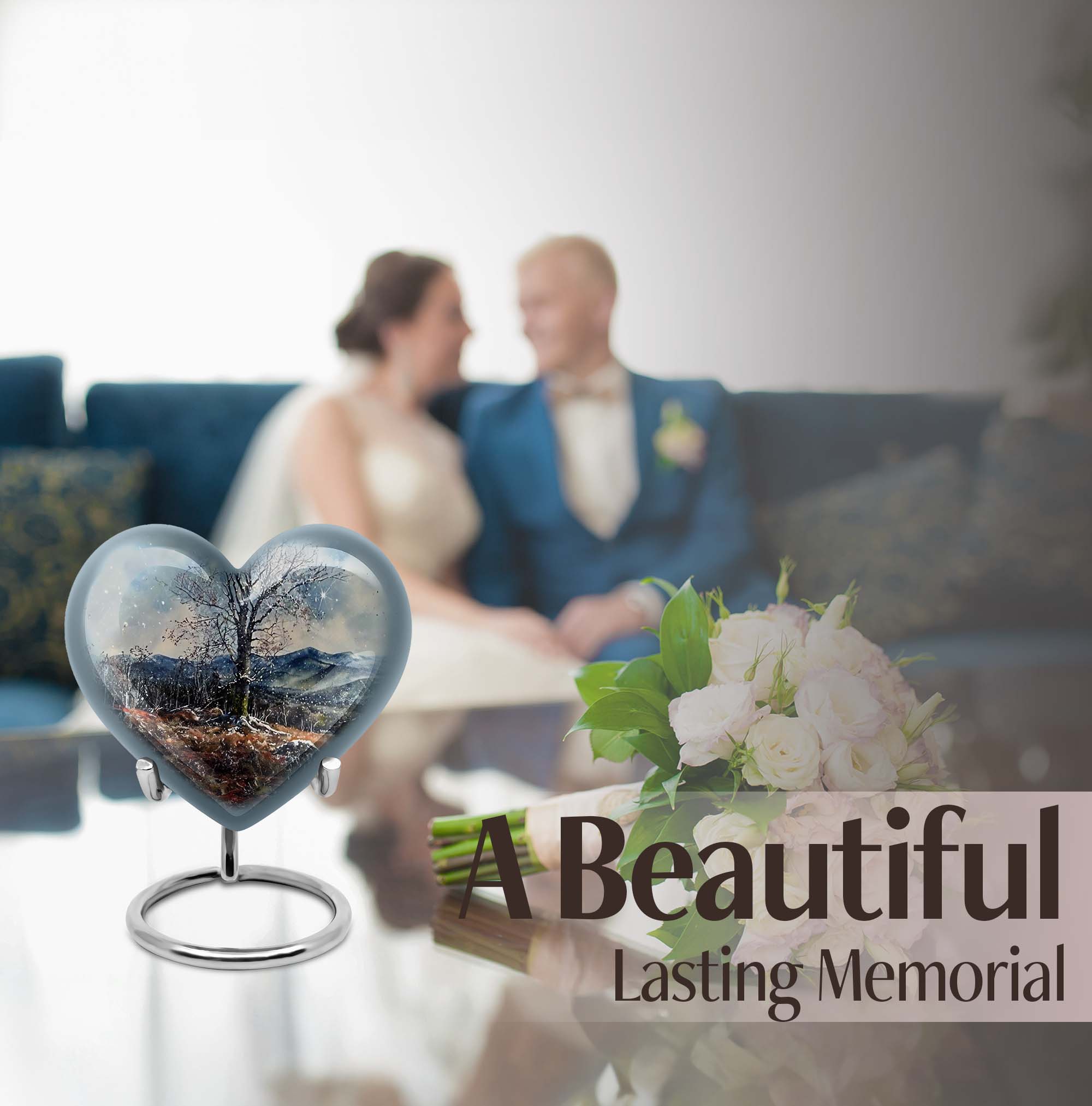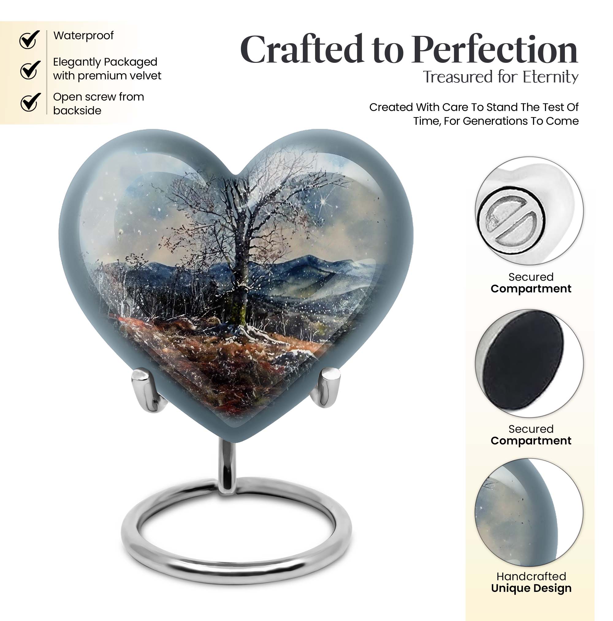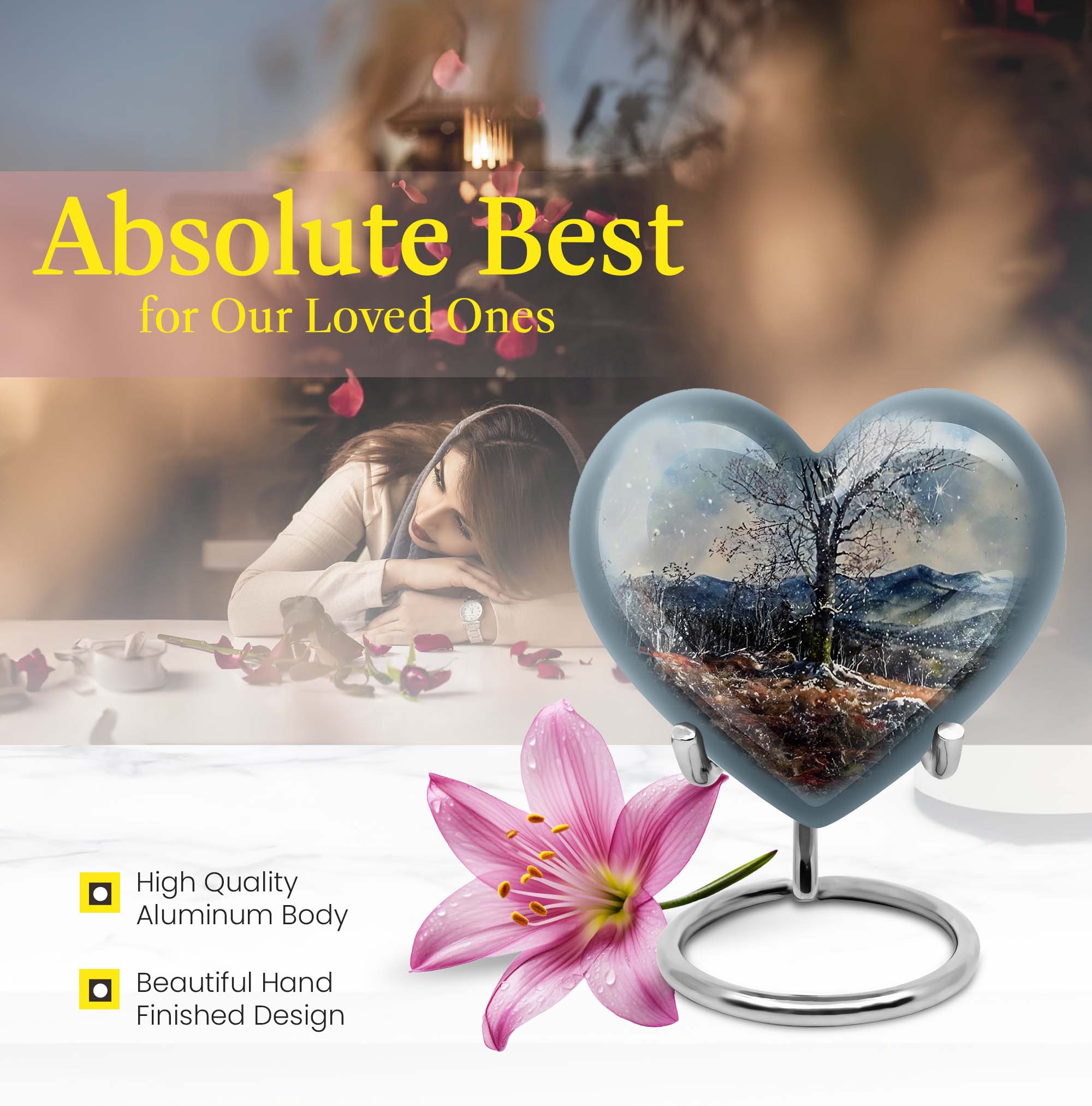 Memorialize cherished ones with a unique Mountains Urn that blends elegance with enduring design. Fashioned from high-quality, robust Aluminium, this heart-shaped urn, designed specifically for adults, measuring 10 inches in size, ensures a lasting resting place for your lost loved one. This tasteful abstract-themed urn is of significant dimensions—10 inches in height, holding a capacity of 200 cubic inches. While the urn alone makes a thoughtful commemoration symbol, it comes with an option to personalize with engraved names, making it truly special. Carefully designed to be weighty yet manageable at 3.3 pounds. Included is a velvet pouch perfect for containing ashes. Beyond its functionality, this large urn is elegant enough to adorn any household shrine or mantle. This piece is tailored for those looking towards making their memorial options as unique as the person gone. Keywords: Mountains Urn, memorial ash urns, Funeral urn for men's ashes, adult ashes men, Elegant urns.
