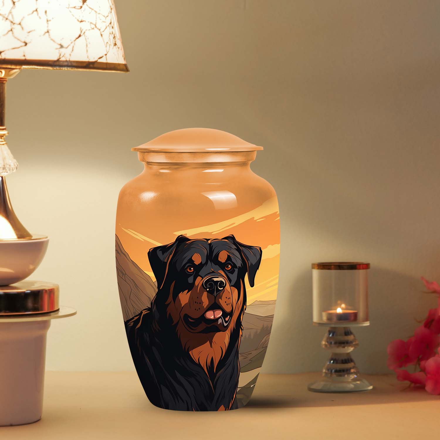 The Orange Sunset Mountain Dog Memorial Urn – Rottweiler Cremation Urn captures the beauty of devotion and peace shared between dogs and their owners. Framed by a breathtaking mountain sunset, this urn symbolizes love, strength, and serenity — a masterpiece among dog memorials and keepsakes. Perfect for remembering your cherished Rottweiler or any beloved pet, it radiates warmth and eternal loyalty.