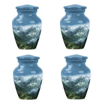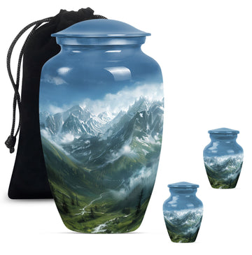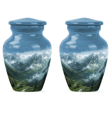 Paying tribute to a departed loved one feels exceptionally heartfelt with our 'Mountains Urn', from our funeral burial urns collection. Carefully crafted from durable aluminium, this large urn stands 10 inches in height and is substantial, weighing in at 3.3 pounds. It possesses a stately presence and a comforting weight. Our classic urn is designed to securely hold up to 200 cubic inches of ashes. This cremation urn effortlessly combines practicality with sentimentality through its 'Purple Meadow' theme, illustrating serenity and peace. Your purchase includes a velvet pouch, adding an extra layer of protection for your loved one's ashes. The urn provides an option to engrave names, offering a more personalized touch. Please note, the 'Mountains Urn' is one of our memorial large urns for human ashes, effortlessly balancing elegance and durability for a lasting tribute.