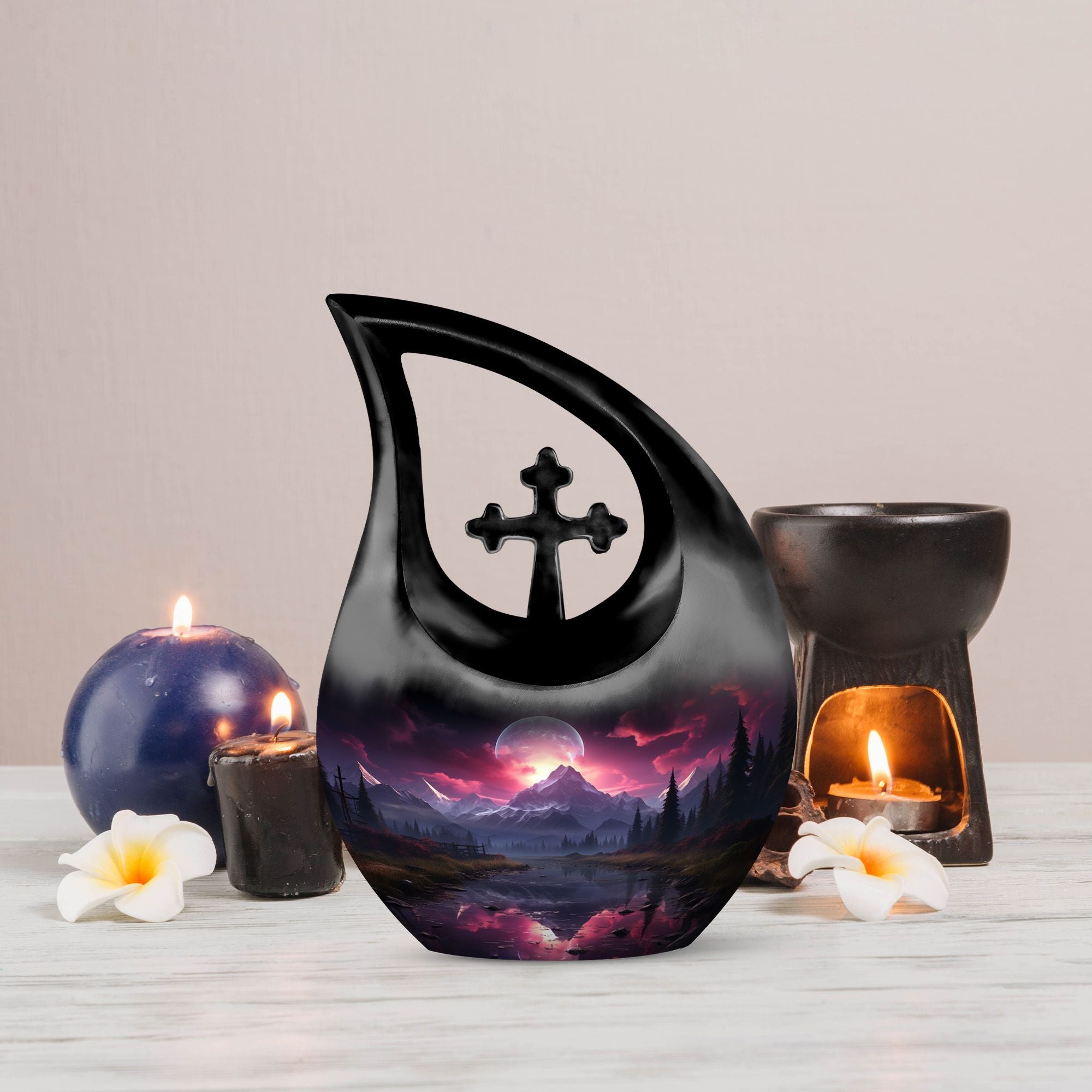 Honor cherished memories with the Beautiful Mountain Sunset Artistic Cremation Keepsake Urn for Ashes, designed to bring peace and beauty to remembrance. This elegant piece is ideal for those seeking large decorative urns or funeral urns for human ashes adult, capturing the serenity of a sunset over tranquil mountains. Its artistic finish reflects eternal love and harmony, offering a dignified resting place for your loved one.