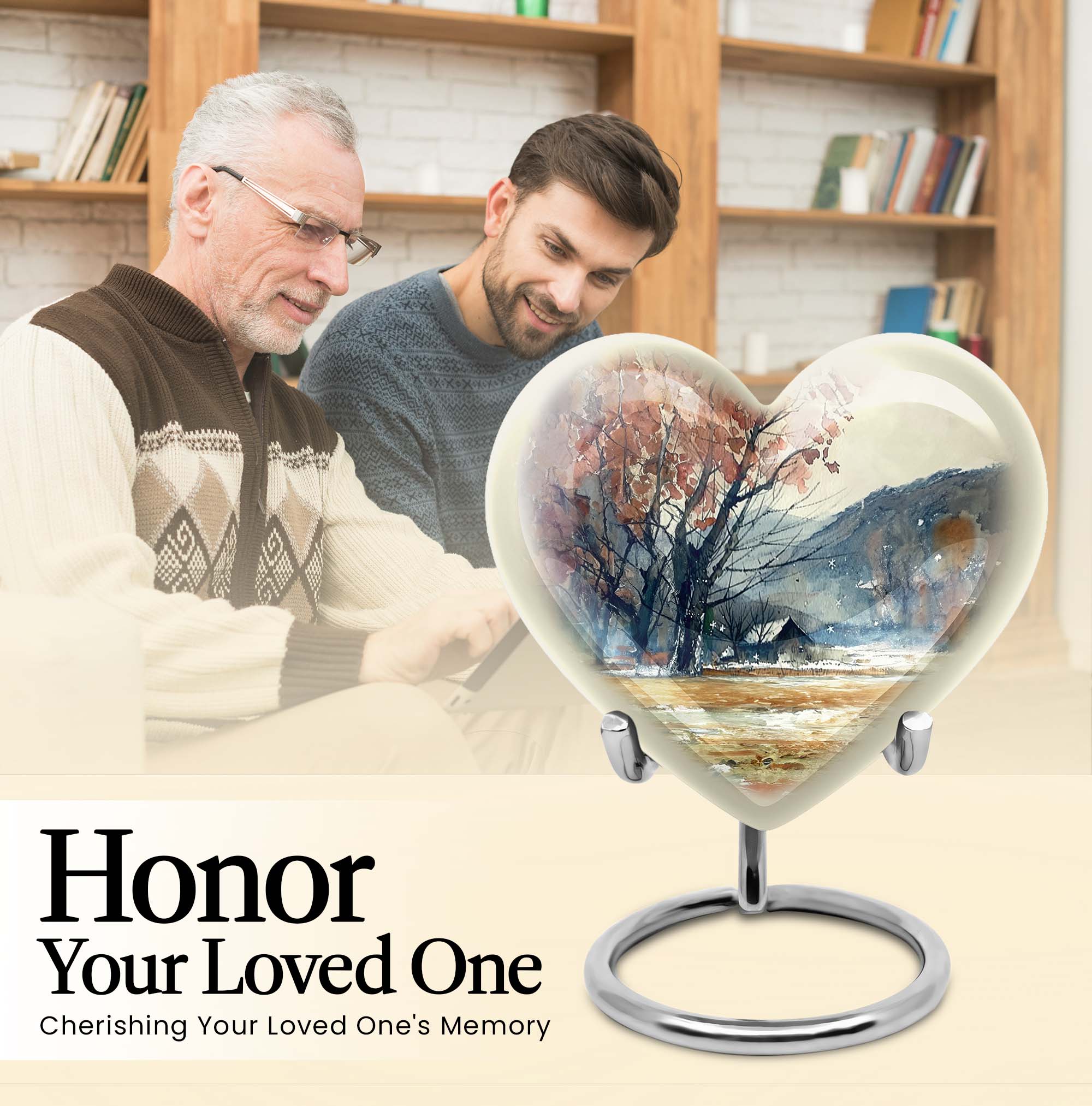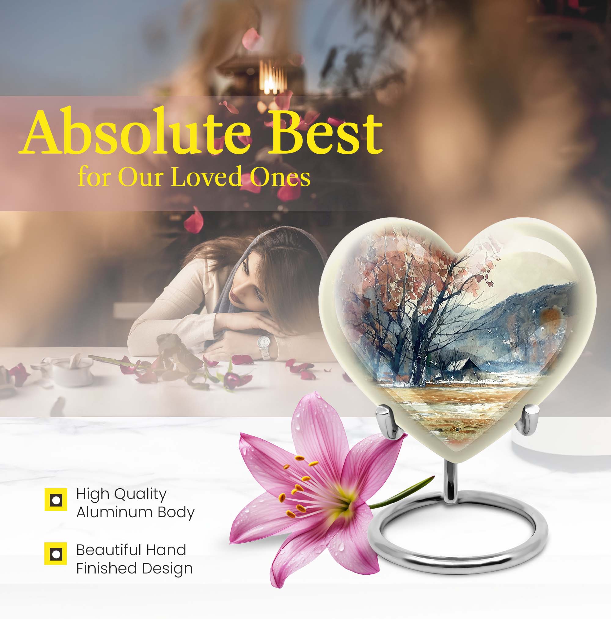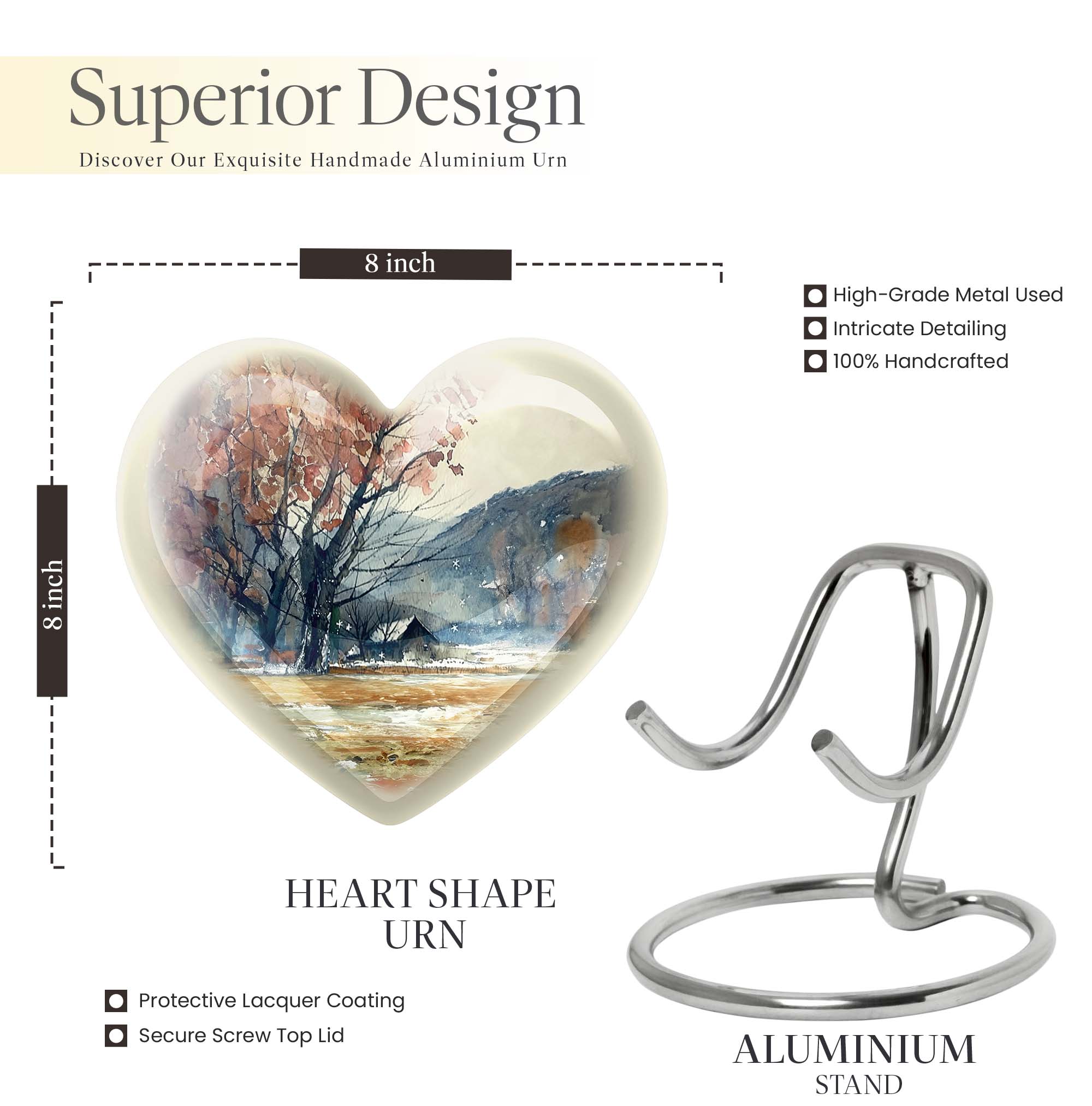 Honor and celebrate your loved one's memory with this breathtaking Mountains Urn, artistically crafted for those who seek not just a burial vessel, but a work of beauty. This substantial 3.3 pound, 10-inch Large Urn, designed with exquisite heart detailing, is the perfect tribute to your cherished one. Finished in durable aluminium, the heart urn symbolizes eternal love and memory. It offers a generous capacity of 200 cubic inches, to securely hold the ashes. Accompanied by a plush velvet pouch, it ensures safe and respectful containment of the remains. For a unique touch, the urn can be personalized with engraved names, making it an extraordinary and sentimental memorial urn. Ideal for use as funeral or cremation urns, it also stands as an elegant addition to home decor. With an abstract theme that complements its structure, this urn resonates with the tranquility and grandeur of mountains. Note: This urn is fitting for both adult male and female ashes. In the quest for memorial urns, our Mountains Urn serves as a dignified and respectful choice.