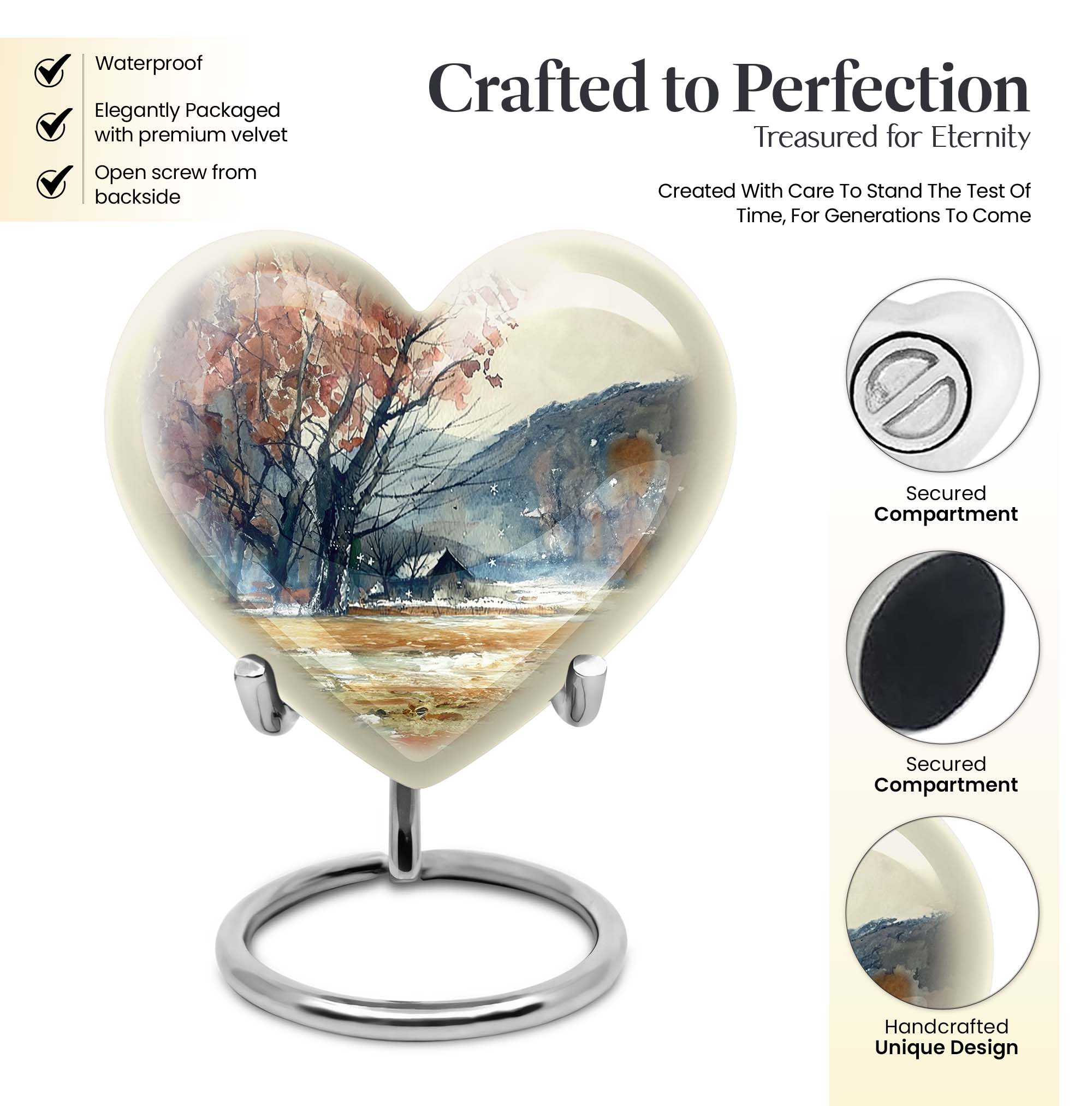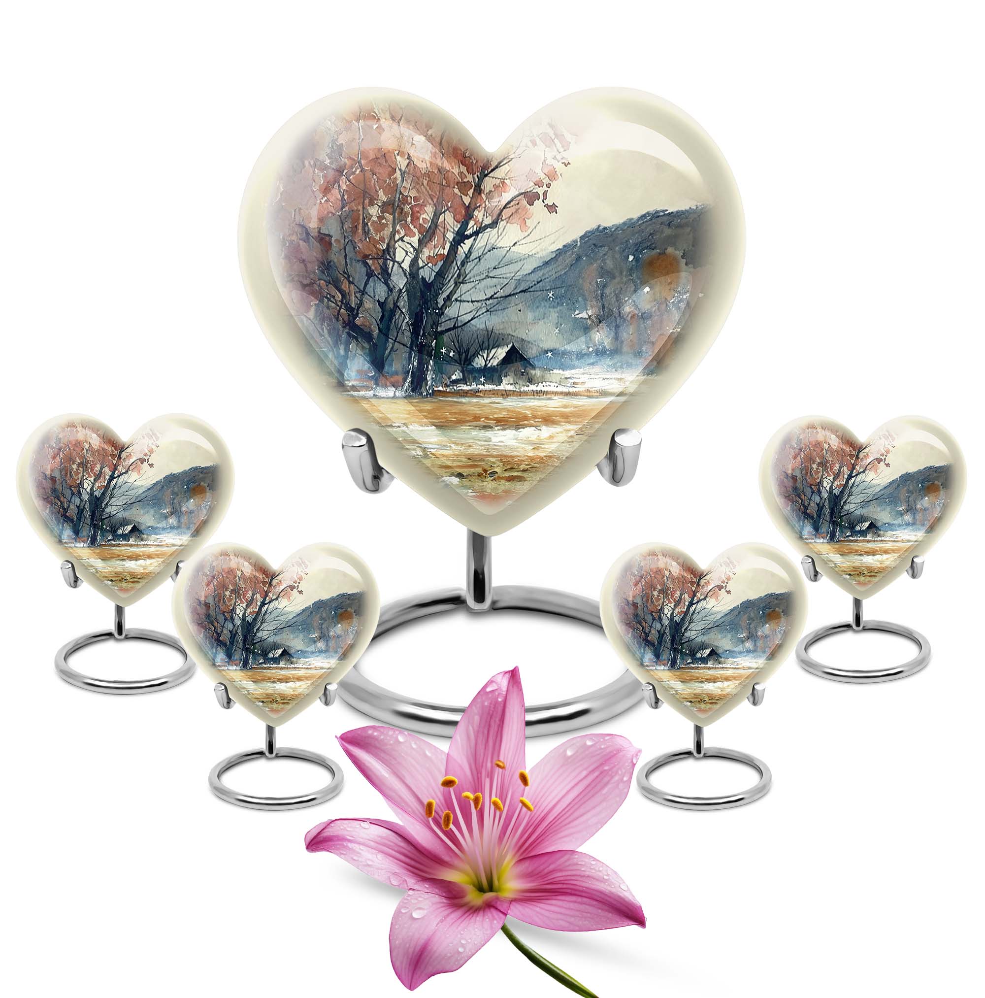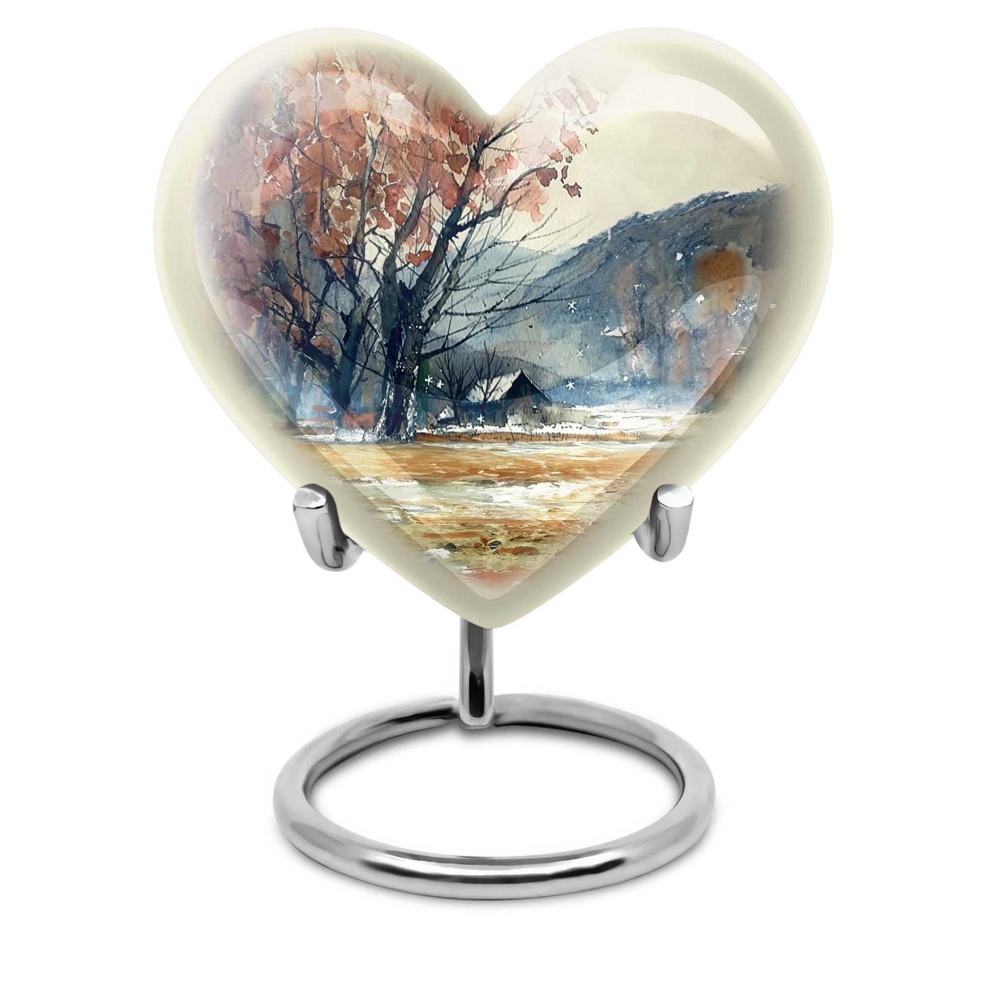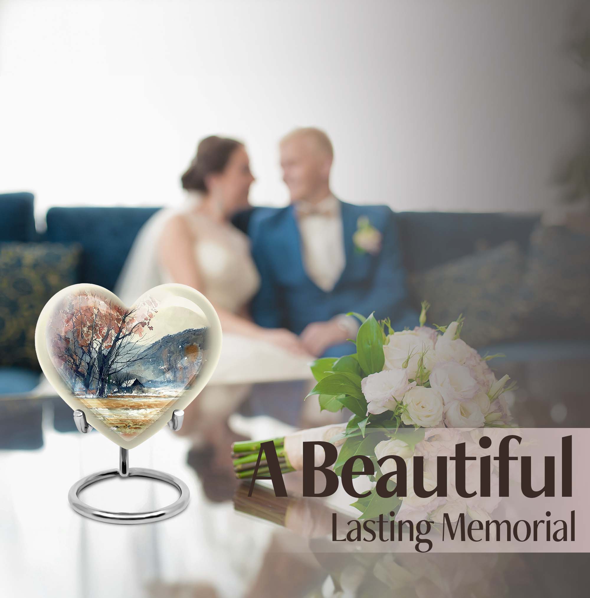 Honor and celebrate your loved one's memory with this breathtaking Mountains Urn, artistically crafted for those who seek not just a burial vessel, but a work of beauty. This substantial 3.3 pound, 10-inch Large Urn, designed with exquisite heart detailing, is the perfect tribute to your cherished one. Finished in durable aluminium, the heart urn symbolizes eternal love and memory. It offers a generous capacity of 200 cubic inches, to securely hold the ashes. Accompanied by a plush velvet pouch, it ensures safe and respectful containment of the remains. For a unique touch, the urn can be personalized with engraved names, making it an extraordinary and sentimental memorial urn. Ideal for use as funeral or cremation urns, it also stands as an elegant addition to home decor. With an abstract theme that complements its structure, this urn resonates with the tranquility and grandeur of mountains. Note: This urn is fitting for both adult male and female ashes. In the quest for memorial urns, our Mountains Urn serves as a dignified and respectful choice.