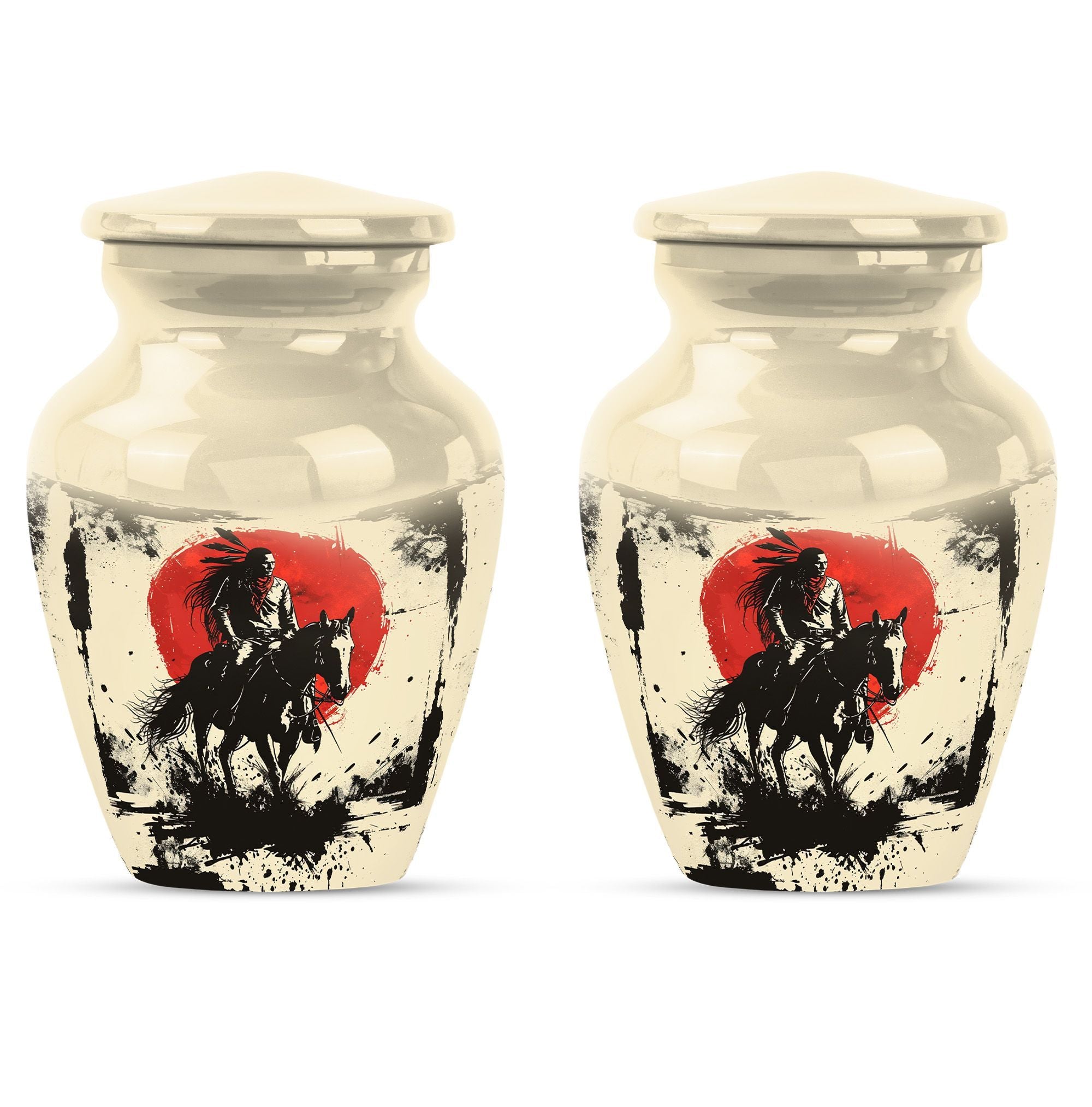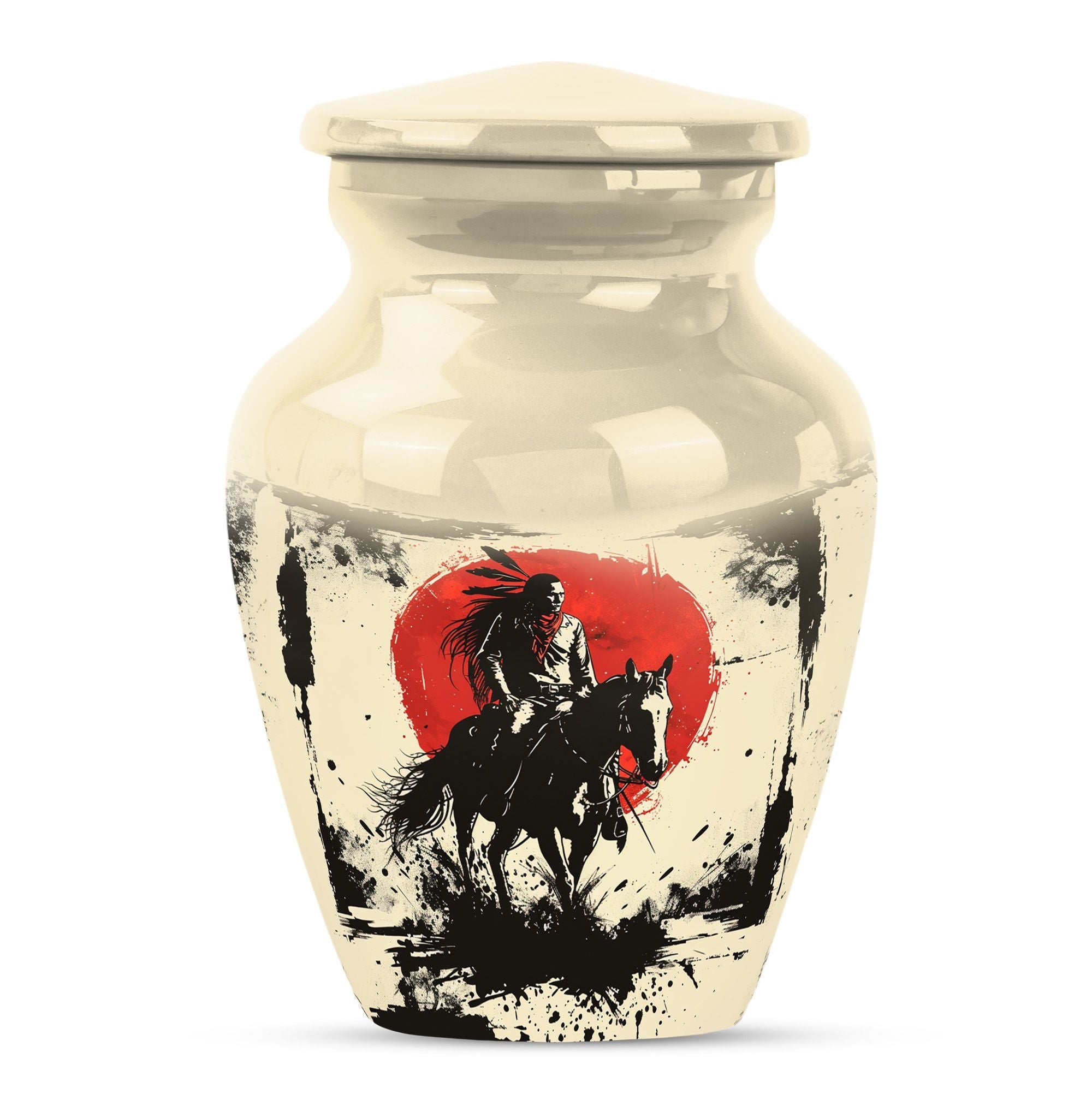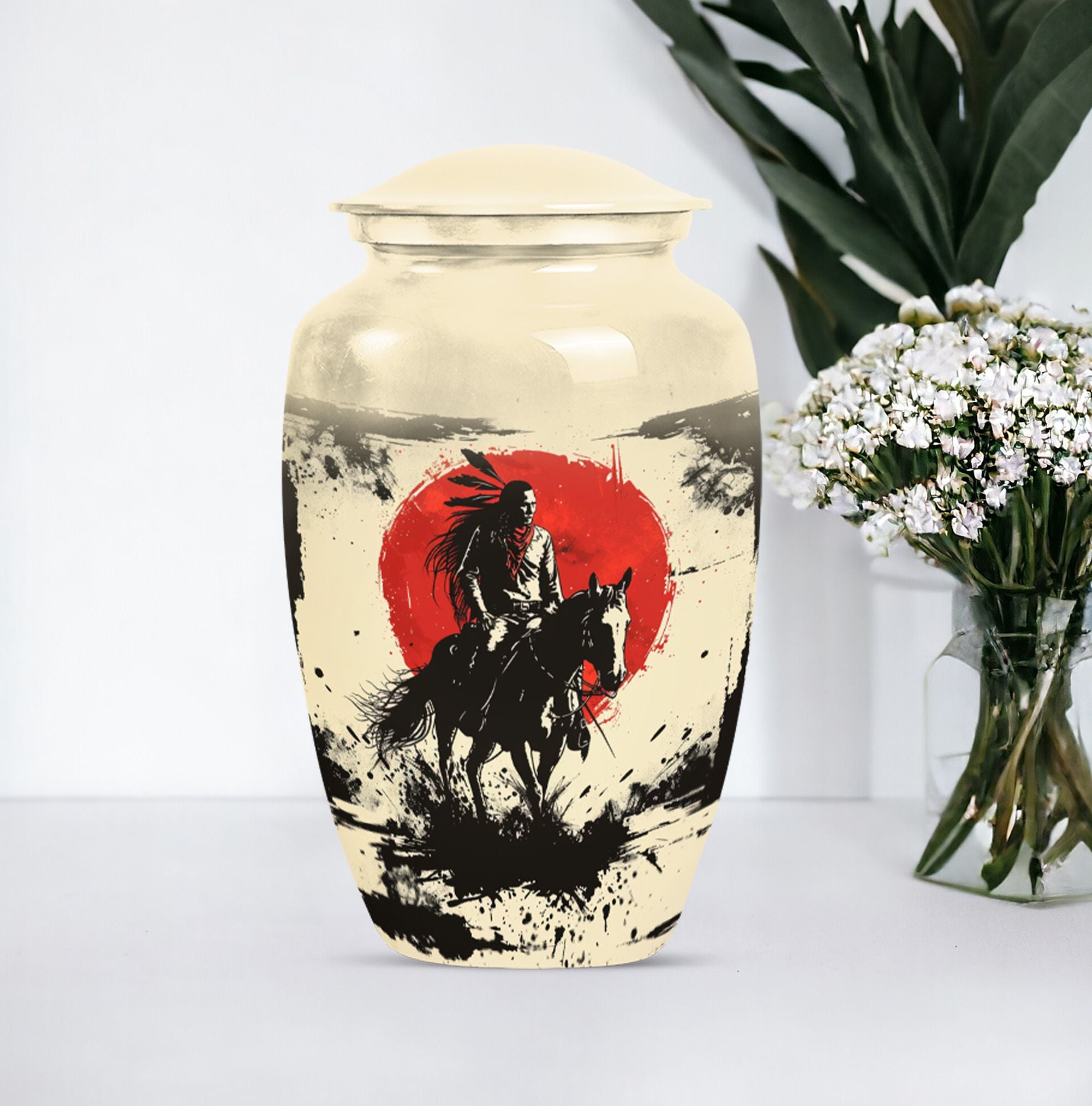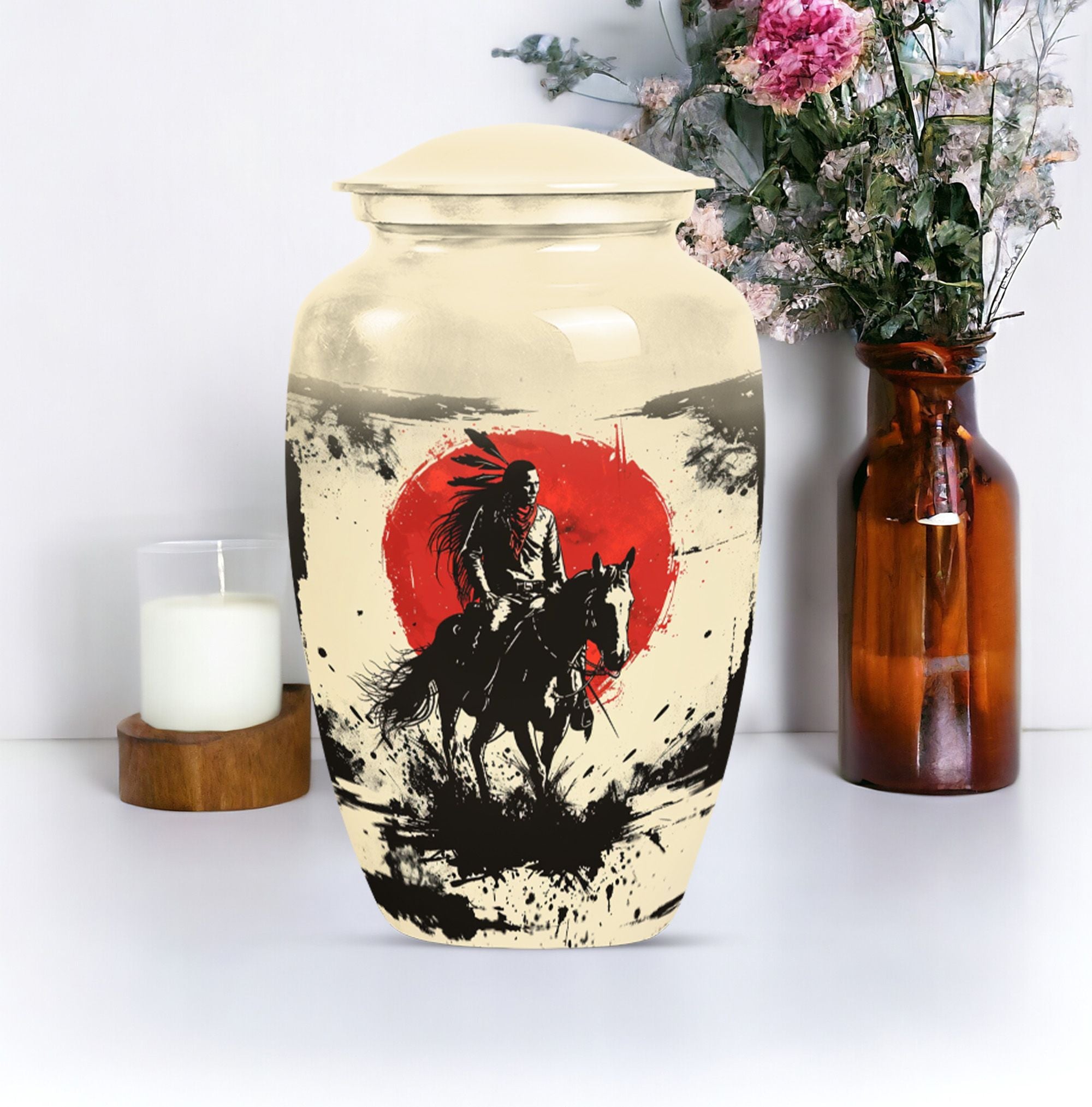 Presenting our beautifully crafted, 'Native American Urn', an ideal addition to your memorial ash urn range. This 10-inch abstract-themed urn is created with quality aluminium, giving it sturdiness and an elegant design. With a capacity of 200 cubic inches, it can safely safeguard adult ashes, paying a befitting tribute to your loved one's memory. Despite its robust build, the urn weights a mere 3.3 pounds, providing the needed stability without being too heavy. Moreover, we believe in keeping your dearly departed close, which is why we offer customization options. You can personalize this urn with engraved names, making this more than just a funeral urn for men's ashes, turning it into an intimate memorial piece. To safeguard this precious vessel, we supply a velvet pouch for containing the ashes, melding security with aesthetic appeal. We invite you to understand the sentiment and craftsmanship behind our native American urn and hold on to the cherished memories of a life well-lived. Please note, our product line extends beyond large urns, featuring a diverse range of elegant urns tailored for varying needs.