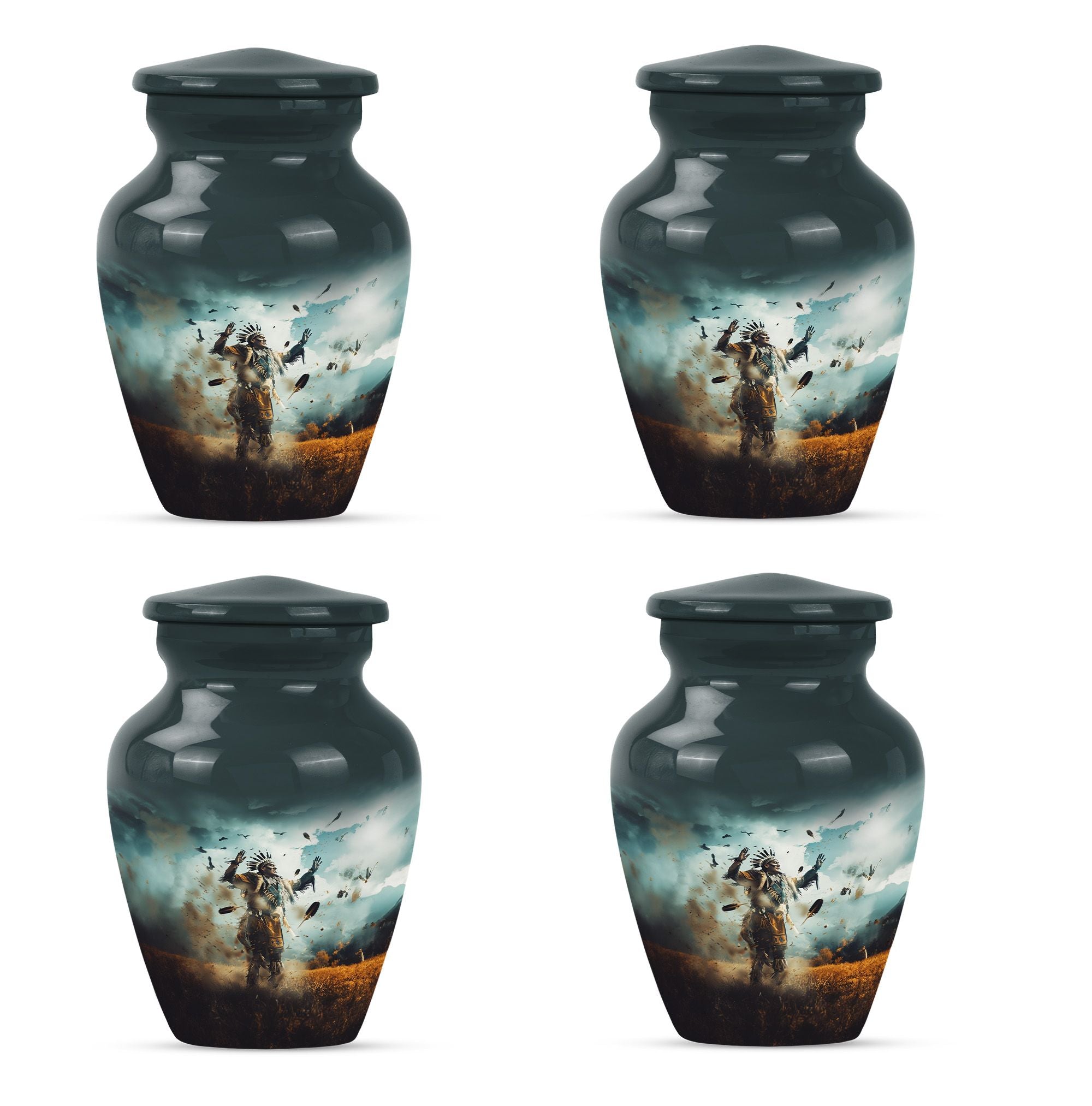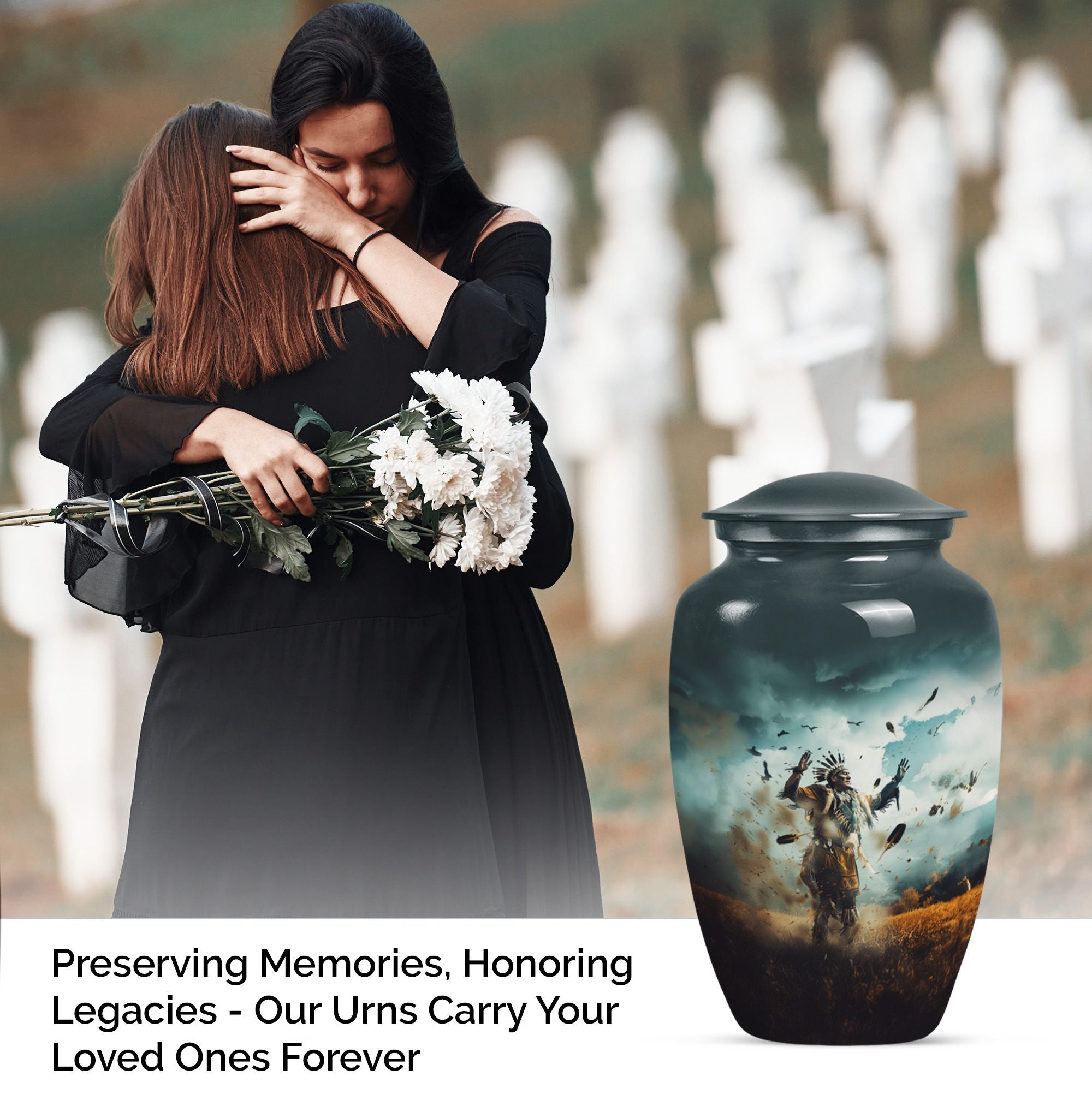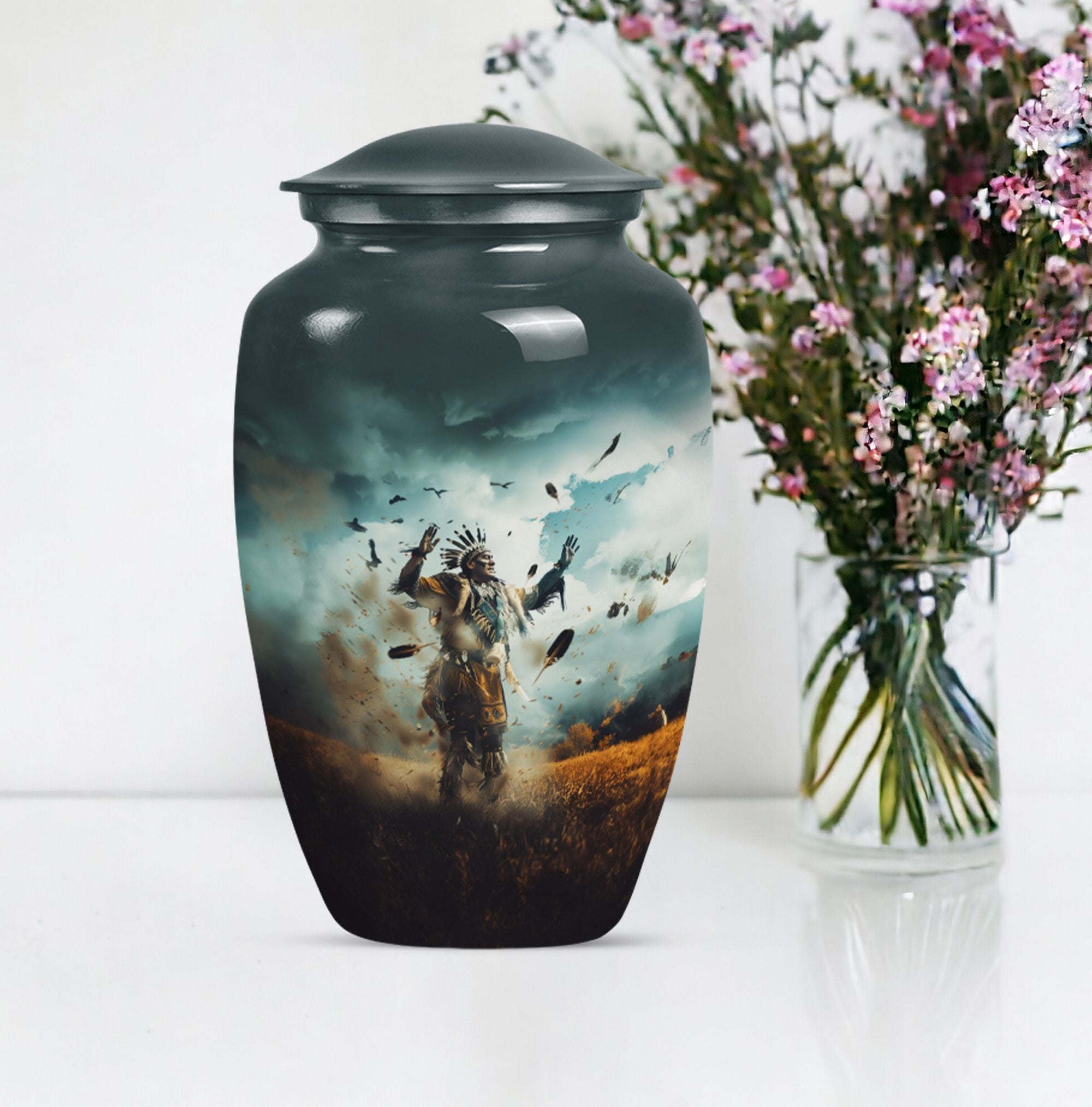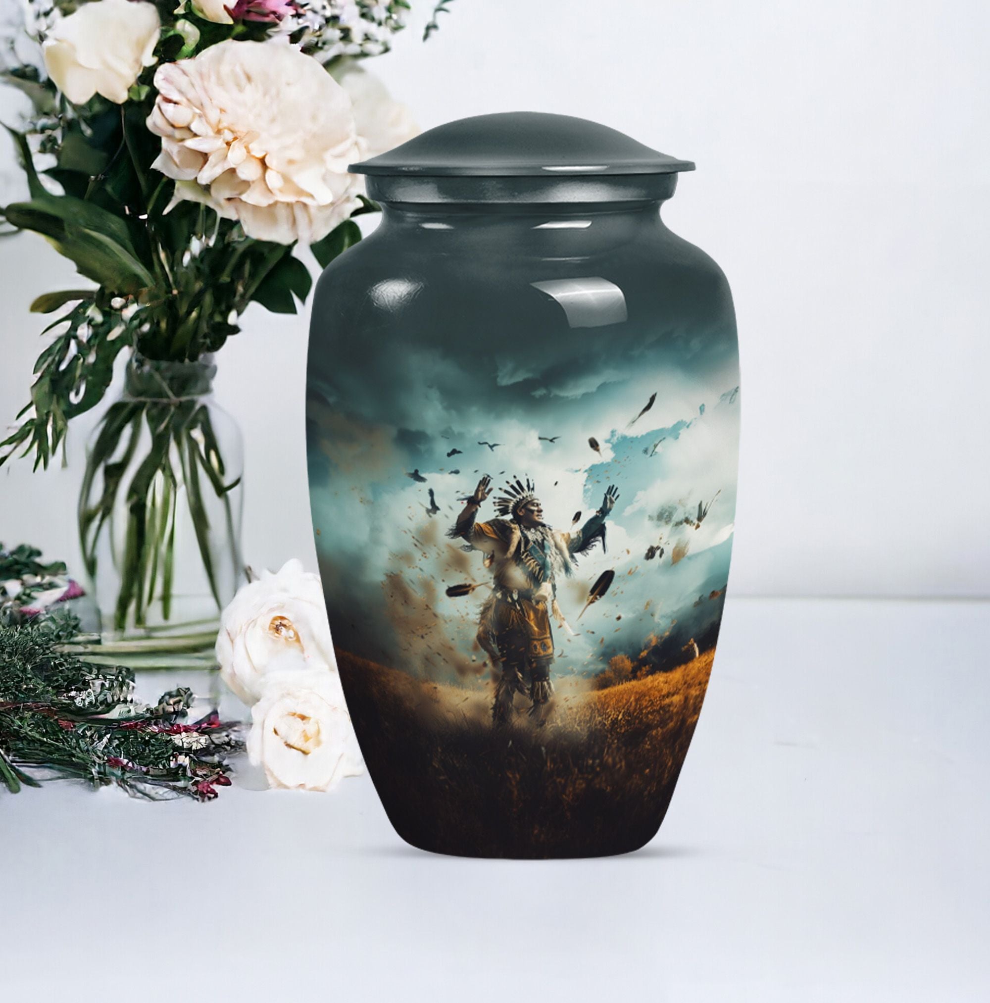 Honor the memory of your departed loved ones with this exquisite Native American Urn. Its abstract theme and classic design shaped from quality aluminium resound with solemnity and respect. Measuring at 10" in height, this memorial burial urn demonstrates sturdiness with its 3.3 lbs. weight, offering a notable capacity of 200 cubic inches to securely hold the ashes. The large size of the urn makes it an appropriate selection for adults. This product stands out for its customization feature, where buyers are presented with the opportunity to personalize the urn with the engraved names of departed loved ones, further enhancing its value as a memorial item. Included in your purchase is a beautiful, soft velvet pouch for containment of ashes, ensuring both respect and convenience. While often searched terms such as 'funeral ash urn', 'funeral burial', 'cremation urns for humans', and 'funeral urns for adult ashes men', properly reflect this product, it is the emotional weight and spiritual comfort it brings that sets it apart. Channel the spirit of memory and revere your loved one with this unique, quality urn.