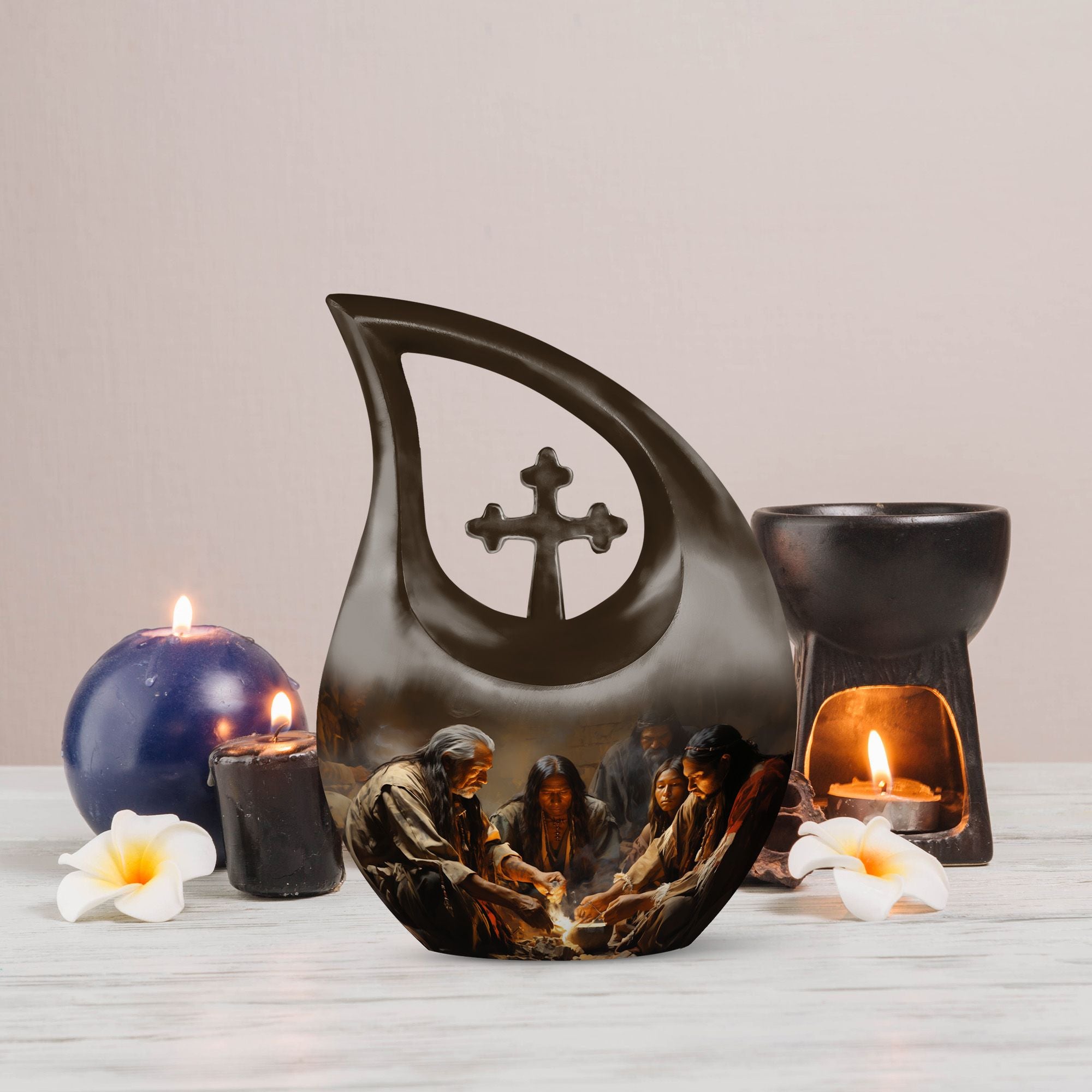Crafted from durable aluminum, this urn features an intricate family-inspired Native American motif symbolizing strength, legacy, and togetherness. Its secure screw-top lid ensures long-term protection, making it ideal for those needing adult urns for women, funeral urns for men, or an urn for human ashes adult men. The artistic detailing creates a warm and reverent look, suitable for display or remembrance ceremonies. Families who prefer smaller memorials can pair this design with small urns for women human ashes or companion keepsakes.