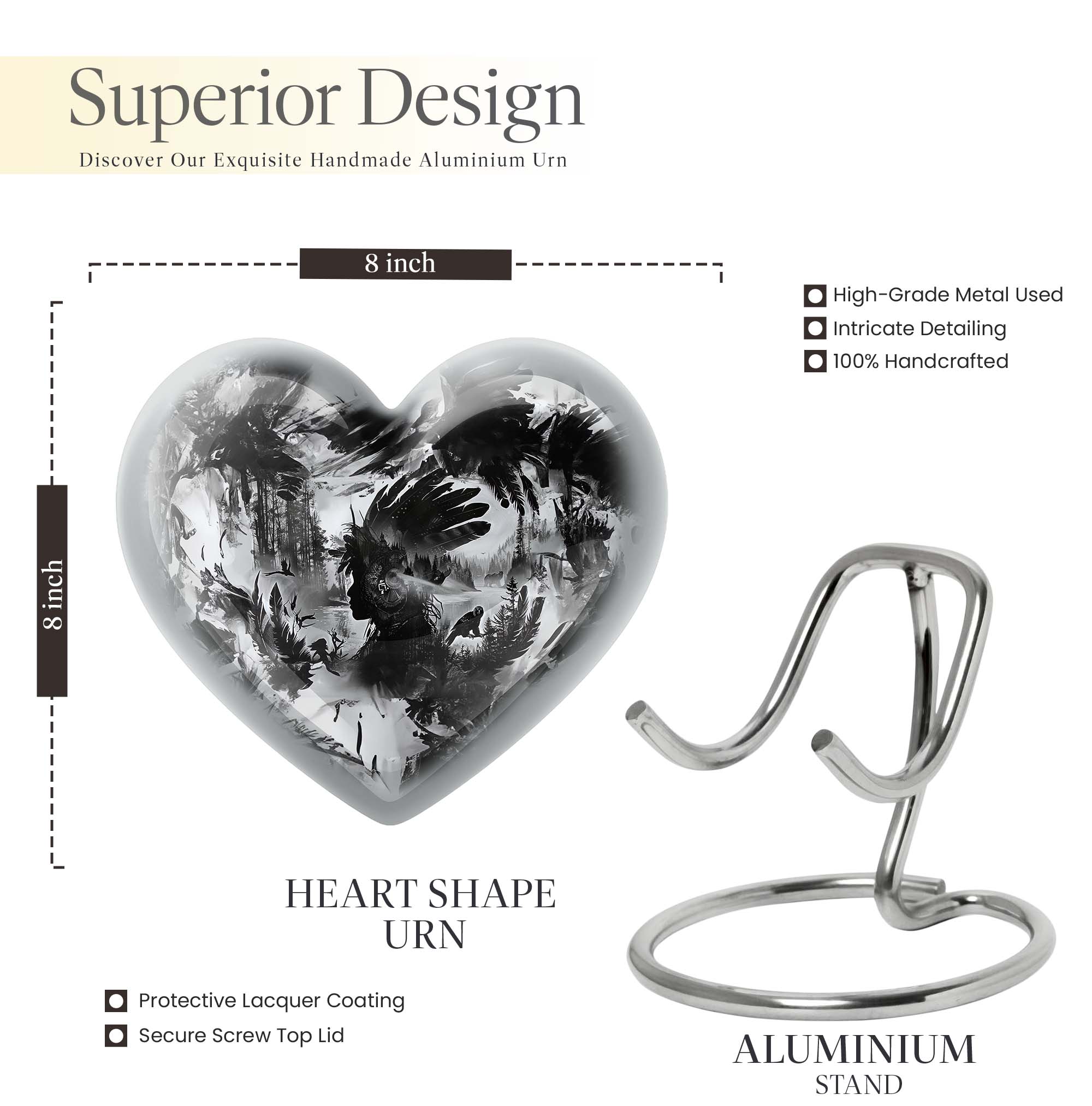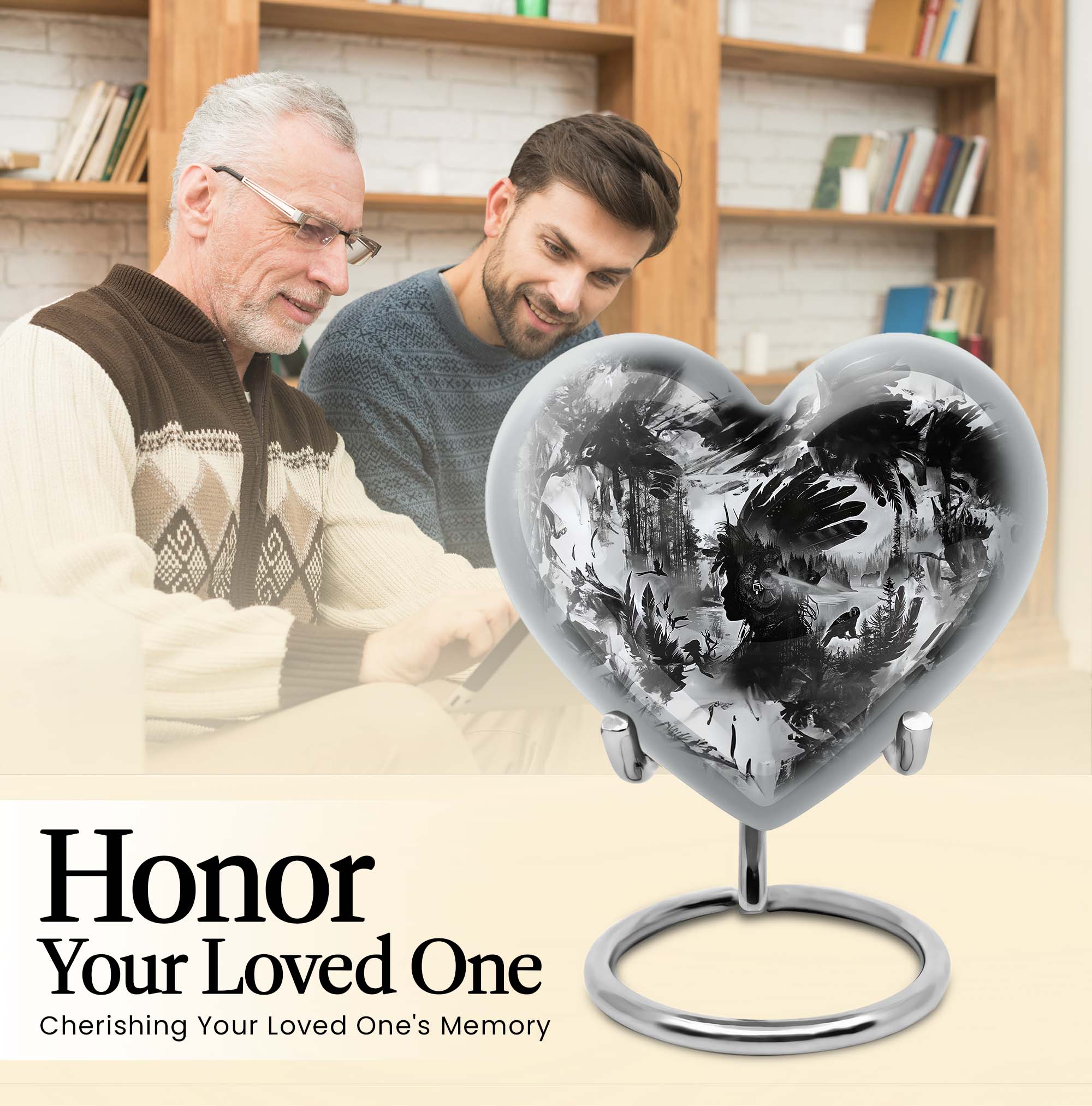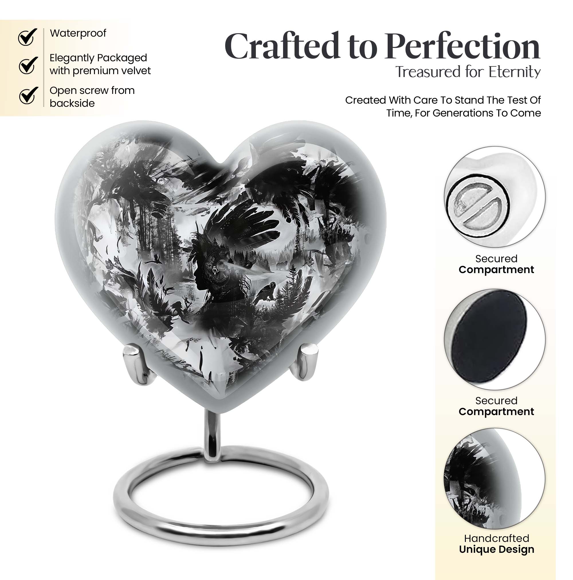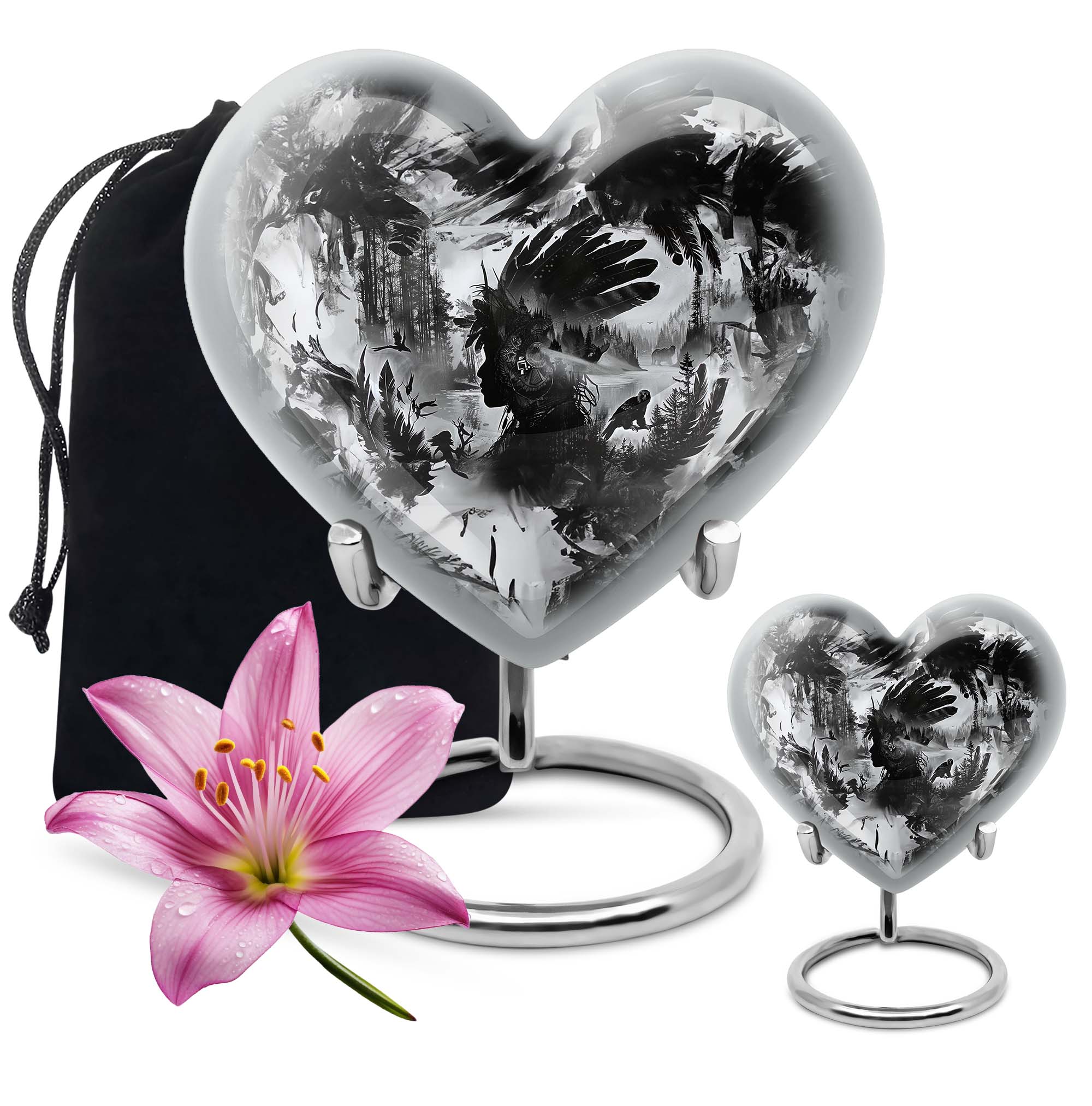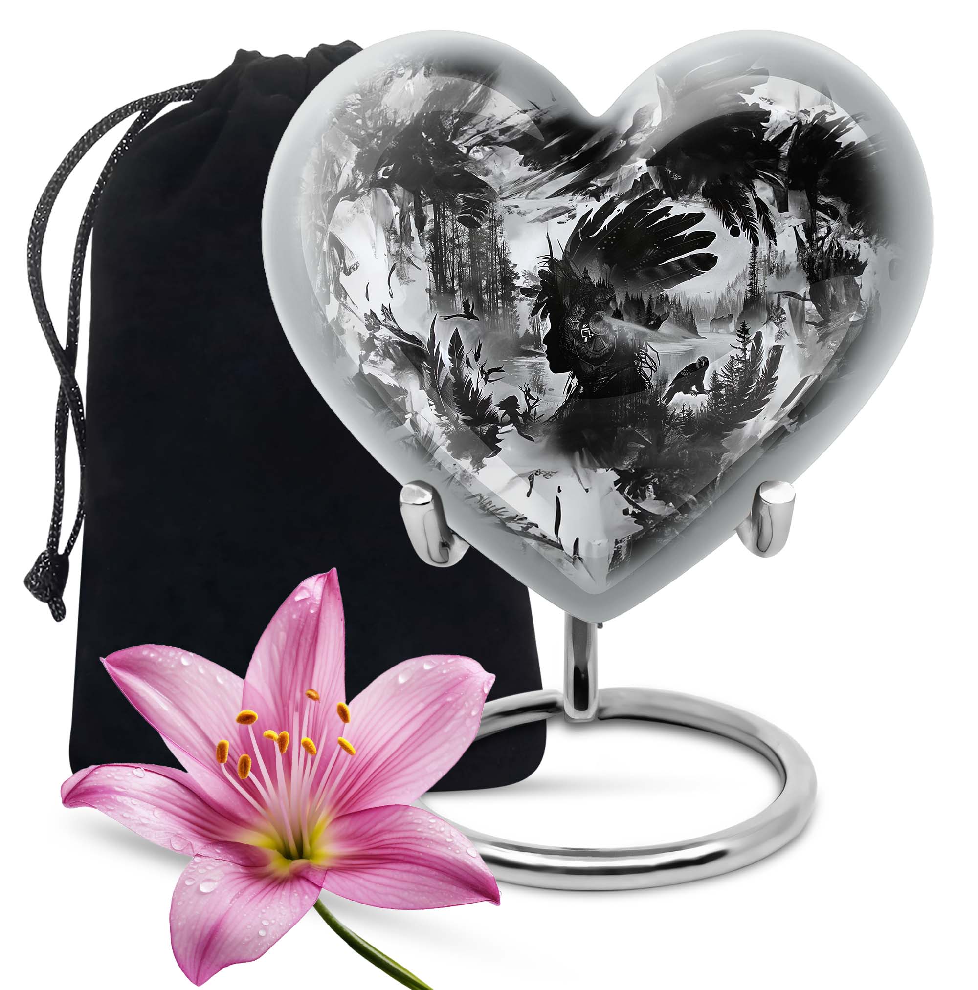 Crafted with meticulous attention to detail, the large, 10-inch Tribe Man Urn is a strong, visually-striking memorial urn designed to pay fitting homage to your dearly departed. The heart motif imbues a level of emotion and care into the product, while the wolf howling theme adds a unique and ethereal message of eternal companionship. Weighing 3.3 pounds, this aluminium urn is durable enough for both burial ceremonies or domestic display purposes. The urn capacity is ample, able to hold up to 200 cubic inches of ashes. Additionally, the package includes a velvet pouch, providing a respectful and secure containment for the ashes. If desired, customization offers the option to personalize the urn with engraved names, adding a further layer of tribute to a cherished life. From 'cremation urns for human ashes adult male' to 'funeral urns for adult ashes women', this piece embodies a universal appeal. Avoiding the ordinary, this urn provides a distinctive saying of farewell.