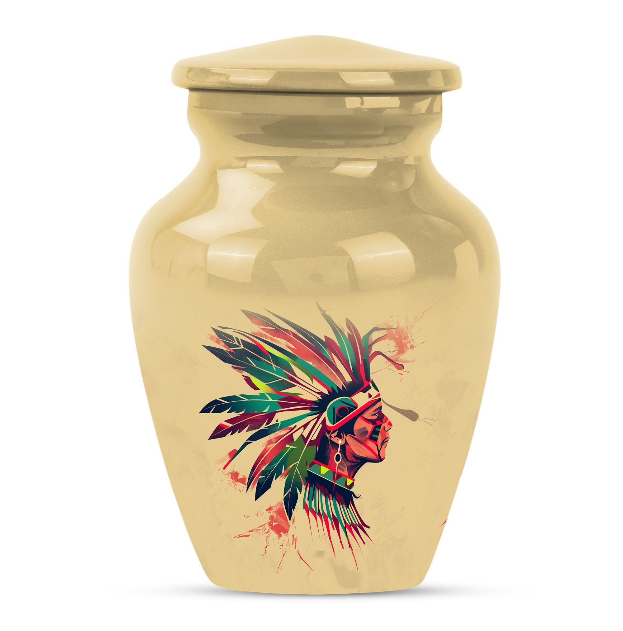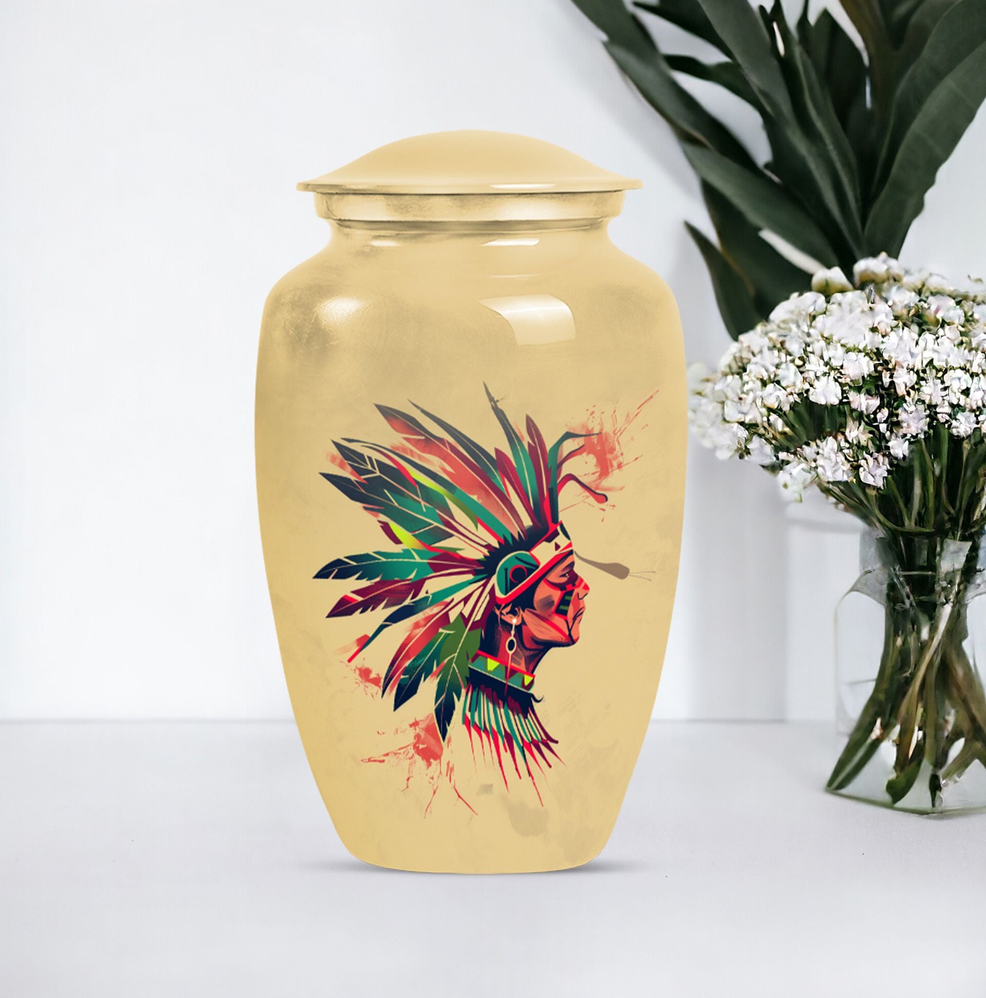Evoke a sense of serene remembrance with our native american funeral ash urn, a timeless piece built to reverently preserve the memories of your loved ones. This large urn, standing tall at 10 inches with a substantial capacity of 200 cubic inches, offers an embracing haven for ashes. Crafted out of robust aluminium, it's significant in its weight of 3.3 pounds, reflecting its lasting durability. The classic urn style, coupled with an abstract theme, adds a touch of tranquility and grace. We understand that every memory is precious; hence we offer an option to personalize this urn with engraved names, making it as unique as the life it honors. Along with the urn, you'll receive a soft velvet pouch for secure containment and discreet storage of ashes. If you are searching for 'memorial urns', 'urns for human ashes', or specifically 'metal urns for adult human ashes', or a special 'memorial urn for mom ashes', this hand-finished, original masterpiece is an excellent choice. Remember your dear ones in a sacred and dignified manner with this unique urn.