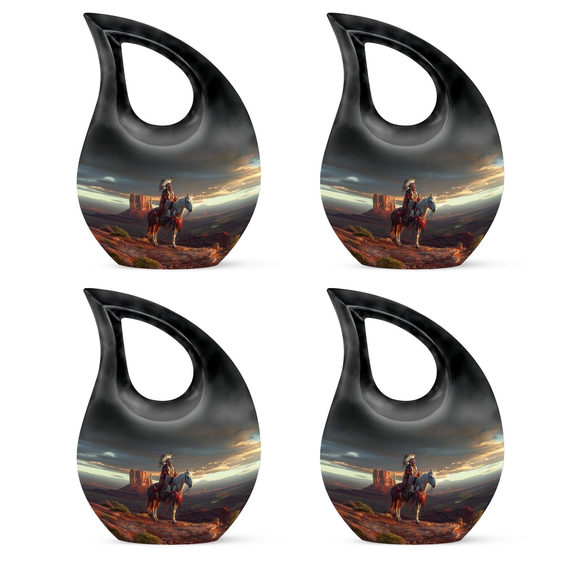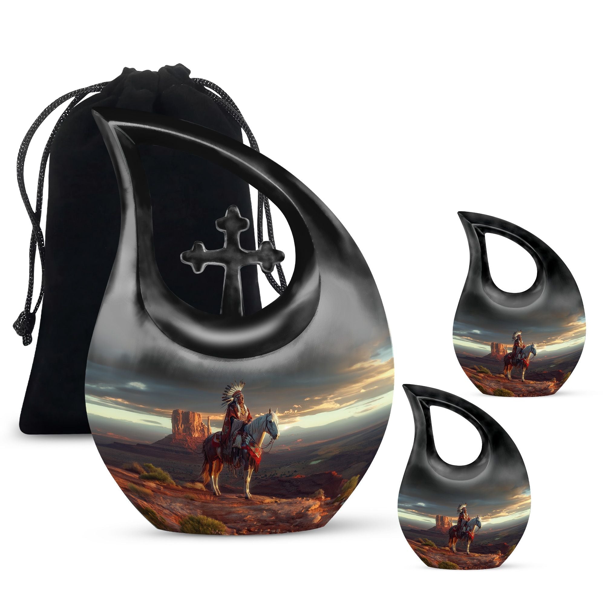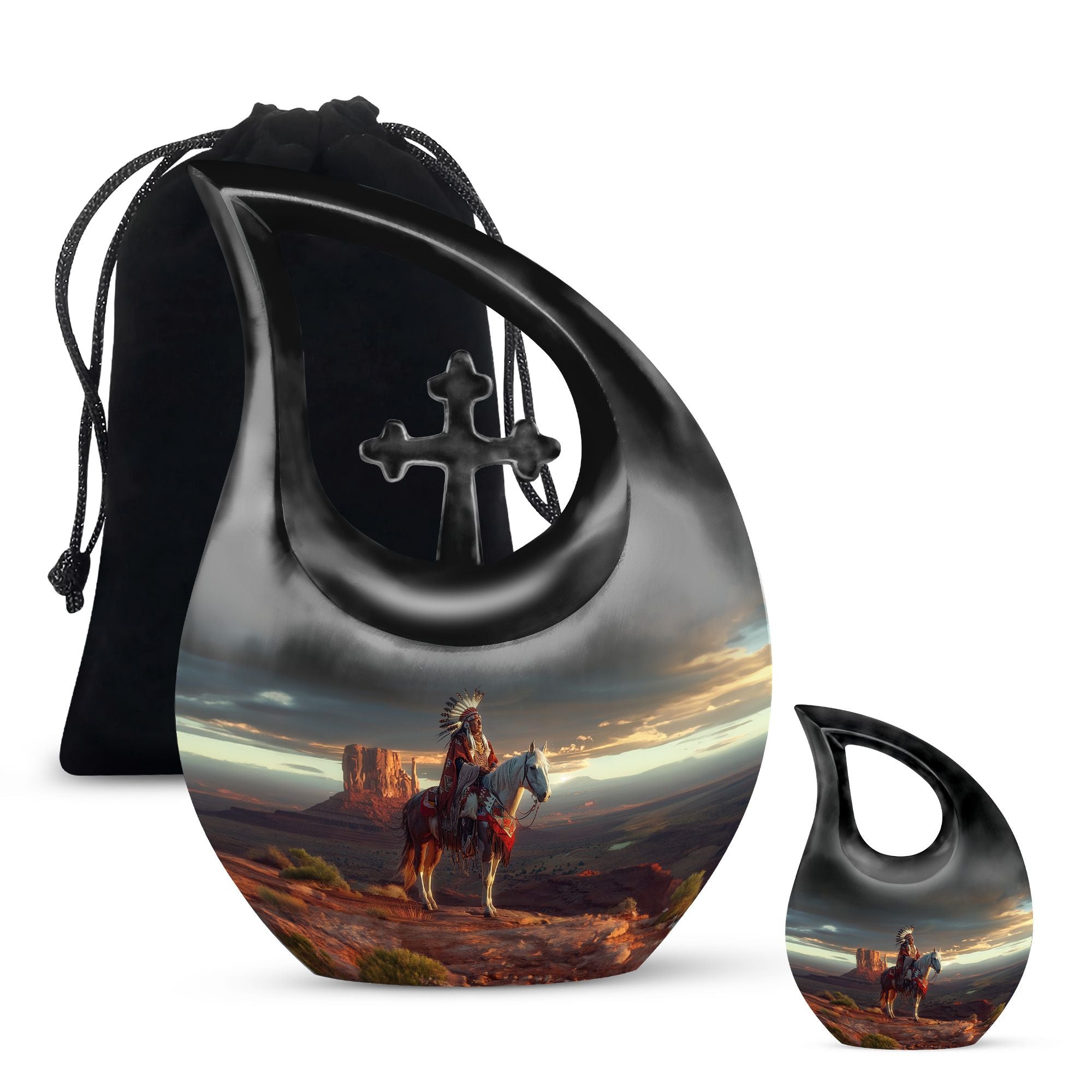 The urn features intricate Native Americanβinspired artwork, symbolizing strength, protection, and spiritual guidance. Made from durable aluminium, it can be purchased as part of cremation urns large & small combo sets or as an individual funeral urn. Its secure screw-top lid keeps funeral urn ashes safe, while the refined craftsmanship ensures long-lasting beauty. Whether you need funeral urns for ashes adult or funeral urns for human ashes small, this piece is created to meet diverse memorial needs.