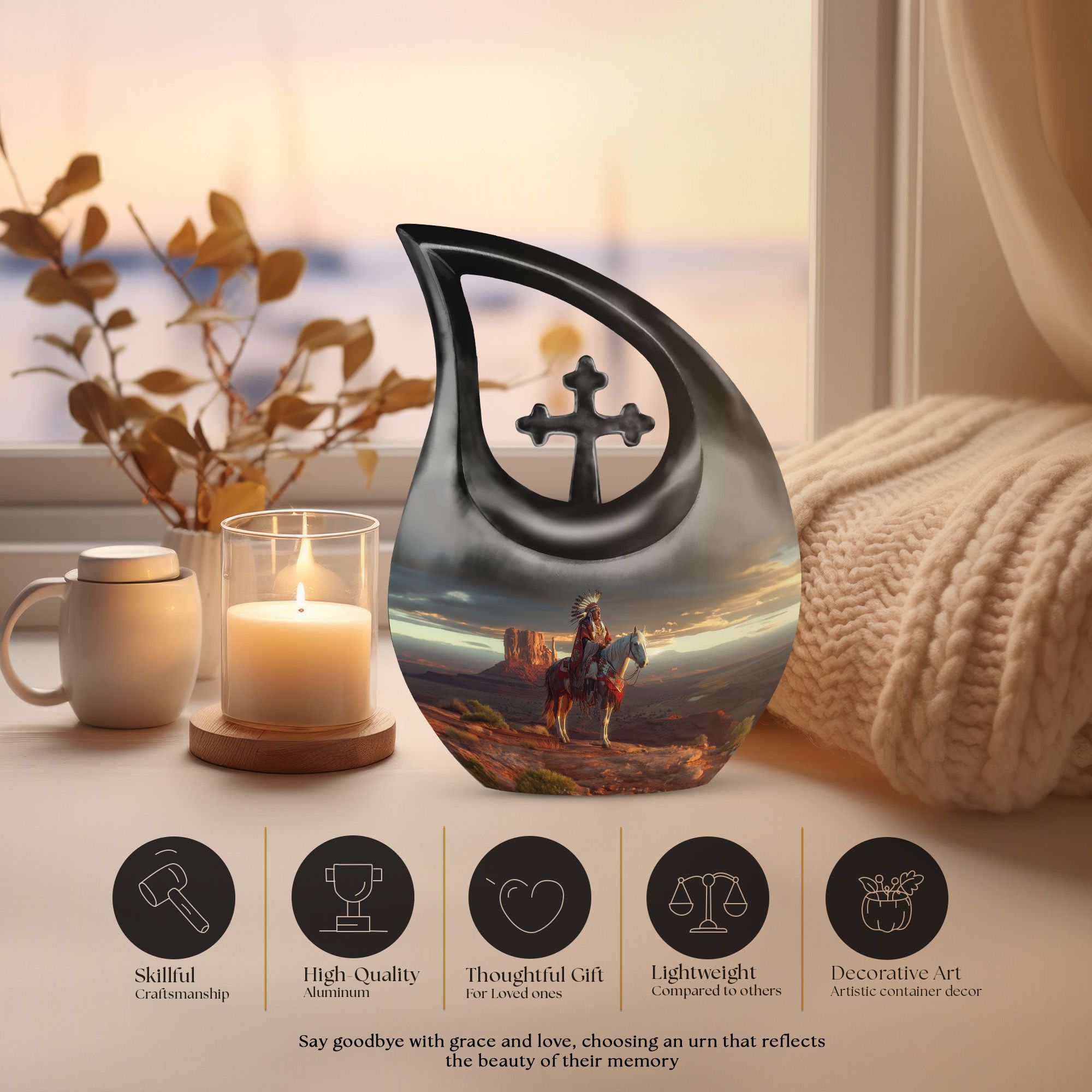 This Native American Burial Urn is a heartfelt way to honor the life and legacy of someone you love. Thoughtfully crafted for families seeking funeral cremation urns for ashes, funeral adult urn options, or small funeral urns, it provides a meaningful and comforting tribute. Its design allows it to serve beautifully for both men and women, making it a versatile and respectful memorial choice.