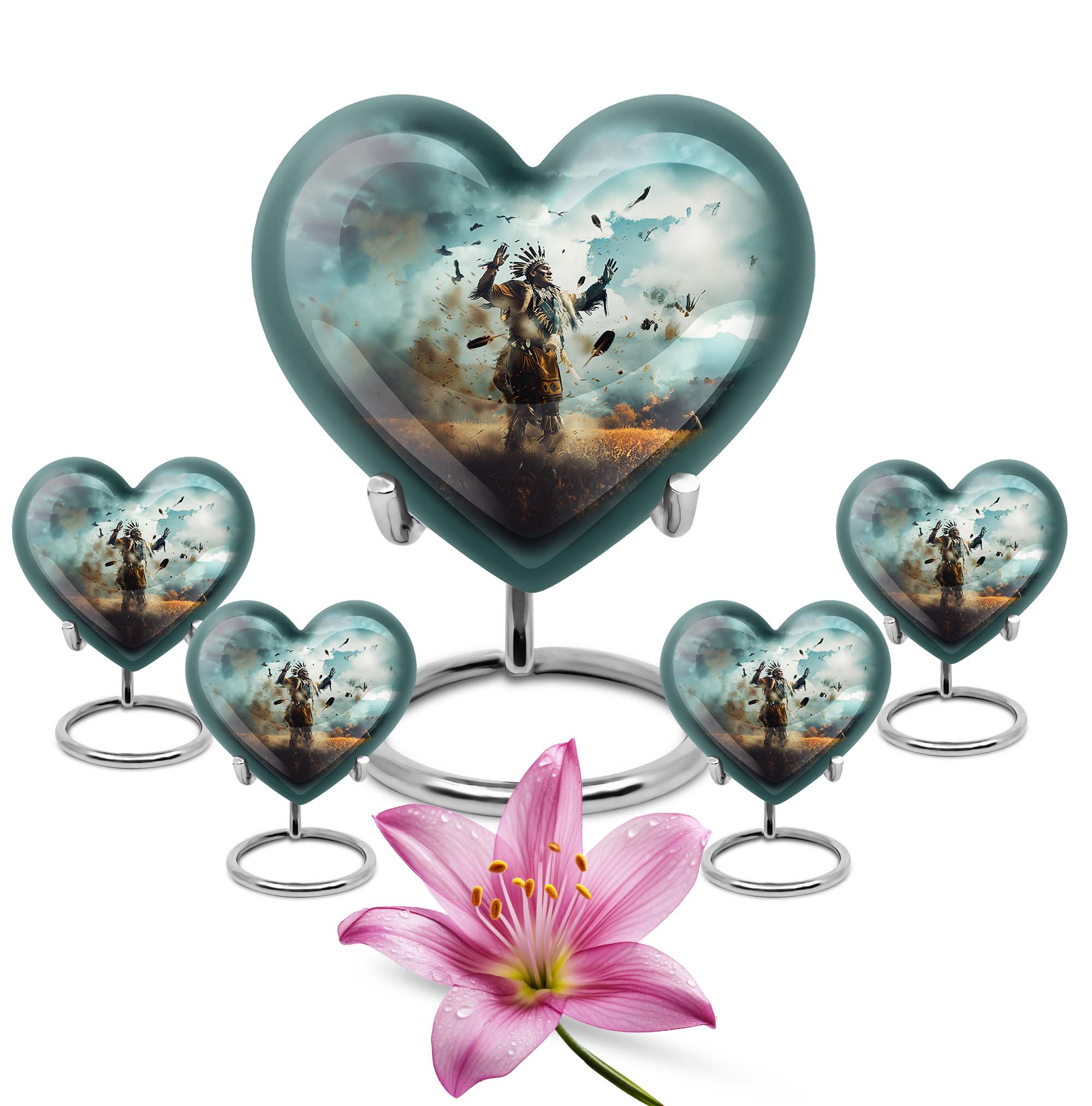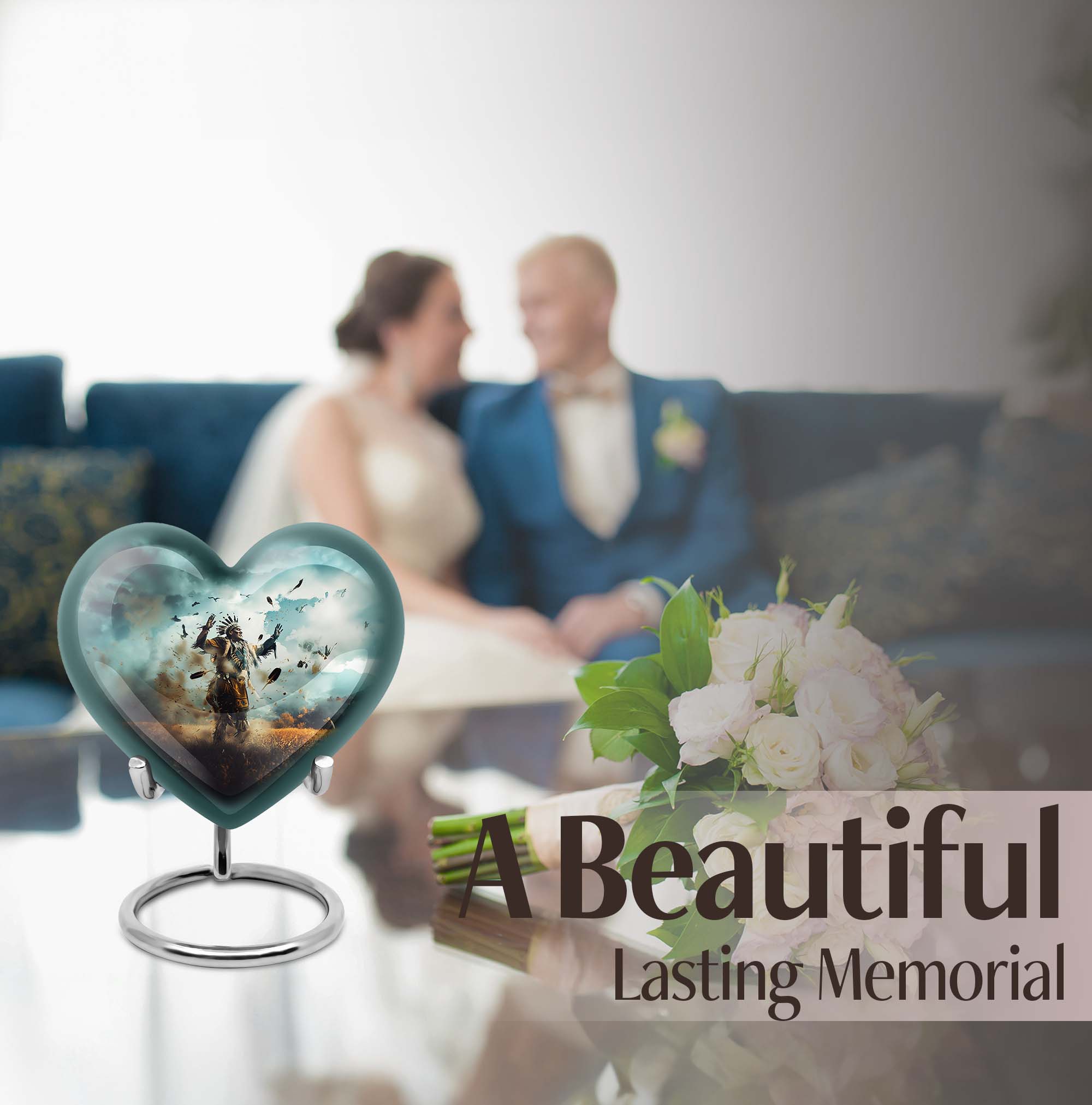 Delicately crafted from aluminium with an abstract theme, this large, awe-inspiring 10 Inch urn is not just a memorial burial urn, but a beautiful piece of art in your home. It boasts a unique, Heart Urn structure, adding an element of beauty to its purpose. Each urn weighs 3.3 pounds, symbolizing the tangible weight of memory, love, and respect. Its stature boldly stands 10 inches in height and can contain 200 cubic inches, ensuring adequate space to hold the ashes of your departed loved ones. Add a personal touch by engraving names on the surface to further commemorate those held dear. Each purchase includes a velvet pouch for a dignified containment of the ashes. Suitable for both men and women, this product fits perfectly under the 'cremation urns for humans' category. Immerse in the memory of your loved ones with this Native American urn that serves as a respectful, dignified, and loving reminder of their life and love.