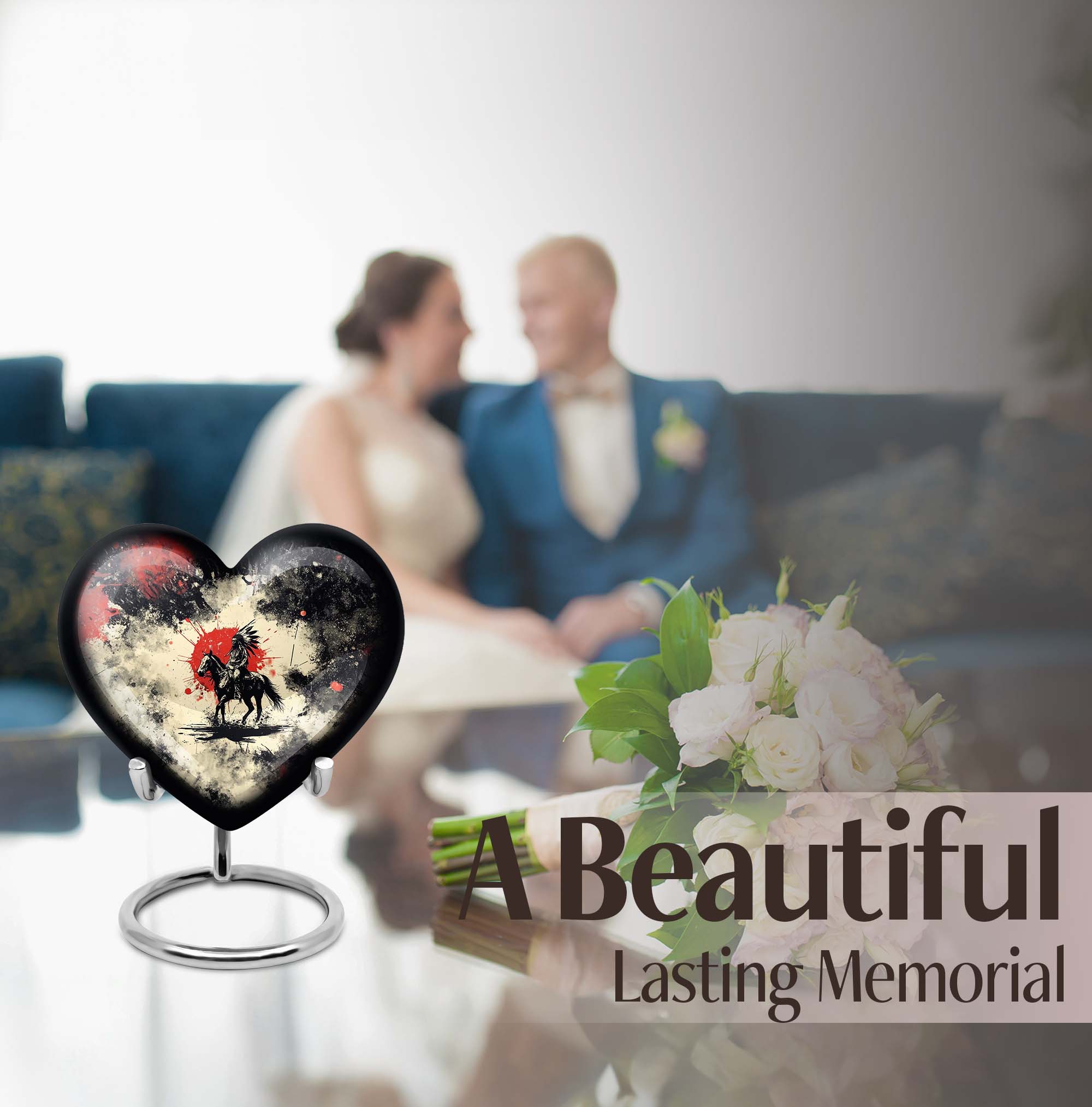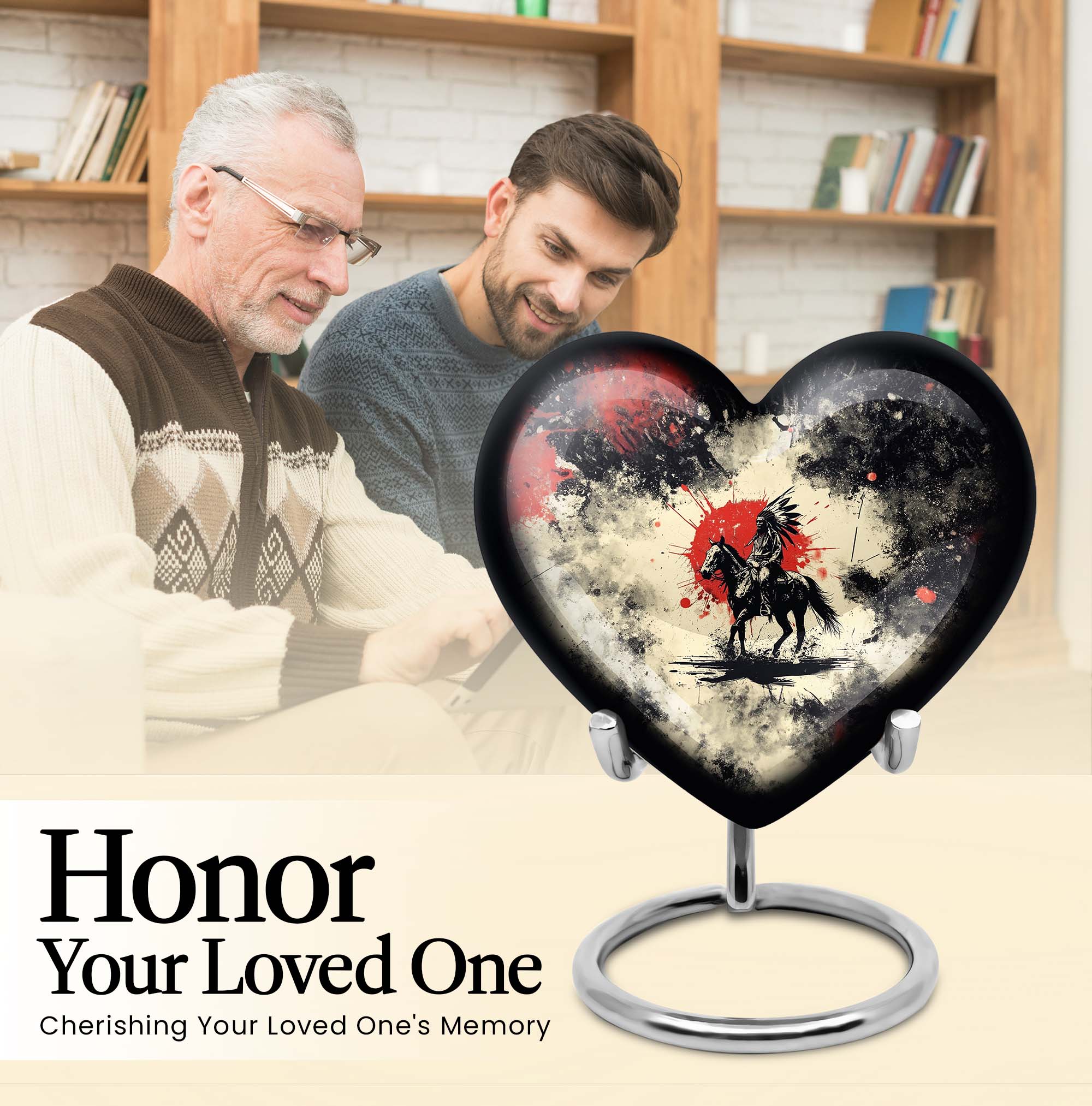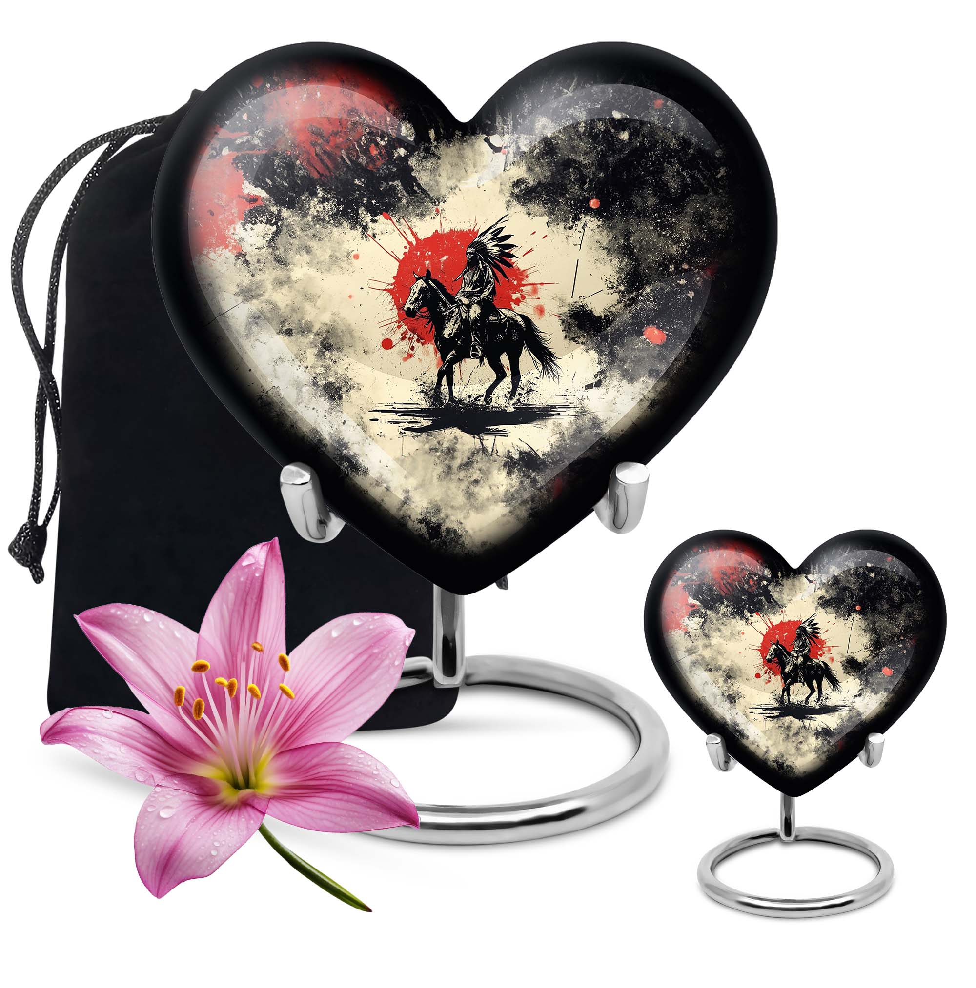 This Native American urn, while equally befitting as an adult male cremation urn, carries an abstract yet unmistakable theme of enduring love. Its large size and ethereal Heart Urn design express deep feelings of love and respect for your departed loved one. Standing tall at 10 inches in height, this aluminum crafted memorial urn serves as a sentimental, long-lasting tribute to honor human ashes. Weighing 3.3 pounds, the urn is voluminous, having a storage capacity of 200 cubic inches. Personalize this burial vessel to stand as a unique testament of your cherished memories, allowing you to engrave names meaningfully. Complementing the package is a velvet pouch that serves as a snug condition for safe-keeping the cherished remains. Taken as a whole, this funeral or cremation urn for adult ashes, women or men, redefines our perception of memorial urns, introducing a sensitive touch to a time of sorrow.
