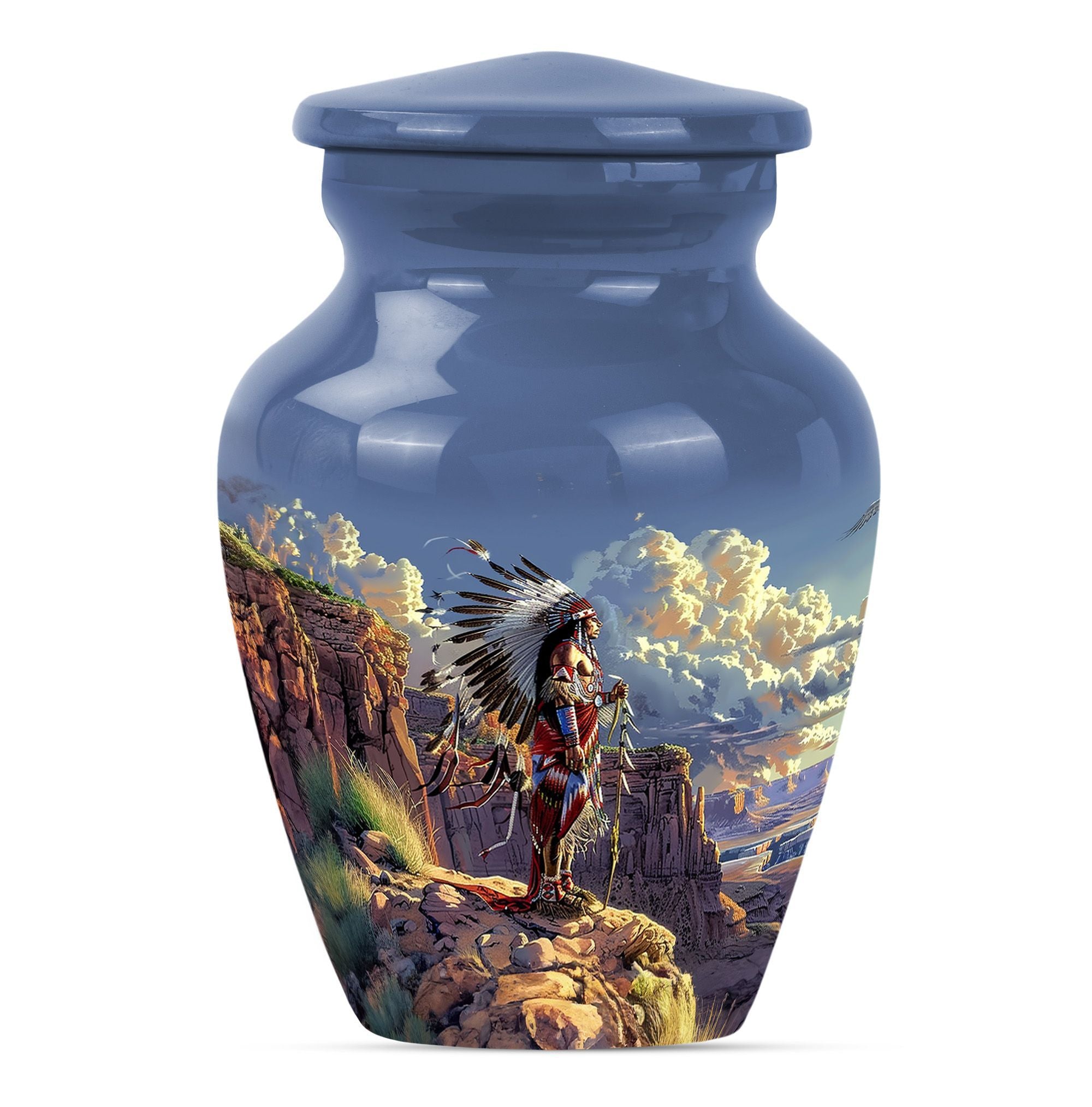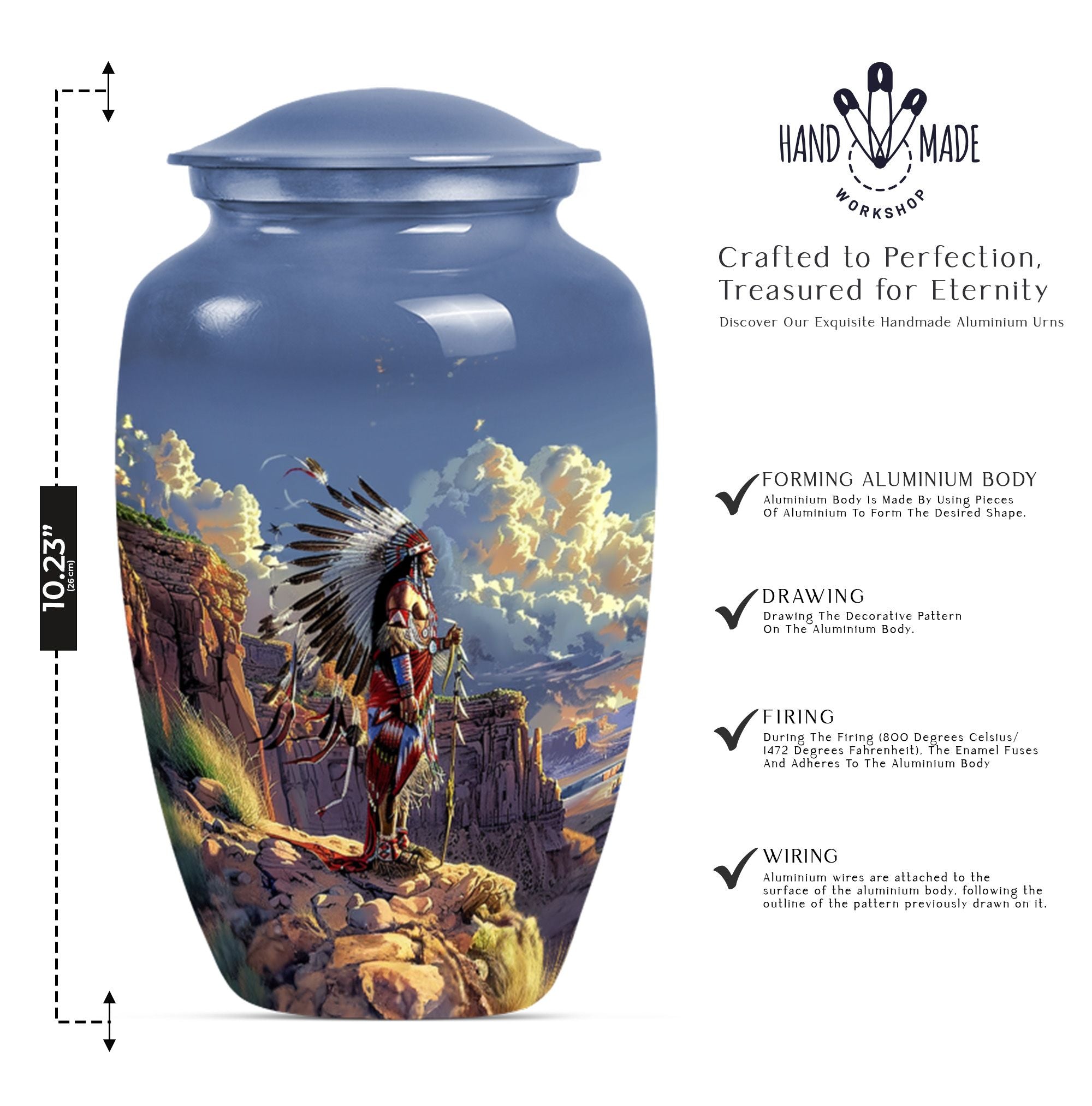 Bring life to your loved one's memory with this Tribe Man Urn, meticulously crafted to serve as a solemn remembrance of the life they have lived. At 10 inches in height and a weight of 3.3 pounds, this large urn is built to last with its durable aluminium composition. The theme features a stunning 'Wolf Howling' design signifying strength and freedom, expressing a timeless tribute. This funeral adult urn for human ashes has a capacity of 200 cubic inches, sufficient to securely hold the memories of your loved ones. Adding a personal touch, you can personalize this urn with engraved names. The package also includes a velvet pouch for careful containment of ashes. Ideal for individuals searching for 'memorial urns' or 'funeral urns for ashes,' this urn gracefully meets your mourning needs, cherishing your loved ones with dignity and affection.