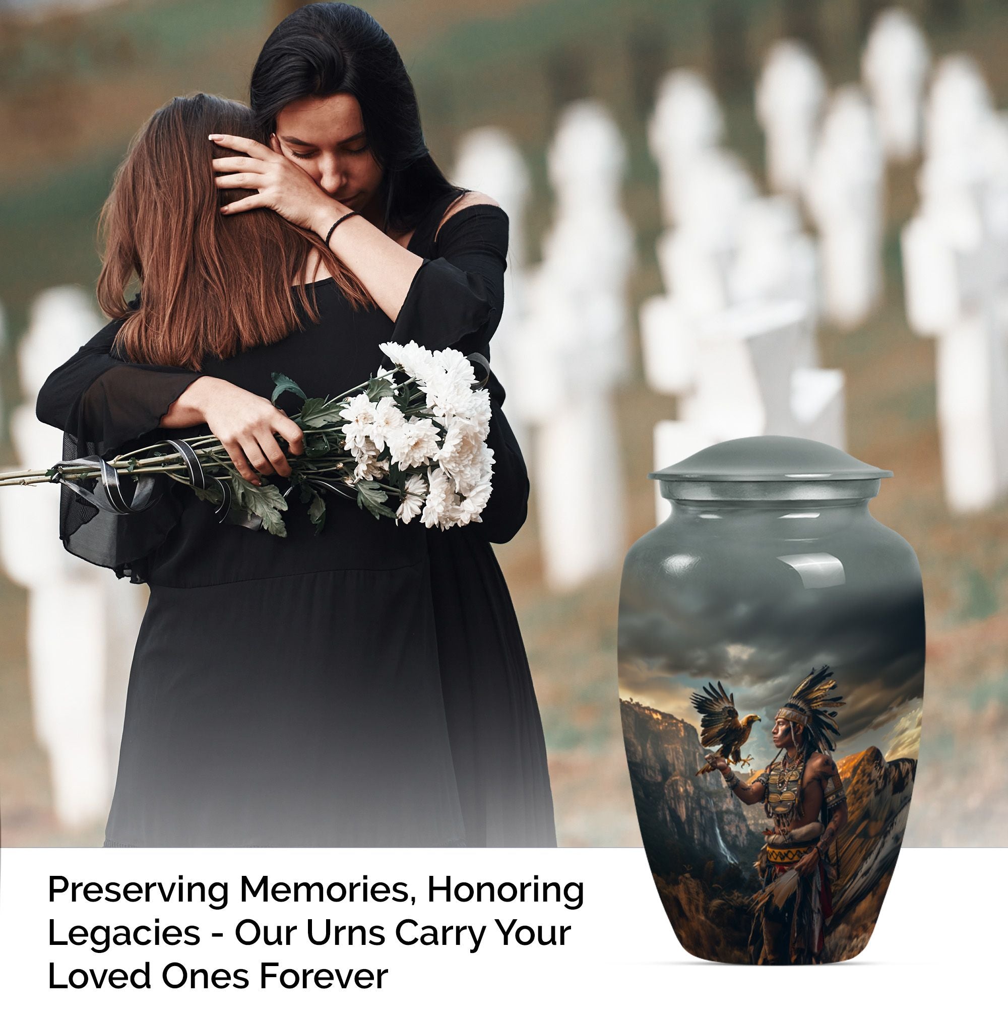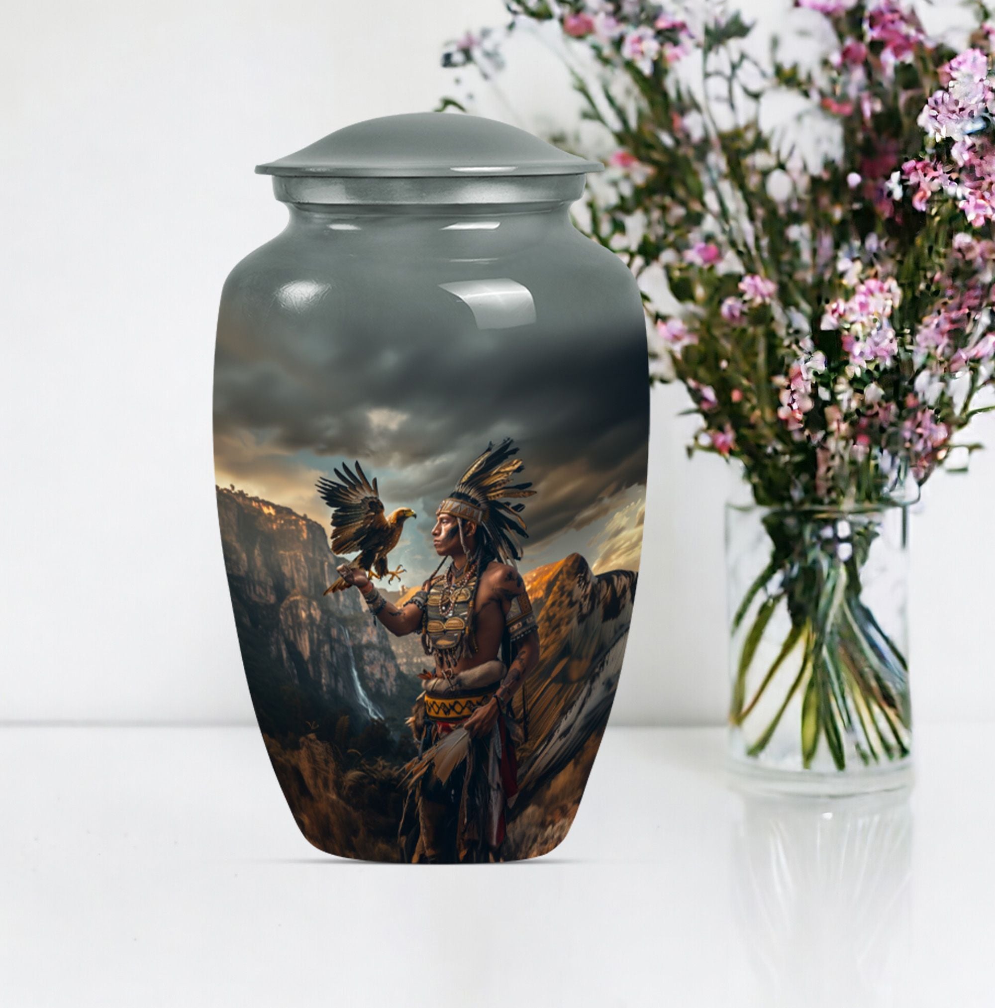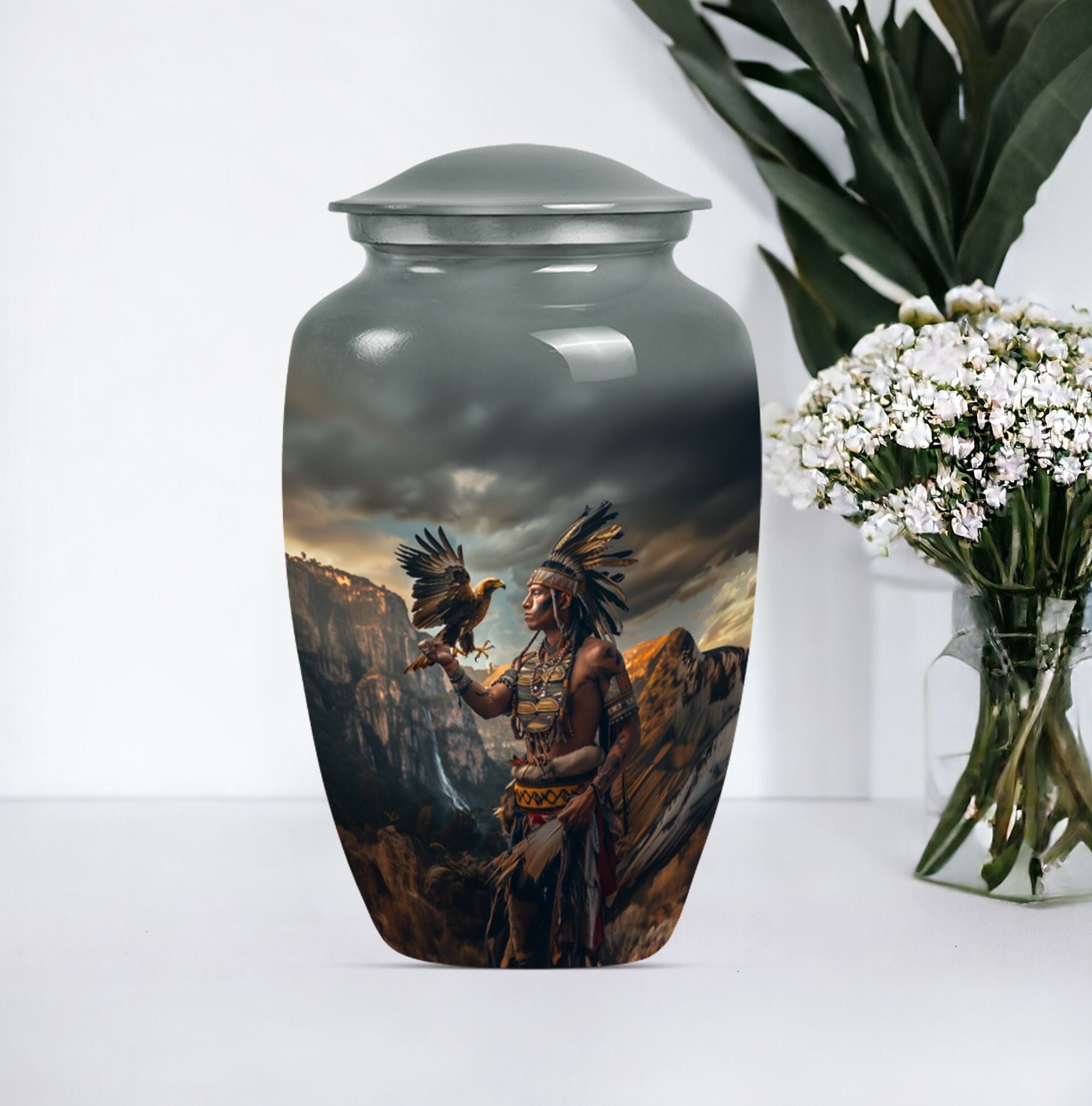 Your search for an elegant and lasting tribute to your loved one ends here with our premium tribe Man Urn. This large urn which stands at a height of 10 inches exudes an aura of class with its theme of 'Wolf Howling'; a symbol revered in many cultures symbolizing strength, unity, and respect for family. Handcrafted from durable aluminium, this cremation urn for dad is weighty yet well-balanced at 3.3 pounds, boasting a capacity of 200 cubic inches. Each urn is also afforded a personal touch with the option to engrave names, ensuring that each piece is truly unique. The urn comes nestled inside a plush velvet pouch, safeguarding the ashes during transit or when showcased. Offering not only a vessel but a memorial, the high-quality tribe Man Urn redefines affordability and pays an honorable homage. Looking beyond traditional burial urns for adult men ashes, choose this unparalleled piece resonating strength and unity, and treasuring the powerful spirit of your loved one.