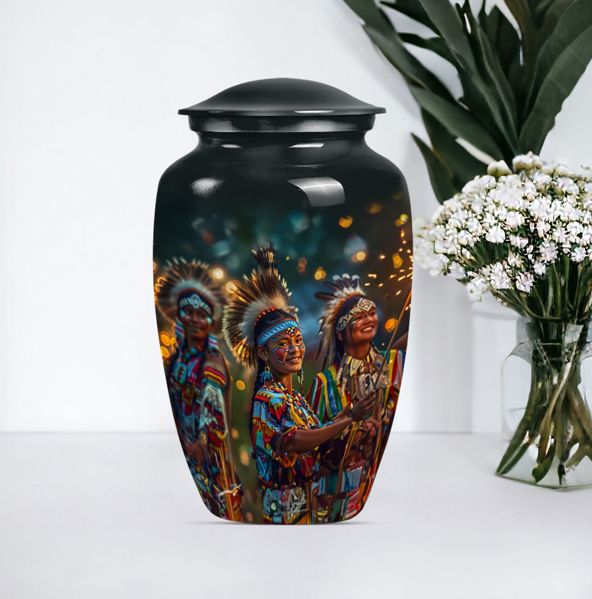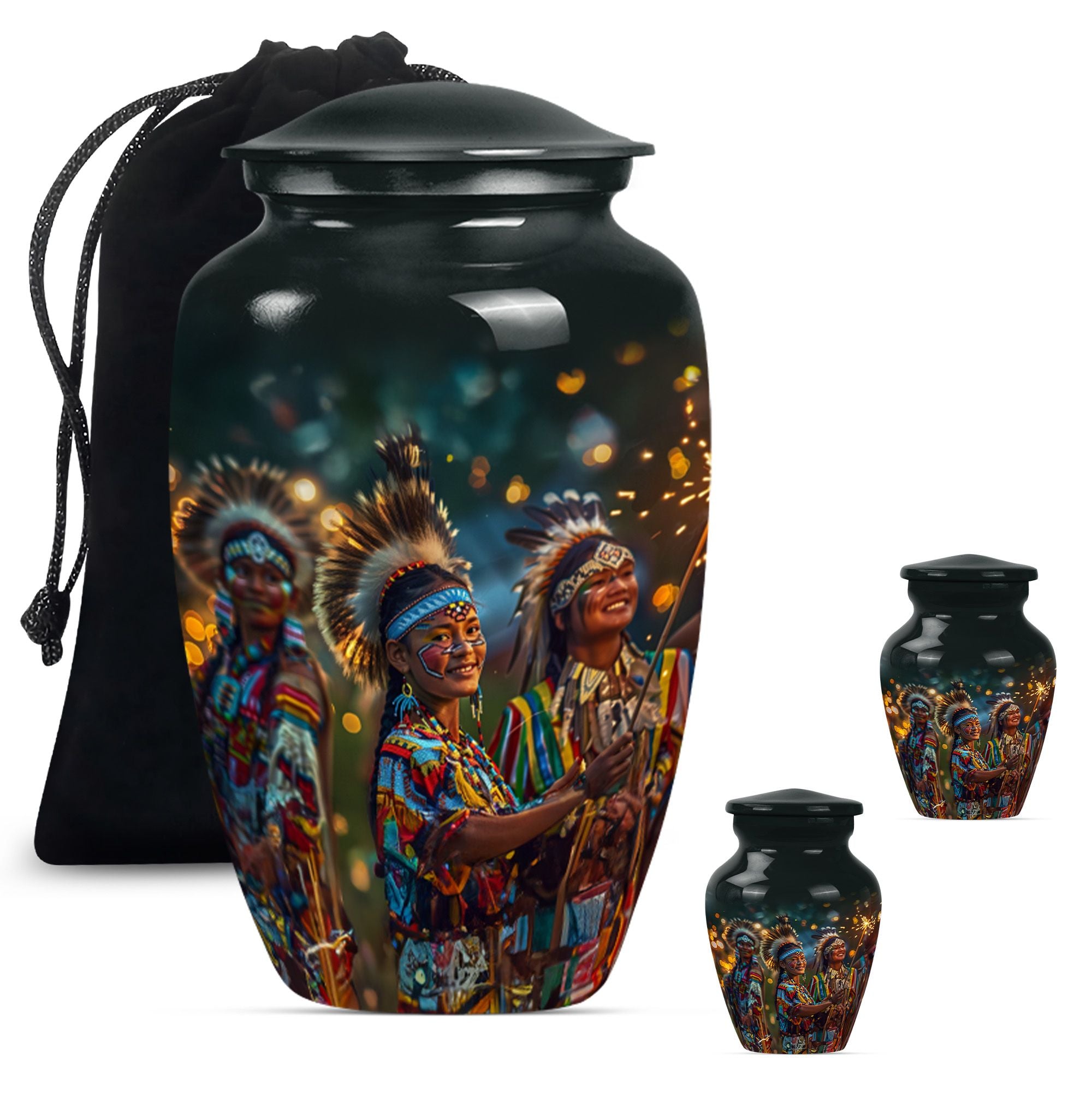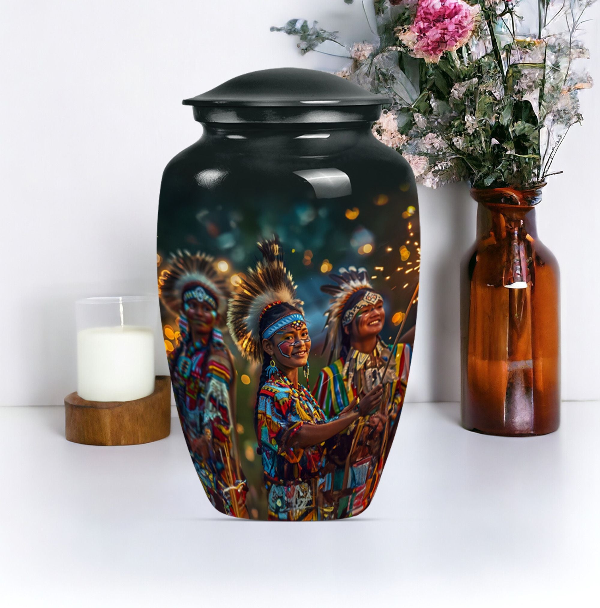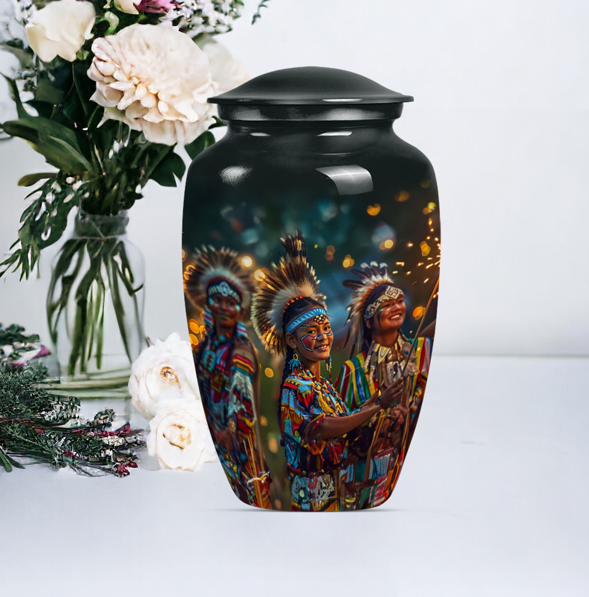 Immerse yourself in the wistful beauty of our Wolf Howling Large Urn, a remarkable tribute to your loved one's eternal spirit. This tribe Man Urn stands 10 inches tall, showcasing the strength and courage embodied by the poignant theme of a howling wolf. Handcrafted from high-quality Aluminum, the urn displays both durability and exceptional artistry. With a capacity of 200 cubic inches, it is perfectly suited as a cremation urn or a memorial burial urn, serving as a unique vessel to store your loved one's ashes. At a weight of 3.3 pounds, it is stately without being cumbersome. This urn offers customization options, allowing for personalized engraved names, creating an extra special touch. The package also includes a velvet pouch, perfect for respectfully containing the ashes. Our urn is more than just a funeral urn; it is a unique commemoration of your loved one, with a design that speaks volumes of their undying spirit. Whether you're after funeral urns for adult ashes or cremation urns for humans, our Wolf Howling Large Urn offers a distinct choice.