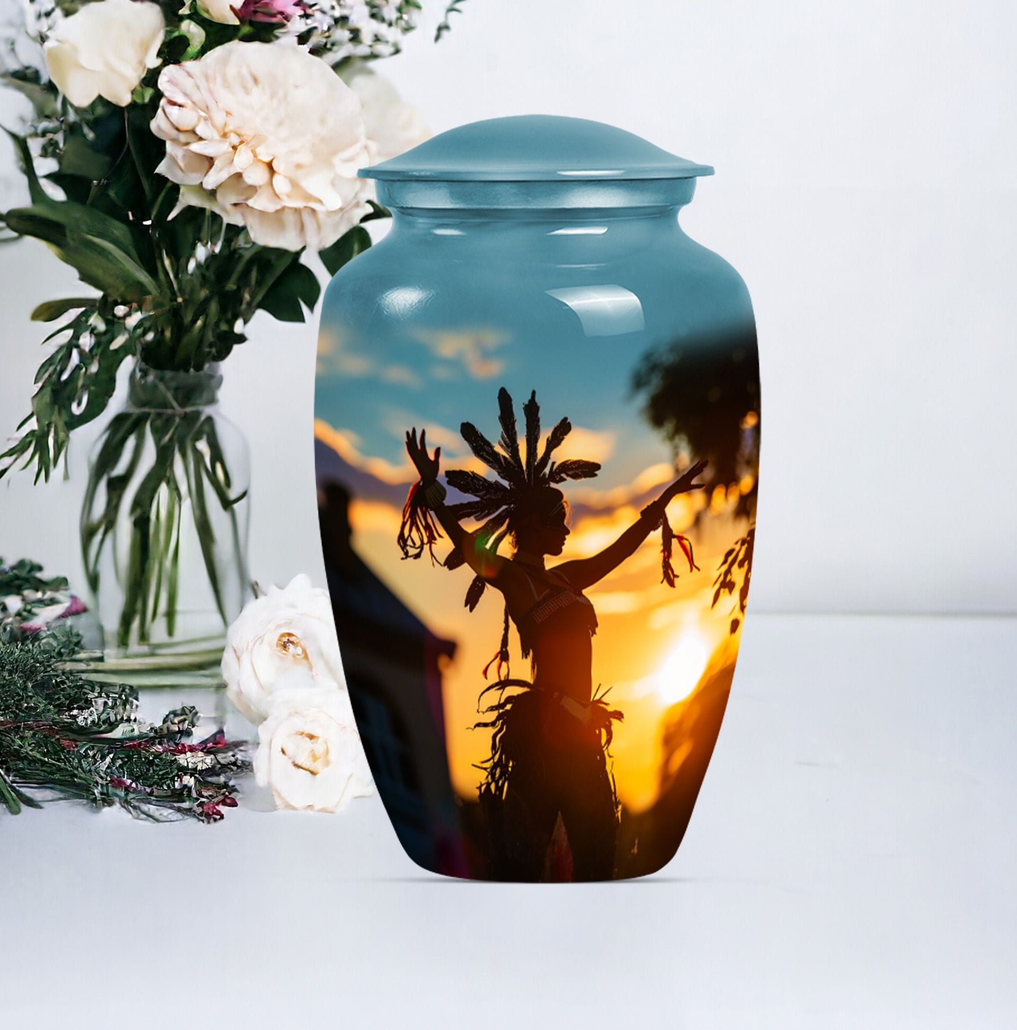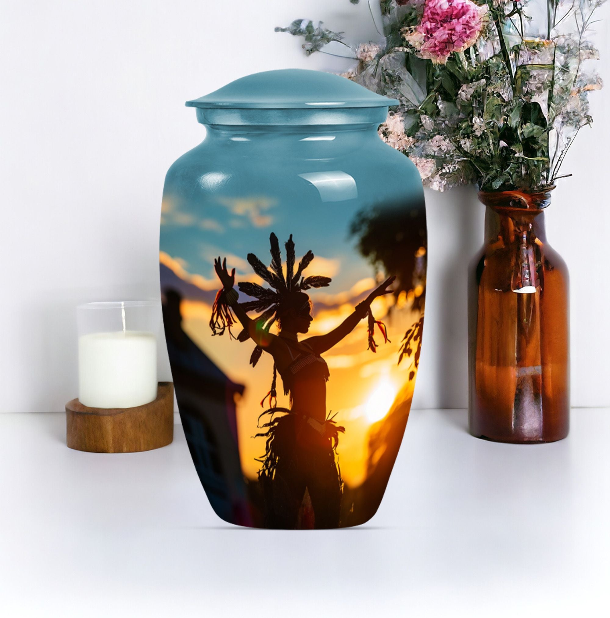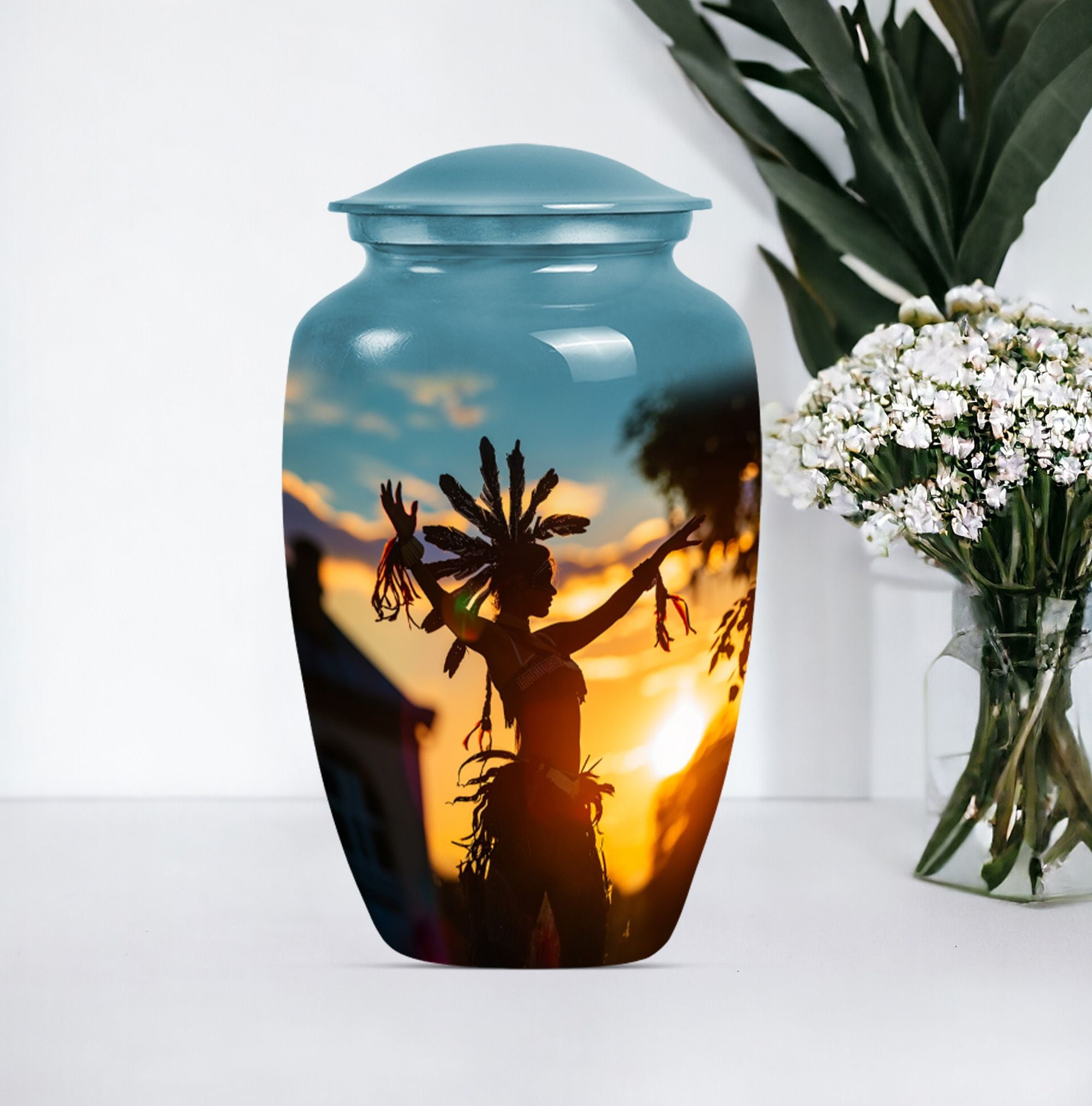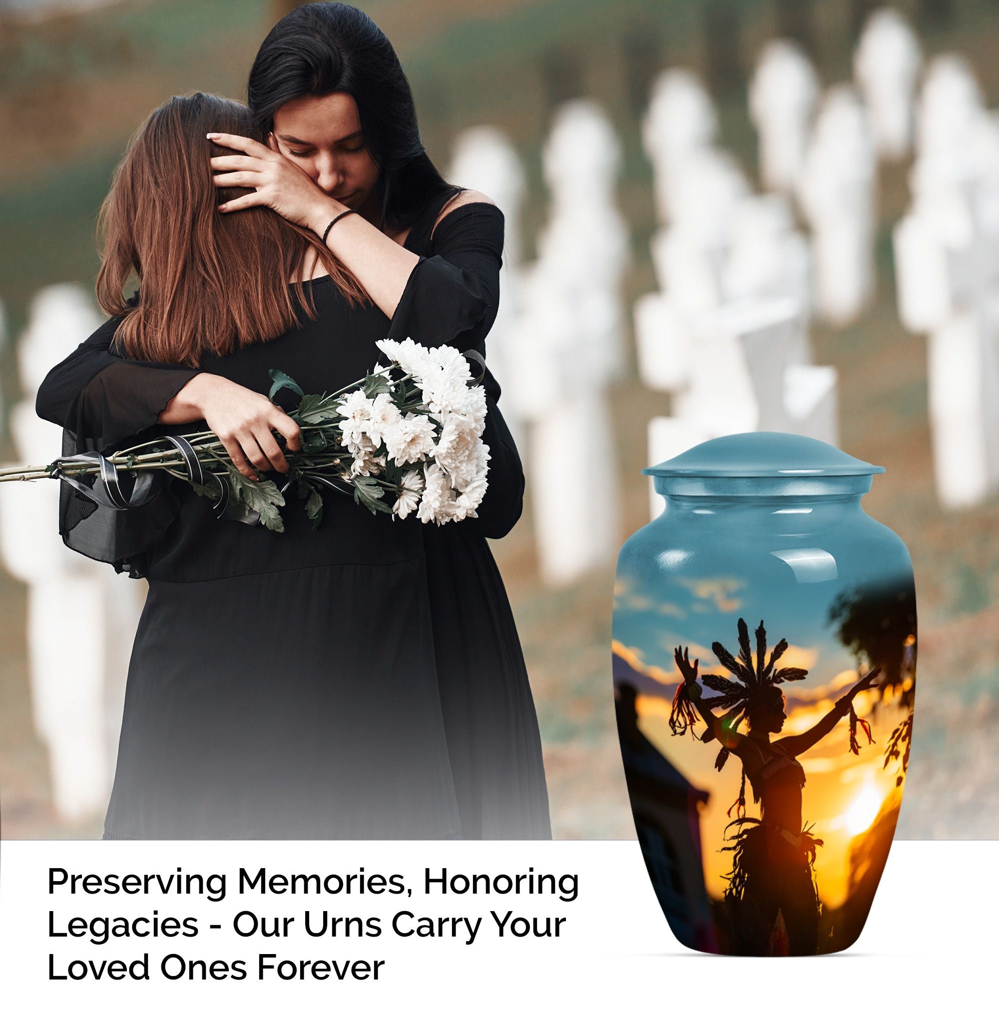 Immerse yourself in an eternal homage with our exquisite 'Tribe Man Urn,' an emblem of solemn respect and a reassuring symbol of everlasting love. A superior large funeral urn for men ashes, meticulously designed to evoke a spiritual connection, this impressive piece stands at a commanding 10 inches tall. Crafted with utmost precision from resilient and lustrous aluminium, it demonstrates a serious attention to detail and longevity unlike any other. The endearing 'Wolf Howling' theme transcends the physical and resonates with the spirit, making it a cherished piece for seniors and adults alike. This cherishable cremation urn comes with a velvet pouch meant to securely contain the ashes. Elegant in its simplicity, the classic urn design pairs well with varying decors and fixtures. It boasts a substantial capacity of 200 cubic inches, accommodating substantial or minute ash quantities with ease. Infuse a touch of personality into the urn by personalizing it with engraved names speaking volumes of your affection. This tribe man urn is more than an urn - it's an enduring testament of love and respect, creating an emotional and physical sanctuary for your loved ones. Supplement your collection of adult urns for ashes with this extraordinary piece and anchor yourself in the peaceful and soothing memories it inspires.